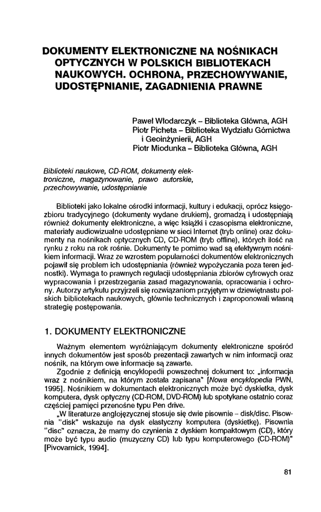 DOKUMENTY ELEKTRONICZNE NA NOŚNIKACH OPTYCZNYCH W POLSKICH BIBLIOTEKACH NAUKOWYCH. OCHRONA, PRZECHOWYWANIE, UDOSTĘPNIANIE, ZAGADNIENIA PRAWNE Paweł Włodarczyk - Biblioteka Główna, AGH Piotr Picheta - Biblioteka Wydziału Górnictwa i Geoinżynierii, AGH Piotr Miodunka - Biblioteka Główna, AGH Biblioteki naukowe, CD-ROM, dokumenty elek troniczne, magazynowanie, prawo autorskie, przechowywanie, udostępnianie Biblioteki jako lokalne ośrodki informacji, kultury i edukacji, oprócz księgo zbioru tradycyjnego (dokumenty wydane drukiem), gromadzą i udostępniają również dokumenty elektroniczne, a więc książki i czasopisma elektroniczne, materiały audiowizualne udostępniane w sieci Internet (tryb online) oraz doku menty na nośnikach optycznych CD, CD-ROM (tryb offline), których ilość na rynku z roku na rok rośnie. Dokumenty te pomimo wad są efektywnym nośni kiem informacji. Wraz ze wzrostem popularności dokumentów elektronicznych pojawił się problem ich udostępniania (również wypożyczania poza teren jed nostki). Wymaga to prawnych regulacji udostępniania zbiorów cyfrowych oraz wypracowania i przestrzegania zasad magazynowania, opracowania i ochro ny. Autorzy artykułu przyjrzeli się rozwiązaniom przyjętym w dziewiętnastu pol skich bibliotekach naukowych, głównie technicznych i zaproponowali własną strategię postępowania. 1. DOKUMENTY ELEKTRONICZNE Ważnym elementem wyróżniającym dokumenty elektroniczne spośród innych dokumentów jest sposób prezentacji zawartych w nim informacji oraz nośnik, na którym owe informacje są zawarte. Zgodnie z definicją encyklopedii powszechnej dokument to: „informacja wraz z nośnikiem, na którym została zapisana" [Nowa encyklopedia PWN, 1995]. Nośnikiem w dokumentach elektronicznych może być dyskietka, dysk komputera, dysk optyczny (CD-ROM, DVD-ROM) lub spotykane ostatnio coraz częściej pamięci przenośne typu Pen drive. „W literaturze anglojęzycznej stosuje się dwie pisownie - disk/disc. Pisow nia ’’disk” wskazuje na dysk elastyczny komputera (dyskietkę). Pisownia ’’disc” oznacza, że mamy do czynienia z dyskiem kompaktowym (CD), który może być typu audio (muzyczny CD) lub typu komputerowego (CD-ROM)” [Pivovarnick, 1994]. 81 Informacje zawarte w dokumentach elektronicznych mogą występować pod wieloma postaciami, w formie tekstowej lub multimedialnej, przy czym, „słowo multimedia oznaczać będzie bogate aplikacje z jednolicie połączonym tekstem, grafiką, dźwiękiem, animacją i w pełni ruchomym obrazem” [Parker, 1993]. W nauce o informacji funkcjonuje również pojęcie systemu multimedialne go, rozumianego jako kombinacja wielu źródeł informacji, które oprócz tekstu, grafiki i dźwięku mogą zawierać również wykresy statystyczne, tabele i grafikę komputerową [Brusilovsky, 1994]. Taka kompilacja źródeł informacji oznacza nie tylko połączenie, ale również współpracę i współdziałanie zawartych w sys temie mediów, co wyróżnia go spośród innych systemów. Dokumenty elektroniczne bardzo często są też dokumentami hiperteksto wymi lub hipermedialnymi, zaopatrzonymi w odsyłacze ułatwiające dostęp do pożądanej informacji. „Odsyłacze zwane linkami występujące na aktualnie przeglądanej stronie (ekranie), zaznaczone są na ogół przez wyróżnienie wyrazu lub wyrazów (wyraźnie różniący się kolor pisma lub podświetlenie). Najechanie myszą na wyróżniony wyraz i kliknięcie powoduje ukazanie się na monitorze strony, do której odsyła link uaktualniony przez kliknięcie” [Daniłowicz, 1998], W doku mentach posiadających aplikacje multimedialne, możliwe jest odesłanie do strony zawierającej przekaz filmowy, animację lub dźwięk, co wzmacnia i wzbogaca przekaz informacyjny. Do powstania dokumentów elektronicznych przyczynił się gwałtowny roz wój urządzeń i technik komputerowych. Dla bibliotek na całym świecie bardzo ważnym był fakt wynalezienia dyskietek, a szczególnie dysków optycznych CD-ROM, które powstały na bazie płyt audio (CD). Dzięki temu możliwe stało się przechowywanie coraz większej ilości informacji na nośnikach, które nie obciążają znacząco kurczących się gwałtownie powierzchni magazynowych. Powstanie pierwszych CD datuje się na rok 1978, kiedy to dwie firmy Phi lips i Sony, złączyły swoje siły w celu stworzenia nowego produktu, który w następnych latach niemal całkowicie wyeliminował gramofony i płyty gra mofonowe [Parker, 1993]. W roku 1982 firmy zgłosiły opracowany wspólnie standard nagrywania, próbkowania i rozmiaru swoich dysków [Bosak, 1995]. Pierwsze CD-ROM pojawiły się niedługo po wprowadzeniu na rynek płyt CD. „Po raz pierwszy pojawił się on w 1984 roku jako produkt komercyjny i bar dzo szybko, bo już w 1988 format zapisu plików na CD-ROM został zatwier dzony międzynarodowym standardem - ISO 9660” [Parker, 1993], Uczyniło to CD-ROM produktem uniwersalnym i gwarantującym możliwość prawidłowego odtwarzania tego dysku na dowolnym napędzie CD-ROM, zainstalowanym na sprzęcie komputerowym zaopatrzonym w różne systemy operacyjne. Technologia CD-ROM niemal od początku znalazła zastosowanie w biblio tekach na całym świecie. Jej zalety doceniono również w Polsce, chociaż biblioteki polskie nie mogły się równać zasobnością finansową z bibliotekami zachodnimi, stąd też pewne opóźnienia we wprowadzaniu tej technologii. Naj większym powodzeniem cieszyły się dyski optyczne w dużych bibliotekach naukowych, gdzie użytkownicy stanowili zwykle grupę najbardziej operatywną i niebojącą się nowinek technicznych. W roku 1988 wydano tylko kilka tuzinów dysków CD-ROM z oprogramo waniem, ale już w 1993 liczba wydanych tytułów wzrosła do ponad trzech tysięcy [Bosak, 1995]. W latach późniejszych coraz większą wagę zaczęto 82 przywiązywać do Internetu i rozwoju technologii sieciowych, przyczyniając się tym samym 