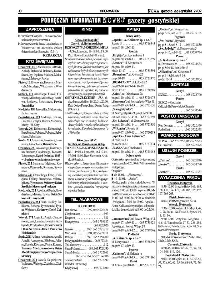 10 INFORMATOR NOWA gazeta gostyñska 2/09 PODRÊCZNY INFORMATOR NOWEJ gazety gostyñskiej ZAPROSZENIA KINO w Burmistrz Gostynia na noworoczne Kino Pod Kopu³¹ niadanie prasowe (9.01.); Gostyñ, ul. Bojanowskiego w Stowarzyszenie Prasy Lokalnej zs. w W¹growcu na regionaln¹ debatê DZIEWCZYNAMOJEGOKUMPLA USA, komedia, 16-19.01., 18:00. dziennikarsk¹ (Szczecin, 17.01.). Re¿. Howard Deutch (101 min.). REDAKCJA Scenariusz opowiada o pewnym mê¿KTO WIÊTUJE czynie zatrudnianym przez porzuconych facetów. Zadaniem bohatera jest Czwartek, 15 I Aleksandra, Alfreda, zabieranie by³ych dziewczyn swych Alfredy, D¹brówki, Dobrawy, Domaklientów na koszmarne randki i tym s³awa, Ity, Izydora, Makara, Makasamym przekonywanie ich, ¿e powinriusza, Makarego, Paw³a ny wróciæ do swych partnerów. Sprawa Pi¹tek, 16 I Honorata, Honoraty, Markomplikuje siê, gdy specjalista od cela, Marcelego, W³odzimiery, W³opowrotów ma spotkaæ siê z dziewdzimierza czyn¹ swego najlepszego kumpla. Sobota, 17 I Antoniego, Flawii, Flawiany, Mi³ochny, Mi³os³awy, Ros³a- OSTATNIE ZLECENIE USA, akcja, dramat, thriller, 16-20.01., 20:00. wa, Ros³awy, Rocis³awa, Paw³a Re¿. Oxide Pang Chun, Danny Pang Pustelnika (99 min.). Niedziela, 18 I Jarope³ka, Ma³gorzaty, Thriller akcji o p³atnym zabójcy, który Piotra, Pryski wykonuj¹c ostatnie swoje zlecenie Poniedzia³ek, 19 I Andrzeja, Erwina, zakochuje siê w niemej kobiecie. Eufemii, Henryka, Heinza, Mariusza, Amerykañski remake tajlandzkiego Marty, Pii, Sary krymina³u Bangkok Dangerous z Wtorek, 20 I Dobrochny, Dobroniegi, 1999 roku. Euzebiusza, Fabiana, Pabiana, Sebastiana, Sebastiany roda, 21 I Agnieszki, Jaros³awa, JaroKino Szarotka Krobia, ul. Powstañców Wlkp. s³awy, Ksenofonta, Dzieñ Babci Czwartek, 22 I Anastazego, Dobromy- TO NIE TAK JAK MYLISZ, KOTs³a, Doriana, Gaudentego, Teodora, KU Polska, komedia, 16 i 17.01., Wincentego, Dzieñ Dziadka, 1863 17:00 i 19:00. Re¿. S³awomir Kryñwybuch powstania styczniowego ski (95 min.). Pi¹tek, 23 I Bertrama, Ildefonsa, Kle- Wielow¹tkowa historia uwik³anych w mensa, Rajmunda, Ramony, Seweniespodziewany splot wydarzeñ uczestriana ników zjazdu lekarzy, który odbywa Sobota, 24 I Chwaliboga, Felicji, Felisiê w ekskluzywnym hotelu nad mocjana, Feliksy, Franciszka, Milany, rzem. Lawina wydarzeñ wci¹ga po Mileny, Tymoteusza, wiatowy Dzieñ kolei wszystkich bohaterów, a sworodków Masowego Przekazu ista parada oszustów wydaje siê Niedziela, 25 I Apolla, Alberta, Bronie mieæ koñca. dzis³awa, Mi³osza, Paw³a, Dzieñ Sekretarki i Asystentki TEL. ALARMOWE Poniedzia³ek, 26 I Pauli, Pauliny, Polikarpa, Roberta, Tymoteusza, TytuPOGOTOWIA sa, Wojs³awa, wiatowy Dzieñ Cel- Ratunkowe. . . . . . . . .999, 065 5720471 nictwa Ciep³ownicze . . . . . . . . . . . . . . 993 Wtorek, 27 I Angeliki, Anieli, Chryzo- Drogowe . . . . . . . . . . . . . . . . 981 stoma, Jana, Leandra, Leandry, Przy- Energetyczne . . . . . . . 065 5739187 byrada, Przybys³awa, Dzieñ Pamiêci 065 5720026 Ofiar Nazizmu - Dzieñ Pamiêci o Gazowe. . . . . . . . . . 992, 065 5721218 Holokaucie Wod.-kan.. . . . . . . . . .994, 065 5721211 roda, 281 I Alfonsa, Amadeusza, Amalii, Policja. . . . . . . . . . .997, 065 5758200 Amelii, Augustyna, Blizbora, Julia- Policyjny telefon zaufania. . . 065 5727864 na, Karola, Kochana, Piotra, Rogera, Tel. alarmowy . . . . . . . . . . . . . .112 Tomasza, Miêdzynarodowy Dzieñ Stra¿ Po¿arna. . . . . . . . 998, 065 5729530 Mobilizacji przeciwko Wojnie Nu- Stra¿ Miejska. . . . . . . . 065 5752163 klearnej 065 5752164, 0-507 154 706 Czwartek, 29 I Józefa, Sulpicjusza, Telefon zaufania . . . . . 065 5727799 Waleriana, Walerego, Zdzis³awa, Zdzi- Orodek Interwencji s³awy Kryzysowej . . . . . . . 065 573900 APTEKI Borek Wlkp. Apteki A. Kalisoras sp. z o.o. Rynek 14 . . . . . . . . . . .065 5716545 pn-pt 8-19, sob 8-13 Gostyñ Hygieja, ul. £¹cznikowa 1 pn-pt 8-20, sob 8-13 . . . 065 5723299 Medica, ul. Mostowa 2a pn-pt 8-20, sob 9-13, niedz. 13-17 . . . . . . . 065 5751594 Remedium, ul. Górna 22 pn-pt 10-18 . . . . . . . 065 5721370 ROM-FARM, ul. £okietka 2 pn-pt 9-20, sob 9-14 i 16-19, niedz. 17-19. . . . . . . . . . 065 5720289 Salus, ul. Olejniczaka 7a pn-pt 8-20, sob 8-13. . . .065 5720173 S³oneczna, ul. Powstañców Wlkp. 45 pn-pt 8-19, sob 8-13. . . . 065 5725555 Starogostyñska, ul. Starogostyñska 9, pn-pt 8-19:30, ost. sob mies. 8-14:30. . 065 5722393 w. £ukasza, ul. Graniczna 6e pn-pt 8-20, sob 8-14 . . . . 065 5723350 W Rynku, Rynek 18 pn-pt 9-17, sob 9-13 . . . . 065 5720218 Apteka Anna Kalisoras, ul. Witosa 13 pn-niedz. 8-22 . . . . . . .065 5723334 NASZA, ul. Graniczna 4 pn-pt 8-20, sob 8-14 . . . 065 5725053 Dy¿ury aptek Gostyñskie apteki pe³ni¹ dy¿ury nocne w godzinach od 20:00 do 7:00 rano dnia nastêpnego. Oto plan: w do 18.01. S³oneczna, w 1925.01. Salus. Medica pe³ni dy¿ur ca³odobowo. W niedziele i wiêta apteka dy¿urna czynna jest od 9:00 do 13:00. Apteka ROMFARM czynna jest w soboty od 9:00 do 14:00 i od 16:00 do 19:00, w niedziele i wiêta od 17:00 do 19:00. Apteka Anna Kalisoras czynna jest od poniedzia³ku do niedzieli od 8:00 do 22:00. Krobia Amaranthus, ul. Powst. Wlkp. 134 pn-pt 9-17, sob 9-13 . . . 065 5738621 Apteka, ul. Powst. Wlkp. 28 pn-pt 9-18, sob 9-12. . . . 065 5738568 Pudliszki A. Kalisoras sp. z o.o. ul. Fabryczna 2 . . . . . . 065 5738799 pn-pt 9-17, sob 9-13 Pêpowo Calamus, ul. Or³onia 1a pn-pt 8-18, sob 9-13. . . . 065 5741166 Piaski ul. Lena, pn-pt 8-18. . . . . 065 5727626 Medica, ul. Warszawska pn-pt 8-19, sob 9-12 . . . . 065 5719105 Pogorzela w. Ducha, Rynek 6 pn-pt 8-18, sob 8-12 . . .065 5734850 w. Jadwigi, ul. Kotkowiaka 5 pn-pt 8-16, sob 8-12. . . . 065 5734734 Poniec A. Kalisoras sp. z o.o. ul. Dworcowa 2b. . . . . . 065 5731534 pn-pt 8:30-18, sob 8:30-13 Milenijna, ul. Kocielna 3 pn-pt 9-18:30, sob 9-16, niedz. 10-14 . . . . . . . . 065 5727804 SZPITALE Gostyñ SPZOZ. . . . . . . . . . . . 065 5726700 Poniec SPZOZ w Gostyniu Oddzia³ d