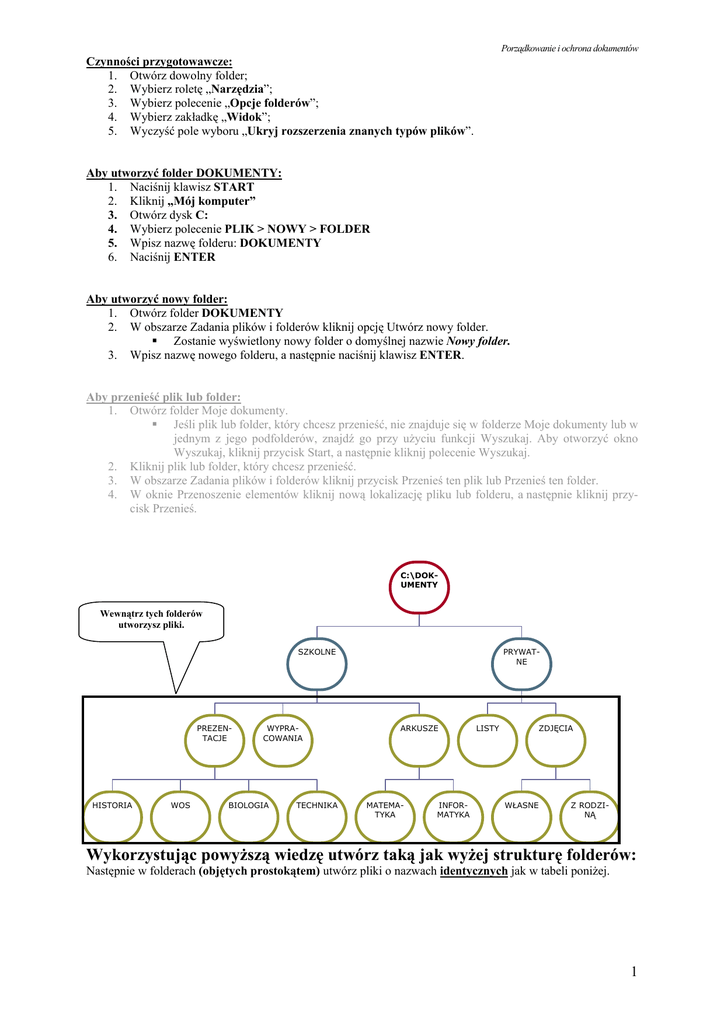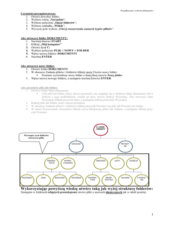 Porządkowanie i ochrona dokumentów Czynności przygotowawcze: 1. Otwórz dowolny folder; 2. Wybierz roletę „Narzędzia”; 3. Wybierz polecenie „Opcje folderów”; 4. Wybierz zakładkę „Widok”; 5. Wyczyść pole wyboru „Ukryj rozszerzenia znanych typów plików”. Aby utworzyć folder DOKUMENTY: 1. Naciśnij klawisz START 2. Kliknij „Mój komputer” 3. Otwórz dysk C: 4. Wybierz polecenie PLIK > NOWY > FOLDER 5. Wpisz nazwę folderu: DOKUMENTY 6. Naciśnij ENTER Aby utworzyć nowy folder: 1. Otwórz folder DOKUMENTY 2. W obszarze Zadania plików i folderów kliknij opcję Utwórz nowy folder. Zostanie wyświetlony nowy folder o domyślnej nazwie Nowy folder. 3. Wpisz nazwę nowego folderu, a następnie naciśnij klawisz ENTER. Aby przenieść plik lub folder: 1. Otwórz folder Moje dokumenty. Jeśli plik lub folder, który chcesz przenieść, nie znajduje się w folderze Moje dokumenty lub w jednym z jego podfolderów, znajdź go przy użyciu funkcji Wyszukaj. Aby otworzyć okno Wyszukaj, kliknij przycisk Start, a następnie kliknij polecenie Wyszukaj. 2. Kliknij plik lub folder, który chcesz przenieść. 3. W obszarze Zadania plików i folderów kliknij przycisk Przenieś ten plik lub Przenieś ten folder. 4. W oknie Przenoszenie elementów kliknij nową lokalizację pliku lub folderu, a następnie kliknij przycisk Przenieś. C:\DOKUMENTY Wewnątrz tych folderów utworzysz pliki. SZKOLNE PREZENTACJE HISTORIA WOS WYPRACOWANIA BIOLOGIA TECHNIKA PRYWATNE ARKUSZE MATEMATYKA INFORMATYKA LISTY ZDJĘCIA WŁASNE Z RODZINĄ Wykorzystując powyższą wiedzę utwórz taką jak wyżej strukturę folderów: Następnie w folderach (objętych prostokątem) utwórz pliki o nazwach identycznych jak w tabeli poniżej. 1 Porządkowanie i ochrona dokumentów C:\DOKUMENTY\SZKOLNE\PREZENTACJE\HISTORIA prezentacja1-historia.ppt prezentacja2-historia.ppt prezentacja3-historia.ppt (Prezentacja programu Microsoft PowerPoint) C:\DOKUMENTY\SZKOLNE\PREZENTACJE\BIOLOGIA prezentacja1-biologia.ppt prezentacja2-biologia.ppt prezentacja3-biologia.ppt (Prezentacja programu Microsoft PowerPoint) C:\DOKUMENTY\SZKOLNE\WYPRACOWANIA dokument1-j-polski.doc dokument2-j-polski.doc dokument3-j-polski.doc (Dokument programu Microsoft Word) C:\DOKUMENTY\SZKOLNE\ARKUSZE\MATEMATYKA arkusz1-matematyka.xls arkusz2-matematyka.xls arkusz3-matematyka.xls (Arkusz programu Microsoft Excel) C:\DOKUMENTY\PRYWATNE\ZDJĘCIA\Z RODZINĄ zdjęcie1-rodzina.jpg (Dowolne zdjęcie lub obraz skopiowany z Internetu) C:\DOKUMENTY\SZKOLNE\PREZENTACJE\WOS prezentacja1-wos.ppt prezentacja2-wos.ppt prezentacja3-wos.ppt (Prezentacja programu Microsoft PowerPoint) C:\DOKUMENTY\SZKOLNE\PREZENTACJE\TECHNIKA prezentacja1-technika.ppt prezentacja2-technika.ppt prezentacja3-technika.ppt (Prezentacja programu Microsoft PowerPoint) C:\DOKUMENTY\PRYWATNE\LISTY list1.doc list2.doc list3.doc (Dokument programu Microsoft Word) C:\DOKUMENTY\SZKOLNE\ARKUSZE\INFORMATYKA arkusz1-informatyka.xls arkusz2-informatyka.xls arkusz3-informatyka.xls (Arkusz programu Microsoft Excel) C:\DOKUMENTY\PRYWATNE\ZDJĘCIA\WŁASNE zdjęcie1-własne.jpg (Dowolne zdjęcie lub obraz skopiowany z Internetu) Teraz każdy z tych plików wypełnij dowolnymi danymi (lub pozostaw pusty) i zapisz zmiany przed zamknięciem. 2