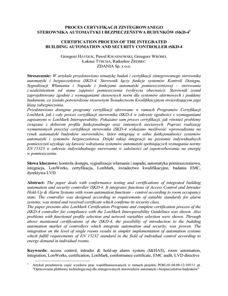 PROCES CERTYFIKACJI ZINTEGROWANEGO STEROWNIKA AUTOMATYKI I BEZPIECZEŃSTWA BUDYNKÓW ISKD-41 CERTIFICATION PROCESS OF THE INTEGRATED BUILDING AUTOMATION AND SECURITY CONTROLLER ISKD-4 Grzegorz HAYDUK, Paweł KWASNOWSKI, Grzegorz WRÓBEL Łukasz TYRCHA, Radosław ŹREBIEC ZDANIA Sp. z o.o. Streszczenie: W artykule przedstawiono tematykę badań i certyfikacji zintegrowanego sterownika automatyki i bezpieczeństwa iSKD-4. Sterownik łączy funkcje systemów Kontroli Dostępu, Sygnalizacji Włamania i Napadu z funkcjami automatyki pomieszczeniowej – sterowania z uzależnieniem od stanu zajętości pomieszczenia (wykrycia obecności). Sterownik został zaprojektowany zgodnie z wymaganiami stosownych norm dla systemów alarmowych i poddany badaniom, co zostało potwierdzone stosownym Świadectwem Kwalifikacyjnym stwierdzającym jego klasę zabezpieczenia. Przedstawiono dostępne programy certyfikacji oferowane w ramach Programów Certyfikacji LonMark, jak i cały proces certyfikacji sterownika iSKD-4 w zakresie zgodności z wymaganiami zapisanymi w LonMark Interoperability. Pokazano sam proces certyfikacji, jak również problemy związane z doborem profilu funkcjonalnego oraz zmiennych sieciowych. Poprzez realizację wymienionych powyżej certyfikacji sterownika iSKD-4 wykazano możliwość wprowadzenia na rynek automatyki budynków sterowników, które integrują w sobie funkcjonalności systemów automatyki i systemów bezpieczeństwa. Dzięki takiej integracji na poziomie indywidualnych pomieszczeń uzyskuje się łatwość wdrażania systemów automatyki spełniających wymagania normy EN 15323 w zakresie indywidualnego sterowania w zależności od zapotrzebowania na energię w pomieszczeniu. Słowa kluczowe: kontrola dostępu, sygnalizacja włamania i napadu, automatyka pomieszczeniowa, integracja, LonWorks, certyfikacja, LonMark, świadectwo kwalifikacyjne, badania EMC, dyrektywa LVD Abstract: The paper deals with conformance testing and certifications of integrated building automation and security controller iSKD-4. It integrates functions of Access Control and Intruder Hold-Up & Alarm Systems with room automation functions – control according to room occupancy state. The controller was designed according to requirements of suitable standards for alarm systems, was tested and received certificate which confirms its security class. The paper presents also LonMark Certification Programs and complete certification process of the iSKD-4 controller for compliance with the LonMark Interoperability Guidelines was shown. Also problems with functional profile selection and network variables selection were shown. Through above mentioned certifications of the iSKD-4, the possibility of introduction to the building automation market of controllers which integrate automation and security, was proven. The integration on the level of single rooms results in simpler implementation of automation systems which fulfill requirements of EN 15232 standard in the field of individual control according to energy demand in individual rooms. Keywords: access control, intruder & hold-up alarm system (I&HAS), room automation, integration, LonWorks, certification, LonMark, conformance certificate, EMC audit, LVD directive 1 Artykuł przedstawia część wyników prac współfinansowanych w ramach projektu POIG.01.04.00-12-105/11 pt. "Opracowanie platformy technologicznej dla zintegrowanych sterowników automatyki i bezpieczeństwa budynków" 1 WPROWADZENIE Celem dla współczesnych systemów automatyki jest zapewnienie wysokiej efektywności wykorzystania energii i ścisłej kontroli jej wykorzystania, przy jednoczesnym zapewnieniu wymaganego stopnia komfortu. Nie mniej ważną funkcją pełnioną przez te systemy jest zapewnienie bezpieczeństwa użytkowników jak i bezpieczeństwa mienia znajdującego się w budynku, poprzez realizację kontroli dostępu uprawnionych użytkowników do wydzielonych, kontrolowanych stref budynku, jak i systemu alarmowego – systemu sygnalizacji włamania i napadu. Realizacja wszystkich wymienionych funkcji w czasie rzeczywistym i bez sztucznych ograniczeń (np. niekompatybilności struktur danych wynikających ze stosowania różnych zamkniętych protokołów komunikacyjnych i konieczności integracji na poziomie centralek, systemów nadrzędnych, itp.) możliwa jest tylko poprzez integrację tych systemów na poziomie obiektowym, w jednej spójnej sieci sterowania. W artykule zaprezentowano sterownik iSKD-4, zaprojektowany z myślą o zintegrowaniu funkcji kontroli dostępu, sygnalizacji włamania i napadu oraz automatyki pomieszczeniowej. Wszystkie te funkcje zostały zaprojektowane i zrealizowane zgodnie z wymaganiami odpowiednich norm i wytycznych, a sterownik został przebadany i uzyskał stosowne certyfikaty i świadectwa. Sterownik wyposażony jest w interfejs dla sieci LonWorks, stąd jednym z wymagań jest spełnienie stosownych Profili Funkcjonalnych organizacji LonMark. W dalszej części przedstawiono również wytyczne oraz problemy certyfikacji LonMark jak i wymagania związane z systemami alarmowymi zabezpieczenia mienia, również przebadane i pozytywnie spełnione przez sterownik iSKD-4. 2 STEROWNIK AUTOMATYKI I BEZPIECZEŃSTWA ISKD-4 iSKD-4 to sterownik przystosowany do obsługi pojedynczego pomieszczenia w zakresie kontroli dostępu, kontroli obecności i energooszczędnego sterowania oświetleniem oraz sygnalizacji włamania i napadu. Kontrola dostępu obsługuje zarówno przejścia 1-stronne jak i 2-stronne. Funkcjonalność SWiN obsługuje pojedynczą chronioną strefę (np. pojedyncze pomieszczenie, korytarz), z możliwością łączenia grup pomieszczeń w większe strefy podlegające ochronie. Fizyczne wejścia i wyjścia sterownika iSKD-4 zapewniają obsługę pełnego osprzętu przejścia, tzw. APAS (Access Point Actuators and Sensors) w sposób zgodny z wymaganiami normy PN-EN 50133-1. W skład obsługiwanego APAS (osprzętu przejścia) wchodzą: c