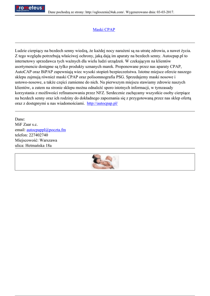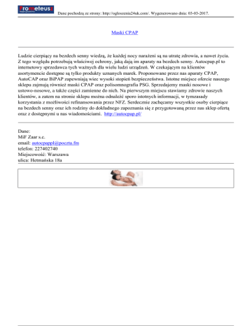 Dane pochodzą ze strony: http://ogloszenia24uk.com/. Wygenerowano dnia: 03-03-2017. Maski CPAP Ludzie cierpiący na bezdech senny wiedzą, że każdej nocy narażeni są na utratę zdrowia, a nawet życia. Z tego względu potrzebują właściwej ochrony, jaką dają im aparaty na bezdech senny. Autocpap.pl to internetowy sprzedawca tych ważnych dla wielu ludzi urządzeń. W czekającym na klientów asortymencie dostępne są tylko produkty uznanych marek. Proponowane przez nas aparaty CPAP, AutoCAP oraz BiPAP zapewniają wiec wysoki stopień bezpieczeństwa. Istotne miejsce ofercie naszego sklepu zajmują również maski CPAP oraz polisomnografia PSG. Sprzedajemy maski nosowe i ustowo-nosowe, a także części zamienne do nich. Na pierwszym miejscu stawiamy zdrowie naszych klientów, a zatem na stronie sklepu można odnaleźć sporo istotnych informacji, w tymzasady korzystania z możliwości refinansowania przez NFZ. Serdecznie zachęcamy wszystkie osoby cierpiące na bezdech senny oraz ich rodziny do dokładnego zapoznania się z przygotowaną przez nas sklep ofertą oraz z dostępnymi u nas wiadomościami. http://autocpap.pl/ Dane: MiF Zaar s.c. email: [email protected] telefon: 227402740 Miejscowość: Warszawa ulica: Hetmańska 18a