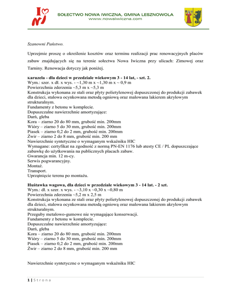 SOŁECTWO NOWA IWICZNA, GMINA LESZNOWOLA www.nowaiwiczna.com Szanowni Państwo. Uprzejmie proszę o określenie kosztów oraz terminu realizacji prac renowacyjnych placów zabaw znajdujących się na terenie sołectwa Nowa Iwiczna przy ulicach: Zimowej oraz Tarniny. Renowacja dotyczy jak poniżej. Karuzela - dla dzieci w przedziale wiekowym 3 - 14 lat, - szt. 2. Wym.: szer. x dł. x wys. - ~1,30 m x ~1,30 m x ~ 0,9 m Powierzchnia zderzenia ~5,3 m x ~5,3 m Konstrukcja wykonana ze stali oraz płyty polietylenowej dopuszczonej do produkcji zabawek dla dzieci, stalowa ocynkowana metodą ogniową oraz malowana lakierem akrylowym strukturalnym. Fundamenty z betonu w komplecie. Dopuszczalne nawierzchnie amortyzujące: Darń, gleba Kora – ziarno 20 do 80 mm, grubość min. 200mm Wióry – ziarno 5 do 30 mm, grubość min. 200mm Piasek – ziarno 0,2 do 2 mm, grubość min. 200mm Żwir – ziarno 2 do 8 mm, grubość min. 200 mm Nawierzchnie syntetyczne o wymaganym wskaźniku HIC Wymagane: certyfikat na zgodność z normą PN-EN 1176 lub atesty CE / PL dopuszczające zabawkę do użytkowania na publicznych placach zabaw. Gwarancja min. 12 m-cy. Serwis pogwarancyjny. Montaż. Transport. Uprzątnięcie terenu po montażu. Huśtawka wagowa, dla dzieci w przedziale wiekowym 3 - 14 lat. - 2 szt. Wym.: dł. x szer. x wys. - ~3,10 x ~0,30 x ~0,80 m Powierzchnia zderzenia ~5,2 m x 2,5 m Konstrukcja wykonana ze stali oraz płyty polietylenowej dopuszczonej do produkcji zabawek dla dzieci, stalowa ocynkowana metodą ogniową oraz malowana lakierem akrylowym strukturalnym. Przeguby metalowo-gumowe nie wymagające konserwacji. Fundamenty z betonu w komplecie. Dopuszczalne nawierzchnie amortyzujące: Darń, gleba Kora – ziarno 20 do 80 mm, grubość min. 200mm Wióry – ziarno 5 do 30 mm, grubość min. 200mm Piasek – ziarno 0,2 do 2 mm, grubość min. 200mm Żwir – ziarno 2 do 8 mm, grubość min. 200 mm Nawierzchnie syntetyczne o wymaganym wskaźniku HIC 1|Strona SOŁECTWO NOWA IWICZNA, GMINA LESZNOWOLA www.nowaiwiczna.com Wymagane: certyfikat na zgodność z normą PN-EN 1176 lub atesty CE / PL dopuszczające zabawkę do użytkowania na publicznych placach zabaw. Gwarancja min. 12 m-cy. Serwis pogwarancyjny. Montaż. Transport. Uprzątnięcie terenu po montażu. Huśtawka dwuosobowa, standardowa na czterech nogach – szt. 2. Wym.: dł. x szer. x wys. - ~2,80 x ~2,10 x ~2,00 m Powierzchnia zderzenia ~7,0 m x ~3,0 m Konstrukcja urządzenia z profili stalowych. Zawieszenie huśtawki wykonano z łańcucha chromowego, na tulejach teflonowych i elementach chromowych. Gumowane siedziska huśtawki zbrojone na profilach aluminiowych. Konstrukcja urządzenia ocynkowana metodą ogniową i malowana lakierem akrylowym, strukturalnym. Fundamenty z betonu w komplecie. Dopuszczalne nawierzchnie amortyzujące: Darń, gleba Kora – ziarno 20 do 80 mm, grubość min. 200mm Wióry – ziarno 5 do 30 mm, grubość min. 200mm Piasek – ziarno 0,2 do 2 mm, grubość min. 200mm Żwir – ziarno 2 do 8 mm, grubość min. 200 mm Nawierzchnie syntetyczne o wymaganym wskaźniku HIC Wymagane: certyfikat na zgodność z normą PN-EN 1176 lub atesty CE / PL dopuszczające zabawkę do użytkowania na publicznych placach zabaw. Gwarancja min. 12 m-cy. Serwis pogwarancyjny. Montaż. Transport. Wywóz zdemontowanych. Uprzątnięcie terenu po montażu. Bujak na sprężynie z uchwytem na dwie dłonie – szt. 1 Wym.: dł. x szer. x wys. - ~0,90 x ~0,25 x ~0,90 m Powierzchnia zderzenia ~3,6,0 m x ~3,0 m Konstrukcja urządzenia ze stali i płyty polietylenowej HD. Konstrukcja urządzenia ocynkowana metodą ogniową i malowana lakierem akrylowym, strukturalnym. Fundamenty z betonu w komplecie. Dopuszczalne nawierzchnie amortyzujące: Darń, gleba Kora – ziarno 20 do 80 mm, grubość min. 200mm Wióry – ziarno 5 do 30 mm, grubość min. 200mm Piasek – ziarno 0,2 do 2 mm, grubość min. 200mm Żwir – ziarno 2 do 8 mm, grubość min. 200 mm Nawierzchnie syntetyczne o wymaganym wskaźniku HIC 2|Strona SOŁECTWO NOWA IWICZNA, GMINA LESZNOWOLA www.nowaiwiczna.com Wymagane: certyfikat na zgodność z normą PN-EN 1176 lub atesty CE / PL dopuszczające zabawkę do użytkowania na publicznych placach zabaw. Gwarancja min. 12 m-cy. Serwis pogwarancyjny. Montaż. Transport. Uprzątnięcie terenu po montażu. Z poważaniem 3|Strona