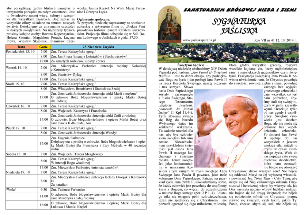 aby porządkując groby bliskich pamiętać o utrzymaniu porządku na całym cmentarzu. Jest to świadectwo naszej wiary, kultury i szacunku dla wszystkich zmarłych. Bóg zapłać za wszystkie ofiary składane na remont naszych świątyń. Dziękujemy za utrzymanie czystości w naszych świątyniach. Na najbliższy tydzień prosimy kolejne osoby: Bożena Koperstyńska, Helena Skomiał, Magdalena Porada, Lucyna Plewa, Wiesław Skubiński, Stanisław CzerData Poniedziałek 13. 10 Wtorek 14. 10 Środa 15. 10 Czwartek 16. 10 Piątek 17. 10 Sobota 18. 10 Niedziela 19. 10 /Wola/ wonka, Janina Krężel. Na Woli: Maria Farbaniec i Grażyna Łątka. Sanktuarium Królowej Nieba i Ziemi Ogłoszenie społeczne; W przyszłą niedzielę zapraszamy na spotkanie autorskie z reżyserem filmu pt. „Piękna Pani prawdziwa historia” panem Rafałem Gużkowskim. Projekcja filmu odbędzie się w Sali Domu Ludowego w Jaśliskach o godz. 17.30. SYGNATURKA JAŚLISKA Godz. 28 Niedziela Zwykła 7:00 Zm. Teresa Kniażyńska /greg./ 8:00 Zm. Jan Pitera /intencja Leśniaków i Stachowiczów/ 17:00 Za zmarłych rodziców, siostry i braci Zm. Mieczysław Farbaniec /intencja rodziny Kołodziej 7:00 z Komańczy/ 8:00 Zm. Stanisław Dyląg 17:00 Zm. Teresa Kniażyńska /greg./ 7:00 Zm. Teresa Kniażyńska /greg./ 8:00 Zm. Władysław, Bronisława i Stanisława Szałaj Zm. Genowefa Janiszewska /intencja córki Marii z mężem/ 17:00 O zdrowie Boże błogosławieństwo i opiekę Matki Bożej dla Jadwigi 7:00 Zm. Teresa Kniażyńska /greg./ 8:00 Zm. Wojciech, Katarzyna i Franciszka Zm. Genowefa Janiszewska /intencja córki Zofii z rodziną/ 17:00 O zdrowie, Boże błogosławieństwo i opiekę Matki Bożej oraz Jana Pawła II dla małej Ani 7:00 Zm. Teresa Kniażyńska /greg./ 8:00 Zm. Genowefa Janiszewska /intencja Wandy/ Zm. Eugenia Farbaniec Dziękczynna z prośbą o zdrowie, Boże błogosławieństwo i opie17:00 kę Matki Bożej dla Franciszka i Ewy Madyda w 40 rocznicę ślubu 7:00 Zm. Wojciech i Teresa Mezglewscy Zm. Teresa Kniażyńska /greg./ 8:00 W intencji Bogu wiadomej 17:00 Zm. Mieczysław Farbaniec /intencja wnuków/ 7:00 Zm. Teresa Kniażyńska /greg./ Zm. Mieczysław Farbaniec /intencja Heleny Dwojak z Klimków8:00 ki Za parafian 9:30 Zm. Tadeusz Farbaniec O zdrowie, Boże błogosławieństwo i opiekę Matki Bożej dla 11:00 Jana Murdzyka i całej rodziny O zdrowie, Boże błogosławieństwo i opiekę Matki Bożej dla 16:00 Łukasza i Moniki Krężel www.jasliskaparafia.pl Świętymi bądźcie… W dzisiejszą niedzielę obchodzimy XIV Dzień Papieski pod hasłem: „Jan Paweł II- Świętymi Bądźcie”. Jest to dobra okazja, aby podziękować Bogu za życie i dar posługi Jana Pawła II na rzecz Kościoła Świętego, naszej ojczyzny i nas samych. Słowa hasła Dnia Papieskiego zostały zaczerpnięte z Pisma Świętego, Starego Testamentu; „Bądźcie świętymi, ponieważ Ja jestem święty” (1 Kpł 11,44). Tymi słowami zwraca się Bóg do Narodu Wybranego dając im konkretne wskazania. To zadanie również dla nas, aby być człowiekiem świętym lub nim zostać. Niezachwianym przykładem świętości jest osoba Jana Pawła II naszego kochanego i świętego rodaka. Temat świętości, jako fundamentalny w nauczaniu Kościoła i tym samym w myśli świętego Ojca Świętego Jana Pawła II powraca, jako treść kolejnego Dnia Papieskiego. Patrząc na przykład życia Jana Pawła II, uświadamiamy sobie, że każdy człowiek jest powołany do wspólnoty życia z Bogiem, co więcej, do uczestniczenia w naturze Boga samego (por. 2 P 1, 4). I dlatego nikt nie osiągnie pełni człowieczeństwa, jeżeli nie zjednoczy się z Chrystusem i nie pozwoli ogarnąć się Jego miłosierną miłością, Rok VII nr 41 12. 10. 2014 r. która gładzi wszystkie grzechy, rozrywa wszelkie kajdany zła, leczy najboleśniejsze rany, a największych grzeszników czyni świętymi. Fascynacja świętością Jana Pawła II powinna uświadomić nam, że Chrystus powołuje do świętości również ciebie i mnie, powołuje każdego bez wyjątku grzesznego człowieka i daje wszystko, co jest nam potrzebne, abyśmy stali się świętymi, czyli w pełni szczęśliwymi. Oczekuje tylko od nas zgody i współpracy. Świętość człowieka jest dziełem Boga, ale nie może się dokonać bez współdziałania człowieka. Po śmierci Jan Paweł II apeluje do nas wszystkich z jeszcze większą siłą, aniżeli to czynił w czasie ziemskiego życia. Woła do nas poprzez całe swoje duchowe dziedzictwo, które nam zostawił: nie bójcie się otworzyć Chrystusowi drzwi waszych serc! Nie bójcie się oddawać Maryi na Jej wyłączną własność, i powtarzać Jej: Totus Tuus - Cały Twój, aby uczyć się od Niej całkowitego oddania Chrystusowi i heroicznej wiary, by wierzyć tak, jak Ona wierzyła nadziei wbrew ludzkiej nadziei; nie bójcie się iść drogą świętości; nie bójcie się codziennie mówić do Chrystusa: pragnę stawać się świętym, czyli takim, jakim Ty, Panie, chcesz, abym się stał; nie bójcie się codziennie iść za Chrystusem drogą przykazań i Ewangelii, drogą wiary, która działa przez miłość; nie bójcie się całkowicie ufać Chrystusowi, który do końca nas umiłował, biorąc na siebie nasze grzechy, aby je zgładzić w swojej śmierci i zmartwychwstaniu; nie bójcie się wyznawać Chrystusowi swoje grzechy w sakramencie pokuty i ufać w Jego nieskończone miłosierdzie. Jan Paweł II uświadamia nam, że świętość to zjednoczenie z Chrystusem, wszczepienie w Chrystusa, tak, jak wszczepienie latorośli do winnego krzewu: "Ja jestem krzewem winnym - mówi Jezus - wy - latoroślami. Kto trwa we Mnie, a Ja w nim, ten przynosi owoc obfity, ponieważ beze Mnie nic nie możecie uczynić" (J 15, 5). Wszczepienie w Chrystusa sprawia, że człowiek uczestniczy w życiu i miłości samego Boga, a więc osiąga pełnię człowieczeństwa, całkowicie realizuje siebie, gdyż Chrystus dopełnia w nim dzieła s