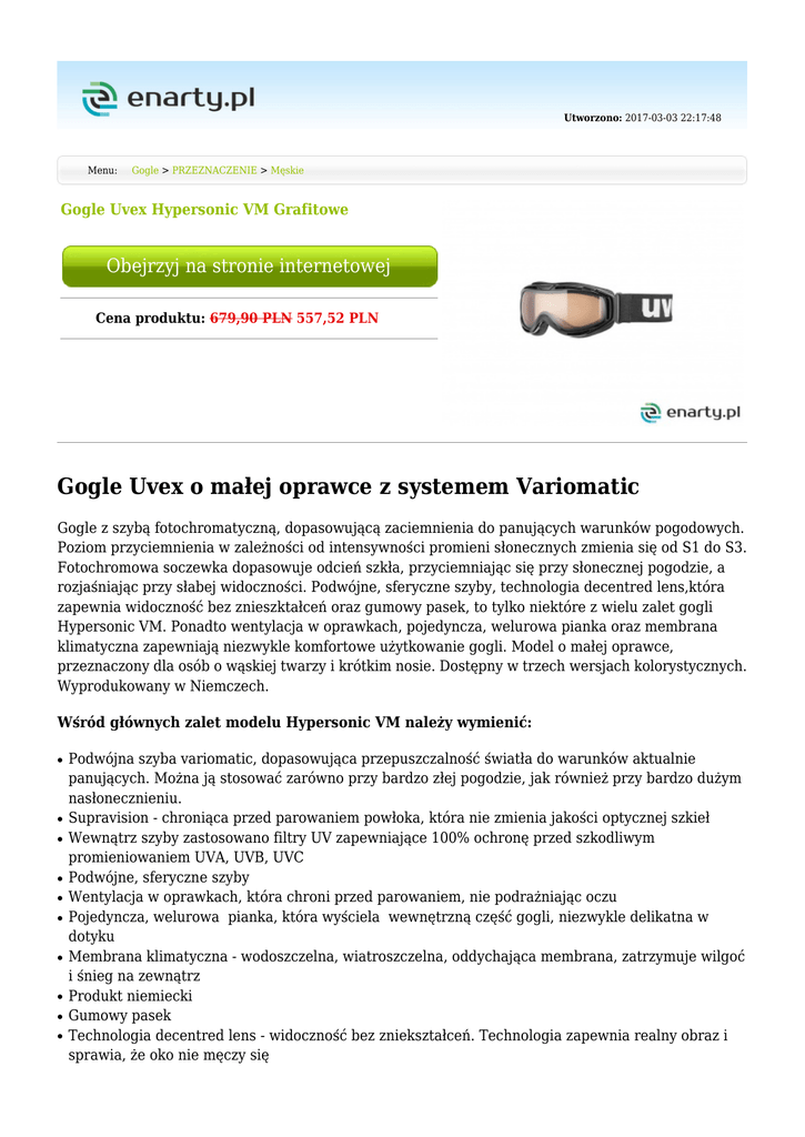 Utworzono: 2017-03-03 22:17:48 Menu: Gogle > PRZEZNACZENIE > Męskie Gogle Uvex Hypersonic VM Grafitowe Obejrzyj na stronie internetowej Cena produktu: 679,90 PLN 557,52 PLN Gogle Uvex o małej oprawce z systemem Variomatic Gogle z szybą fotochromatyczną, dopasowującą zaciemnienia do panujących warunków pogodowych. Poziom przyciemnienia w zależności od intensywności promieni słonecznych zmienia się od S1 do S3. Fotochromowa soczewka dopasowuje odcień szkła, przyciemniając się przy słonecznej pogodzie, a rozjaśniając przy słabej widoczności. Podwójne, sferyczne szyby, technologia decentred lens,która zapewnia widoczność bez znieszktałceń oraz gumowy pasek, to tylko niektóre z wielu zalet gogli Hypersonic VM. Ponadto wentylacja w oprawkach, pojedyncza, welurowa pianka oraz membrana klimatyczna zapewniają niezwykle komfortowe użytkowanie gogli. Model o małej oprawce, przeznaczony dla osób o wąskiej twarzy i krótkim nosie. Dostępny w trzech wersjach kolorystycznych. Wyprodukowany w Niemczech. Wśród głównych zalet modelu Hypersonic VM należy wymienić: ● ● ● ● ● ● ● ● ● ● Podwójna szyba variomatic, dopasowująca przepuszczalność światła do warunków aktualnie panujących. Można ją stosować zarówno przy bardzo złej pogodzie, jak również przy bardzo dużym nasłonecznieniu. Supravision - chroniąca przed parowaniem powłoka, która nie zmienia jakości optycznej szkieł Wewnątrz szyby zastosowano filtry UV zapewniające 100% ochronę przed szkodliwym promieniowaniem UVA, UVB, UVC Podwójne, sferyczne szyby Wentylacja w oprawkach, która chroni przed parowaniem, nie podrażniając oczu Pojedyncza, welurowa pianka, która wyściela wewnętrzną część gogli, niezwykle delikatna w dotyku Membrana klimatyczna - wodoszczelna, wiatroszczelna, oddychająca membrana, zatrzymuje wilgoć i śnieg na zewnątrz Produkt niemiecki Gumowy pasek Technologia decentred lens - widoczność bez zniekształceń. Technologia zapewnia realny obraz i sprawia, że oko nie męczy się ● Szyba S1-S3: variomatic®/ clear Gogle w rozmiarze S30 - idealne dla osób o wąskiej twarzy oraz krótkim nosie. Producent Uvex Przeznaczenie Ochrona UV Męskie, Damskie S1, S2, S3 Rodzaj Snowboardowe, Narciarskie Kolor Grafitowy_#333333 Adres: www.erowery.pl [email protected] Adres: www.enarty.pl Telefon: 605 515 185, 34 361 16 71 Email: [email protected] Email: