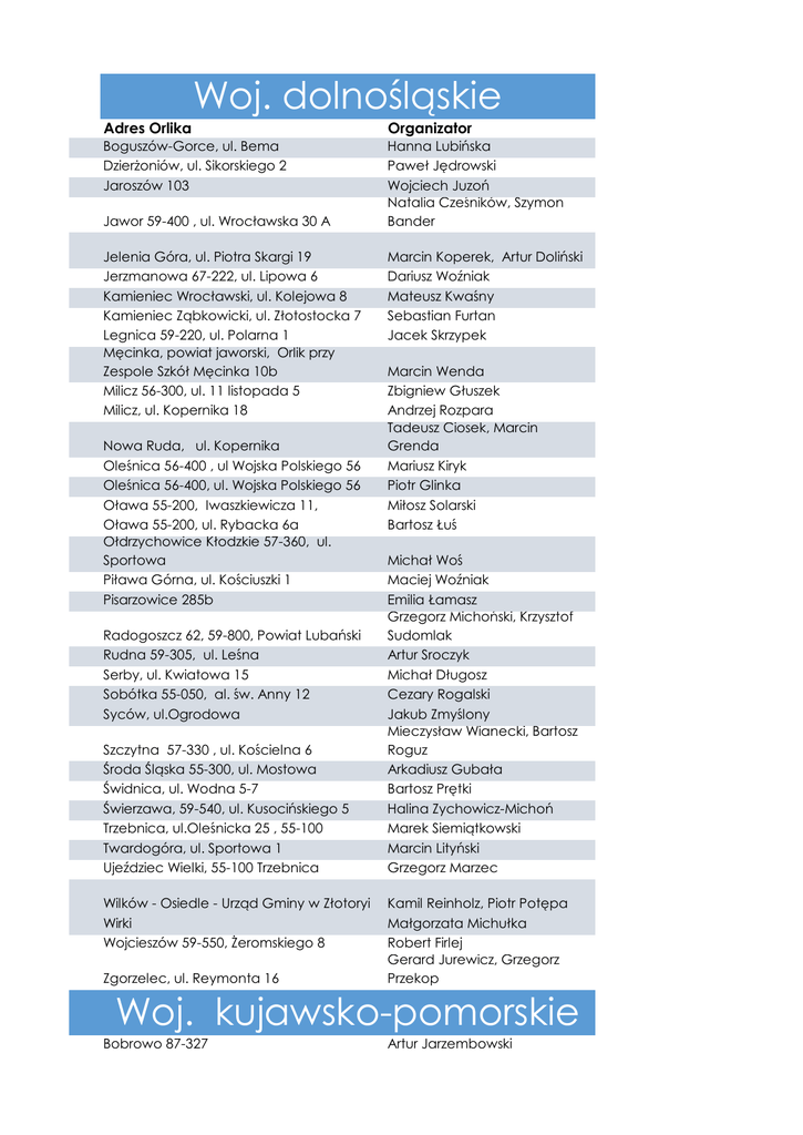Woj. dolnośląskie Adres Orlika Organizator Boguszów-Gorce, ul. Bema Dzierżoniów, ul. Sikorskiego 2 Jaroszów 103 Hanna Lubińska Paweł Jędrowski Wojciech Juzoń Natalia Cześników, Szymon Bander Jawor 59-400 , ul. Wrocławska 30 A Jelenia Góra, ul. Piotra Skargi 19 Jerzmanowa 67-222, ul. Lipowa 6 Kamieniec Wrocławski, ul. Kolejowa 8 Kamieniec Ząbkowicki, ul. Złotostocka 7 Legnica 59-220, ul. Polarna 1 Męcinka, powiat jaworski, Orlik przy Zespole Szkół Męcinka 10b Milicz 56-300, ul. 11 listopada 5 Milicz, ul. Kopernika 18 Nowa Ruda, ul. Kopernika Oleśnica 56-400 , ul Wojska Polskiego 56 Oleśnica 56-400, ul. Wojska Polskiego 56 Oława 55-200, Iwaszkiewicza 11, Oława 55-200, ul. Rybacka 6a Ołdrzychowice Kłodzkie 57-360, ul. Sportowa Piława Górna, ul. Kościuszki 1 Pisarzowice 285b Radogoszcz 62, 59-800, Powiat Lubański Rudna 59-305, ul. Leśna Serby, ul. Kwiatowa 15 Sobótka 55-050, al. św. Anny 12 Syców, ul.Ogrodowa Szczytna 57-330 , ul. Kościelna 6 Środa Śląska 55-300, ul. Mostowa Świdnica, ul. Wodna 5-7 Świerzawa, 59-540, ul. Kusocińskiego 5 Trzebnica, ul.Oleśnicka 25 , 55-100 Twardogóra, ul. Sportowa 1 Ujeździec Wielki, 55-100 Trzebnica Wilków - Osiedle - Urząd Gminy w Złotoryi Wirki Wojcieszów 59-550, Żeromskiego 8 Zgorzelec, ul. Reymonta 16 Marcin Koperek, Artur Doliński Dariusz Woźniak Mateusz Kwaśny Sebastian Furtan Jacek Skrzypek Marcin Wenda Zbigniew Głuszek Andrzej Rozpara Tadeusz Ciosek, Marcin Grenda Mariusz Kiryk Piotr Glinka Miłosz Solarski Bartosz Łuś Michał Woś Maciej Woźniak Emilia Łamasz Grzegorz Michoński, Krzysztof Sudomlak Artur Sroczyk Michał Długosz Cezary Rogalski Jakub Zmyślony Mieczysław Wianecki, Bartosz Roguz Arkadiusz Gubała Bartosz Prętki Halina Zychowicz-Michoń Marek Siemiątkowski Marcin Lityński Grzegorz Marzec Kamil Reinholz, Piotr Potępa Małgorzata Michułka Robert Firlej Gerard Jurewicz, Grzegorz Przekop Woj. kujawsko-pomorskie Bobrowo 87-327 Artur Jarzembowski Brześć Kujawski, ul.Hanki Sawickiej 21 Mirosław Jabłoński Brzozie 50 Jarosław Roszkowski Bydgoszcz, Pijarów 4 Jacek Jenziołowski Bydgoszcz, ul. Goszczyńskiego 3 Bydgoszcz, ul. Hutnicza 89 Daniel Dobrowolski Renata Wądołowska, Monika Molska Dobre 88-210, ul. Szkolna 2b Dawid Dąbrowski Gronowo 128, 87-162 Lubicz Łukasz Rzepiński Grudziądz, ul. Korczaka 23 Rafał Klafta Jeziora Wielkie 104, 88-324 Kowalewo Pomorskie, ul. Chopina 26, 87410 Patryk Maciejewski Kruszwica 88-150, ul. Mickiewicza 11 Dariusz Rozwadowski Jacek Jędrzejczak, Robert Januszek Mrocza, ul. Sportowa Agnieszka Kopeć Nowa Wieś Wielka 86-060, Al. Pokoju Nowe 86-170 , ul. Myśliwca 2b Kamila Karnas Pakość 88-170, ul. Barcińska 7 Pakość, ul. Mogileńska Przybranowo, 87-710 Służewo, gm. Aleksandrów Kujawski Zbigniew Zgubiński Szymon Lewandowski, Mariusz Lewandowski Leszek Adryan, Zbigniew Szubertowski Jarosław Więckowski Przysiersk, Bukowiec 86- 122, ul. Sportowa 1 Patryk Jaje Radomice 115, 87-600 Lipno Szymon Moszczyński Solec Kujawski, ul. Tartaczna 25 Sebastian Mędlewski Solec Kujawski, ul.Słowackiego 4 Daniel Szczepański Świecie 86-105, ul. Al. Jana Pawła II 8 Katarzyna Zalewska Toruń, ul.Hallera 79 Wojciech Tejkowski Toruń, ul. Wojska Polskiego 47a Ewa Trawińska Wielgie 87-603, ul. Szkolna 5 Marlena Szparaga Włocławek 87-800, ZS nr 4, ul. Kaliska 108 Paweł Sobolewski Włocławek, ul. Nowomiejska 25 Włocławek, Zespół Szkół Nr 7, ul. Gniazdowskiego 7 Robert Kacprzak Złotniki Kujawskie, Szosa Bydgoska 35 Mirosław Szulc Żnin, ul. Gnieźnieńska 7 Paweł Adamkiewicz Przemysław Woźniak Województwo lubelskie Bełżyce, ul. Zamkowa 47 Biała Podlaska, ul. Leszczynowa 16 Justyna Giza Elżbieta Maksymiuk, Krystyna Gałecka Czemierniki 21 -306, ul. Kocka 45 Zbigniew Sznura Dęblin, ul. 15-tego Pułku Piechoty "Wilków" 6 Piotr Świtaj, Dawid Osojca Firlej 21-136 , ul Spacerowa 21 Jabłoń 21-205, ul. Jadwigi Tokarskiej 2 Aneta Węgrzyn, Paweł Pawlas Weronika Mostowiec Jarosławiec 190, 22-424 Sitno Rafał Kiecana Lublin, ul. Czwartaków 11 Janusz Olech Lublin, ul. Radzyńska 5 Krzysztof Wąsowski Lublin, ul. Rycerska 9 Mariusz Rzedzicki Lublin, ul. Wajdeloty 1 Artur Aleksandrowicz Lublin, ul. Tumidajskiego 6a Milanów, ul.Marii Konopnickiej 4b Dariusz Pszczelnik Iwona Kuśmierz, Wojciech Antoniewicz Sebastian Magier, Aleksander Szczurowski Mircze Andrzej Lizun Niedrzwica Duża Artur Dobrowolski Ostrówek, gmina Puchaczów Tomasz Pleskot Poniatowa, ul. Szkolna 9 Daniel Piłat, Wojciech Kamiński Puławy, ul. Zabłockiego 8 Bernard Bojek Łabunie, ul. Osieldowa Rudno, ul. Spacerowa 110, 21-140 Michów Piotr Jurecki, Krzysztof Targoński Szczebrzeszyn, ul. XXX-lecia Trzebieszów Drugi 89, 21-404 Trzebieszów Wierzbica, ul. Pogodna 8 22-150 Wierzbica Paweł Sawic Iwona Perczyńska, Jacek Karwowski Jacek Kłos Wierzchowiska Drugie 165 Jerzy Duda Wola Uhruska, ul.Sportowa 1 Zbigniew Walczuk Wólka Dobryńska 57, 21-512 Zalesie Dorota Podgórska Wysokie 23-145, ul. Kościelna 15 Jarosław Oszust Zamość, ul.Wyszyńskiego 4 Henryk Borowik Województwo lubuskie Bytom Odrzański, 67- 115, ul. Kościelna 9 Mariusz Wawrów Gorzów Wlkp., ul. Czereśniowa 4e Edyta Gaca Gorzów Wlkp., ul. Kobylogórska 110 Cezary Król Krosno Odrzańskie, ul. Moniuszki 30 Grzegorz Noga Międzylesie 6 ,66 - 213 Skąpe Adam Serwa, Robert Buła Mirostowice Dolne 68-200, pl. Kościelny 25 Jarosław Rusak Nowogród Bobrzański, ul. Fabryczna Andrzej Ryćko Ośno Lubuskie, ul. Jeziorna 3 Stanisław Drozdowicz Rzepin, ul. Wojska Polskiego Henryk Dobrowolski Siedlisko 67-112, ul. Kasztanowa 19 Krzysztof Szydło Siedlisko 67-112, ul.Kasztanowa 19 Łukasz Chmielewski Stanisław Łuksa, Edward Zwierzchowski Sulęcin 69-200 , os. Kopernika 7 Torzym 66-235, ul. Reymonta 6 Marcin Downar, Michał Bieliński Zabór, ul. Akacjowa 1 Piotr Witkowski, Robert Masalski Zielona Góra 66-004, ul. Racula - Witosa Kazimierz Król Żary 68 - 200, ul. Paderewskiego Andrzej Krzywdzińsk