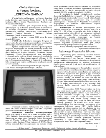 Gmina Kałuszyn w II edycji konkursu „ZDROWA GMINA” W roku bieżącym Burmistrz – p. Marian Soszyński podjął decyzję o przystąpieniu Naszej Gminy do II edycji konkursu Zdrowa Gmina. Organizatorem Konkursu jest Polska Unia Onkologii. Celem konkursu jest zwiększenie liczby osób zgłaszających się na badania profilaktyczne ukierunkowane na wczesne wykrywanie chorób nowotworowych, tj. mammografię, cytologię i kolonoskopię, organizowane przez Narodowy Fundusz Zdrowia i Narodowy Program Zwalczania Chorób Nowotworowych. Konkurs trwał od 1 marca 2011 roku do końca sierpnia 2011 roku. W 2011 roku do konkursu przystąpiło 211 gmin z 6 województw. Po zgłoszeniu przeprowadziliśmy szeroką akcję informacyjną wśród mieszkańców miasta i gminy. Zgodnie z regulaminem konkursu o poszczególnych miejscach decydującym był wzrost procentowy liczby osób zgłaszających się na badania profilaktyczne finansowane przez Narodowych Fundusz Zdrowia i Narodowy Program Zwalczania Chorób Nowotworowych oraz opracowanie i zgłoszenie opisu projektu działań promujących profilaktykę nowotworową z wykorzystaniem nagrody głównej, tj. 100 tys. zł. Nasza gmina znalazła się w finałowej 12 najlepszych, które przygotowały projekt profilaktyczny zwalczania chorób nowotworowych. Za udział w konkursie gmina Kałuszyn otrzymała z rąk Prezesa Polskiej Unii Onkologii Certyfikat. W ramach konkursu wykonywane były badania od marca 2011 roku do końca sierpnia 2011 roku. Trzykrotnie gościliśmy mammobus w Kałuszynie. Bezpłatnymi badaniami mammograficznymi objęte były kobiety w wieku od 50 do 69 lat /rocznik 1942 – 1961/. Badania mammograficzne przeprowadzane były w Kałuszynie, na placu obok Przychodni Opieki Zdrowotnej, przy ul. Wojska Polskiego 20. Badanie mammograficzne przeprowadziło Centrum Usług Medycznych FADO. Każda kobieta otrzymała listowne zaproszenie na badanie, wyniki badań przekazane zostały również listownie do wszystkich kobiet, które zgłosiły się na badania. Zgłaszalność na badania profilaktyczne w zakresie mammografii na koniec sierpnia wyniosła 39,19%, w zakresie cytologii – 20,88%. Z bezpłatnych badań cytologicznych powinna skorzystać każda kobieta w wieku 25 – 59 lat, która w ciągu trzech ostatnich lat nie miała wykonywanych takich badań. Badania cytologiczne wykonywane były w poradni ginekologiczno - położniczej w Przychodni w Kałuszynie. Przystąpienie do konkursu spowodowało większą zgłaszalność pań na badanie. Kolonoskopia to badanie profilaktyczne jelita grubego. Akcja ta jest skierowana do kobiet i mężczyzn w wieku 50 – 65 lat bez przypadków raka jelita grubego w rodzinie oraz osób w wieku 40 - 65 lat, u których w rodzinach były takie przypadki. Mimo ogłoszenia o możliwości zorganizowania wyjazdu zbiorowego na badanie kolonoskopii, nie było chętnych na te badania. Każdy może i powinien mieć wpływ na swój stan zdrowia. Regularne wykonywanie badań jest jednym z najskuteczniejszych sposobów wykrywania chorób. Więcej informacji o programie w tekście poniżej. Opracowała Jolanta Gójska Informacje Przychodni Zdrowia Organizowany przez Narodowy Fundusz Zdrowia (NFZ) i Narodowy Program Zwalczania Chorób Nowotworowych (NPZChN) konkurs „Zdrowa Gmina” ma na celu zwiększenie liczby osób zgłaszających się na badania profilaktyczne ukierunkowane na wczesne wykrywanie chorób nowotworowych tj rak piersi, rak szyjki macicy, rak jelita grubego. Rak piersi to najczęstszy w Polsce kobiecy nowotwór złośliwy. Stanowi wśród nowotworów główną przyczynę zgonów kobiet. Badaniem, które obecnie jest najlepszym sposobem wykrywania raka piersi w jego wczesnym stadium rozwoju jest mammografia. Pozwala rozpoznać wczesne zmiany, jak również te, które nie dają się wyczuć podczas badania palpacyjnego, nawet wielkości 2-3 mm. Mammografia pozwala wcześnie wykrywać 9095 % zmian nowotworowych, a we wczesnej fazie rozwoju każdy nowotwór może być całkowicie uleczalny. Co roku około 3 500 Polek dowiaduje się, że ma raka szyjki macicy, a połowa z nich umiera, bo zgłosiła się do lekarza zbyt późno. Oznacza to, że z 10 kobiet, u których codziennie wykrywa się ten nowotwór, 5 umiera. Część z nich nie zdążyła wykonać badania cytologicznego. Rak szyjki macicy rozwija się bezboleśnie i długo. Przez wiele lat może nie dawać żadnych objawów. Za rozwój raka szyjki macicy odpowiedzialny jest powszechnie występujący wirus brodawczaka ludzkiego, zwany HPV. Każda kobieta, niezależnie od wieku narażona jest na zakażenie się jego rakotwórczymi typami. Istnieje wiele typów wirusa HPV, ale tylko niektóre z nich są rakotwórcze i wywołują raka szyjki macicy. Cytologia jest badaniem pozwalającym na wykrycie raka szyjki macicy w początkowym stadium. Polega ono na mikroskopowej ocenie komórek pobranych specjalną szczoteczką z szyjki macicy. Dzięki temu można zdiagnozować nawet niewielkie nieprawidłowości. ciąg dalszy na str.12 9 “... Kałuszyńskie” – Czasopismo Kałuszyna i okolic / Informacje bieżące Urzędu Miejskiego Nr 2 (50) Październik / Listopad 2011r.