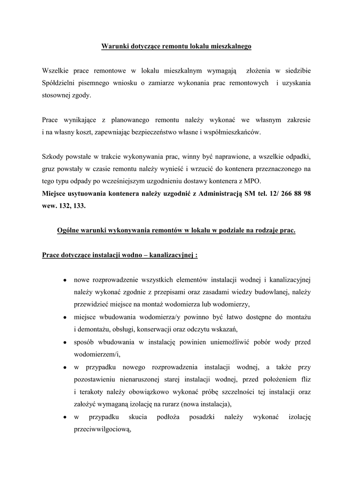 Warunki dotyczące remontu lokalu mieszkalnego Wszelkie prace remontowe w lokalu mieszkalnym wymagają złożenia w siedzibie Spółdzielni pisemnego wniosku o zamiarze wykonania prac remontowych i uzyskania stosownej zgody. Prace wynikające z planowanego remontu należy wykonać we własnym zakresie i na własny koszt, zapewniając bezpieczeństwo własne i współmieszkańców. Szkody powstałe w trakcie wykonywania prac, winny być naprawione, a wszelkie odpadki, gruz powstały w czasie remontu należy wynieść i wrzucić do kontenera przeznaczonego na tego typu odpady po wcześniejszym uzgodnieniu dostawy kontenera z MPO. Miejsce usytuowania kontenera należy uzgodnić z Administracją SM tel. 12/ 266 88 98 wew. 132, 133. Ogólne warunki wykonywania remontów w lokalu w podziale na rodzaje prac. Prace dotyczące instalacji wodno – kanalizacyjnej : nowe rozprowadzenie wszystkich elementów instalacji wodnej i kanalizacyjnej należy wykonać zgodnie z przepisami oraz zasadami wiedzy budowlanej, należy przewidzieć miejsce na montaż wodomierza lub wodomierzy, miejsce wbudowania wodomierza/y powinno być łatwo dostępne do montażu i demontażu, obsługi, konserwacji oraz odczytu wskazań, sposób wbudowania w instalację powinien uniemożliwić pobór wody przed wodomierzem/i, w przypadku nowego rozprowadzenia instalacji wodnej, a także przy pozostawieniu nienaruszonej starej instalacji wodnej, przed położeniem fliz i terakoty należy obowiązkowo wykonać próbę szczelności tej instalacji oraz założyć wymaganą izolację na rurarz (nowa instalacja), w przypadku skucia przeciwwilgociową, podłoża posadzki należy wykonać izolację w przypadku obmurowania wanny, należy sprawdzić drożność kratki ściekowej oraz wykonać wokół niej izolację przeciwwilgociową przed ułożeniem terakoty lub fliz, a gdy kratka znajduje się pod wanną i nie ulega likwidacji należy zapewnić do niej dostęp poprzez montaż drzwiczek umożliwiający czyszczenie i kontrolę szczelności, w przypadku wymiany wanny należy zastosować nowe, szczelne odprowadzenia elementów odpływowych oraz zapewnić dostęp do konserwacji lub wymiany, a odprowadzenie wody winno być bezwzględnie skierowane do kratki - nie na posadzkę, w przypadku obmurowania pionu kanalizacyjno - wodnego należy przewidzieć drzwiczki rewizyjne umożliwiające dostęp do zaworów w celu ich konserwacji oraz ewentualnej wymiany lub demontażu, w przypadku wymiany miski ustępowej - rury odprowadzające nie mogą być obudowane na stałe oraz winien być zapewniony do nich dostęp umożliwiający kontrolę szczelności. Należy unikać stosowania kolan utrudniających prawidłowy odpływ ścieków. Wymiana grzejników centralnego ogrzewania: Wymianę grzejników można wykonać jedynie poza sezonem grzewczym w okresie od maja do września, Zarówno zakup jak i montaż grzejnika/ów dokonywany jest na koszt osoby, której przysługuje tytuł prawny do lokalu, bez prawa zwrotu kosztów przez Spółdzielnię, Wymiana powinna być wykonana przez osoby wykwalifikowane i uprawnione do wykonywania tego typu robót, Przed przystąpieniem do wymiany grzejników należy w uzgodnieniu z Działem Technicznym opróżnić instalację centralnego ogrzewania z wody, aby uniknąć zalania mieszkania. Przeliczenia mocy grzewczej dla nowych grzejników przewidzianych do zamontowania w poszczególnych pomieszczeniach wykonuje inspektor ds. sanitarnych Działu Technicznego indywidualnie dla każdego odbiorcy tel. 12/ 266 88 98 wew.118, Spółdzielnia Mieszkaniowa nie wyraża zgody na samowolny demontaż grzejników w mieszkaniu. W przypadku stwierdzenia samowolnego demontażu grzejnika z miernikiem ciepła, lokal mieszkalny zostanie rozliczony za dany okres jak lokal nieopomiarowany, Koszty ponownego napełniania instalacji c.o. pokrywa właściciel, któremu przysługuje tytuł prawny do lokalu. W przypadku awarii zabudowanego bez zgody Spółdzielni pionu instalacji wodnokanalizacyjnej, Spółdzielnia zastrzega sobie prawo kontrolnego odkucia fliz, terakoty lub innego rodzaju stałej obudowy instalacji i zobowiązuje się do uzupełnienia powstałych w wyniku odkucia uszkodzeń, bez uzupełnienia okładzin ścian lub wypłaty z tego tytułu rekompensaty finansowej. Negatywne skutki spowodowane przeróbką lub ewentualną awarią instalacji, względnie urządzeń sanitarnych w czasie wykonywania robót lub występujące przecieki w czasie eksploatacji do innych lokali powstałe w wyniku wadliwego wykonawstwa przedmiotowych robót obciążają wyłącznie odpowiedzialnością osobę posiadającą tytuł prawny do lokalu. Prace dotyczące instalacji elektrycznej Prace może wykonać podmiot posiadający odpowiednie uprawnieniabudowlane do prowadzenia robót w zakresie elektrycznym, Instalacje należy wykonać w układzie sieci TN-S, Przewody prowadzone na klatce schodowej należy układać pod tynkiem, bruzdę zagipsować i pomalować w kolorze ściany, Wykonanie instalacji powinno być zgodne z obowiązującymi przepisami i normami, Należy przeprowadzić wymagane przepisami próby i pomiary po zakończeniu prac, Do Działu Technicznego Spółdzielni należy przekazać: kopie protokołów pomiarów stanu izolacji skuteczności ochrony przeciwporażeniowej, oświadczenie o poprawności wykonania instalacji wraz ze schematem ideowym instalacji, Szkody powstałe w trakcie prac winny być naprawione bezzwłocznie na koszt własny. Zakończenie prac związanych z remontami w lokalu mieszkalnym pisemnie do Spółdzielni. należy zgłosić