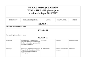 WYKAZ PODRĘCZNIKÓW W KLASIE I - III gimnazjum w roku szkolnym 2016/2017 PRZEDMIOT TYTUŁ PODRĘCZNIKA AUTOR NAZWA WYD. NR DOP. KLASA I Podręczniki będą do odbioru w szkole KLASA II Podręczniki będą do odbioru w szkole. KLASA III Język polski „Słowa na czasie”. Podręcznik do M. Chmiel kształcenia literackiego i kulturowego dla klasy 3 gimnazjum + podręcznik do kształcenia językowego. Nowa Era w przygotowaniu Matematyka Matematyka 3 (Matematyka z plusem). M. Dobrowolska Podręcznik dla gimnazjum (od 2011 r.) + ćwiczenia zgodne z najnowszą podstawą program Gdańskie Wydawnictwo Oświatowe 168/3/2011 Fizyka Spotkania z fizyką 3. Podręcznik dla gimnazjum z płytą CD ROM Spotkania z fizyką 4. Podręcznik dla gimnazjum z płytą CD ROM Grażyna Francuz- Ornat, Teresa Kulawik, Maria Nowotny- Różańska j.w. Nowa Era 93/3/2010 Nowa Era 93/4/2011 Chemia Chemia Nowej Ery, cz. 3. Podręcznik z Jan Kulawik, Teresa płytą CD ROM Kulawik, Maria Litwin Nowa Era 49/3/2010 Biologia Puls życia 3. Podręcznik z płytą CD ROM Małgorzata Jefimow Nowa Era 58/3/2010 Historia Śladami przeszłości 3. Podręcznik + ćwiczenia Stanisław Roszak, Anna Łaszkiewicz Nowa Era 60/3/2011 Geografia Planeta Nowa 3. Podręcznik z płytą CD Mariusz Szubert ROM dla klasy trzeciej gimnazjum + ćwiczenia Atlas geograficzny. Polska, kontynenty, J. Dajek i in. świat. Gimnazjum Nowa Era 7/3/2009 Nowa Era 0736/1999 Język niemiecki Magnet 3. Podręcznik + ćwiczenia Giorgio Motta Lektor Klett 98/3/2011 Język angielski Egzamin gimnazjalny. Repetytorium z testami (nowe, nieużywane!) Marta Rosińska, Grzegorz Śpiewak Macmillan 348/2011 Religia W drodze do Emaus 3 Marek Zbigniew SJ WAM program naucz. AZ33-01/1-11 J. Słoma, G. Zając Nowa Era 17/2009 A. Pacewicz, T. Merta Civitas 169/ 2/2010 Edukacja dla bezpieczeństwa Żyję i działam bezpiecznie. Edukacja dla bezpieczeństwa WOS Kształcenie obywatelskie w szkole samorządowej. Podręcznik cz. 2
