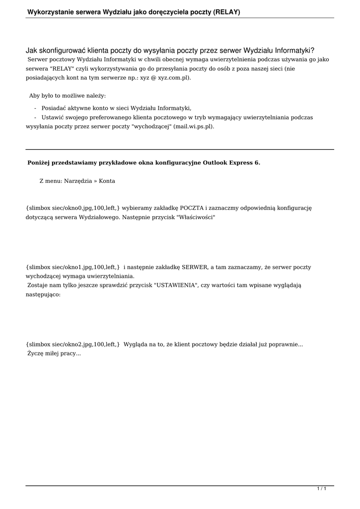 Wykorzystanie serwera Wydziału jako doręczyciela poczty (RELAY)