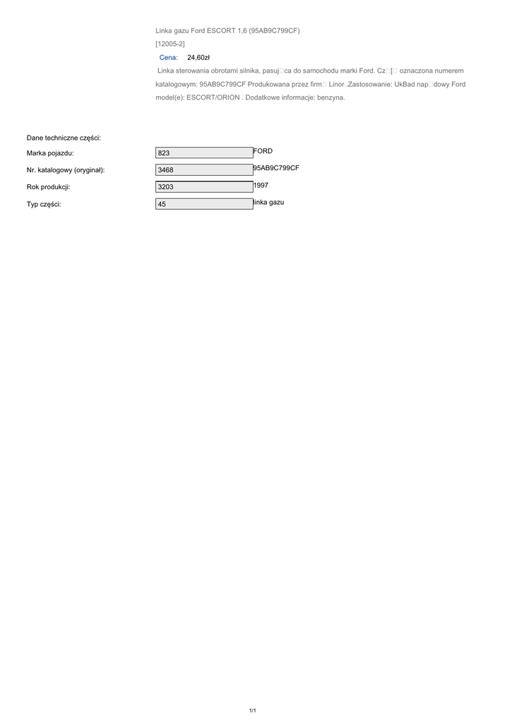 Linka gazu Ford ESCORT 1,6 (95AB9C799CF) [12005-2] Cena: 24,60zł Linka sterowania obrotami silnika, pasuj ca do samochodu marki Ford. Cz [ katalogowym: 95AB9C799CF Produkowana przez firm Linor .Zastosowanie: UkBad nap dowy Ford model(e): ESCORT/ORION . Dodatkowe informacje: benzyna. Dane techniczne części: Marka pojazdu: 823 FORD Nr. katalogowy (oryginał): 3468 95AB9C799CF Rok produkcji: 3203 1997 Typ części: 45 linka gazu 1/1 oznaczona numerem