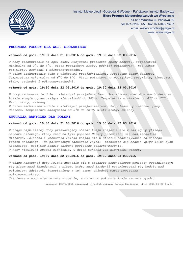 Instytut Meteorologii i Gospodarki Wodnej - Państwowy Instytut Badawczy Biuro Prognoz Meteorologicznych we Wrocławiu 51-616 Wrocław ul. Parkowa 30 tel: 071-320-01-50, fax: 071-348-73-37 email: [email protected] www: www.imgw.pl PROGNOZA POGODY DLA WOJ. OPOLSKIEGO ważność od godz. 19:30 dnia 21.03.2016 do godz. 19:30 dnia 22.03.2016 W nocy zachmurzenie na ogół duże. Miejscami przelotne opady deszczu. Temperatura minimalna od 2°C do 4°C. Wiatr początkowo słaby, później umiarkowany, nad ranem porywisty, zachodni i północno-zachodni. W dzień zachmurzenie duże z większymi przejaśnieniami. Przelotne opady deszczu. Temperatura maksymalna od 6°C do 8°C. Wiatr umiarkowany, początkowo porywisty, wieczorem słaby, zachodni i północno-zachodni. ważność od godz. 19:30 dnia 22.03.2016 do godz. 19:30 dnia 23.03.2016 W nocy zachmurzenie duże z większymi przejaśnieniami. Początkowo przelotne opady deszczu. Lokalnie mgła ograniczająca widzialność do 300 m. Temperatura minimalna od 0°C do 2°C. Wiatr słaby, zmienny. W dzień zachmurzenie duże z większymi przejaśnieniami. Po południu przelotne opady deszczu. Temperatura maksymalna od 8°C do 10°C. Wiatr słaby, zmienny. SYTUACJA BARYCZNA DLA POLSKI ważność od godz. 19:30 dnia 21.03.2016 do godz. 19:30 dnia 22.03.2016 W ciągu najbliższej doby przeważający obszar kraju znajdzie się w zasięgu płytkiego ośrodka niżowego, który znad Bałtyku poprzez Mazury przemieści się nad zachodnią Białoruś. Północna i wschodnia Polska znajdą się w strefie oddziaływania falującego frontu chłodnego. Na południowym zachodzie Polski zaznaczać się będzie wpływ klina Wyżu Azorskiego. Napływać będzie chłodne powietrze polarno-morskie. W nocy niewielki spadek ciśnienia, w dzień wahania lub niewielki wzrost. ważność od godz. 19:30 dnia 22.03.2016 do godz. 19:30 dnia 23.03.2016 W ciągu następnej doby Polska znajdzie się w obszarze przejściowym pomiędzy wypełniającym się niżem znad Skandynawii a niżem, który znad Sardynii przemieszczał się będzie nad południowy Adriatyk. Pozostaniemy w tej samej chłodnej masie powietrza polarno-morskiego. Ciśnienie w nocy nieznacznie wzrośnie, w dzień od południa kraju zacznie spadać. prognozę 10276/2016 opracował synoptyk dyżurny Janusz Zieliński, dnia 2016-03-21 11:43