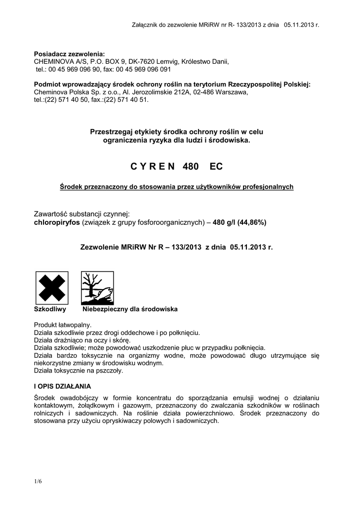 Załącznik do zezwolenie MRiRW nr R- 133/2013 z dnia 05.11.2013 r. Posiadacz zezwolenia: CHEMINOVA A/S, P.O. BOX 9, DK-7620 Lemvig, Królestwo Danii, tel.: 00 45 969 096 90, fax: 00 45 969 096 091 Podmiot wprowadzający środek ochrony roślin na terytorium Rzeczypospolitej Polskiej: Cheminova Polska Sp. z o.o., Al. Jerozolimskie 212A, 02-486 Warszawa, tel.:(22) 571 40 50, fax.:(22) 571 40 51. Przestrzegaj etykiety środka ochrony roślin w celu ograniczenia ryzyka dla ludzi i środowiska. C Y R E N 480 EC Środek przeznaczony do stosowania przez uŜytkowników profesjonalnych Zawartość substancji czynnej: chloropiryfos (związek z grupy fosforoorganicznych) – 480 g/l (44,86%) Zezwolenie MRiRW Nr R – 133/2013 z dnia 05.11.2013 r. Szkodliwy Niebezpieczny dla środowiska Produkt łatwopalny. Działa szkodliwie przez drogi oddechowe i po połknięciu. Działa draŜniąco na oczy i skórę. Działa szkodliwie; moŜe powodować uszkodzenie płuc w przypadku połknięcia. Działa bardzo toksycznie na organizmy wodne, moŜe powodować długo utrzymujące się niekorzystne zmiany w środowisku wodnym. Działa toksycznie na pszczoły. I OPIS DZIAŁANIA Środek owadobójczy w formie koncentratu do sporządzania emulsji wodnej o działaniu kontaktowym, Ŝołądkowym i gazowym, przeznaczony do zwalczania szkodników w roślinach rolniczych i sadowniczych. Na roślinie działa powierzchniowo. Środek przeznaczony do stosowana przy uŜyciu opryskiwaczy polowych i sadowniczych. 1/6 Załącznik do zezwolenie MRiRW nr R- 133/2013 z dnia 05.11.2013 r. II ZASTOSOWANIE ŚRODKA ROŚLINY ROLNICZE. 1. Pszenica ozima, jęczmień jary. Skrzypionki. Stosować od początku wylęgania się larw, w przypadku pszenicy ozimej od fazy odsłaniania się 40% kwiatostanu do pełni fazy kwitnienia, a w przypadku jęczmienia jarego od fazy widocznego liścia flagowego do pełni fazy kwitnienia. Maksymalna dawka dla jednorazowego zastosowania: 0,6 l/ha. Zalecana dawka dla jednorazowego zastosowania: 0,6 l/ha. Maksymalna liczba zabiegów w sezonie wegetacyjnym – 1. Zalecana ilość wody: 200-300 l/ha. Zalecane opryskiwanie: średniokropliste. 2. Rzepak ozimy. Słodyszek rzepakowy. (zabieg przeciwko słodyszkowi zwalcza równieŜ chowacza czterozębnego) Stosować po wystąpieniu chrząszczy na plantacji, zgodnie z sygnalizacją, od fazy widocznego 4 międzywęźla do końca fazy rozwoju pąków kwiatowych. Maksymalna dawka dla jednorazowego zastosowania: 1,0 l/ha. Zalecana dawka dla jednorazowego zastosowania: 0,65- 1,0 l/ha. Maksymalna liczba zabiegów w sezonie wegetacyjnym – 1. Zalecana ilość wody: 300 l/ha. Zalecane opryskiwanie: średniokropliste. Chowacz brukwiaczek. Stosować po wystąpieniu chrząszczy na plantacji, zgodnie z sygnalizacją, od fazy widocznego 4 międzywęźla do końca fazy rozwoju pąków kwiatowych. Środek niszczy równieŜ jaja i młode larwy występujące juŜ w roślinie. Maksymalna dawka dla jednorazowego zastosowania: 1,0 l/ha. Zalecana dawka dla jednorazowego zastosowania: 0,65- 1,0 l/ha. Maksymalna liczba zabiegów w sezonie wegetacyjnym – 1. Zalecana ilość wody: 300 l/ha. Zalecane opryskiwanie: średniokropliste. ROŚLINY SADOWNICZE. 1. Jabłoń Owocówka jabłkóweczka. 2/6 Załącznik do zezwolenie MRiRW nr R- 133/2013 z dnia 05.11.2013 r. Opryskiwać po wystąpieniu szkodnika, zgodnie z sygnalizacją, od fazy owoców osiągających wielkość do 20 mm do fazy gdy owoc osiąga 70% typowej wielkości. Maksymalna dawka dla jednorazowego zastosowania: 1,5 l/ha. Zalecana dawka do jednorazowego stosowania: 1,5 l/ha. Maksymalna liczba zabiegów w sezonie wegetacyjnym – 1 Zalecana ilość wody: 750 l/ha. Zalecane opryskiwanie: średniokropliste. 2. Śliwa Mszyca śliwowo-trzcinowa. Opryskiwać po wystąpieniu szkodnika, zgodnie z sygnalizacją, gdy owoc osiąga około 60% typowej wielkości. Maksymalna dawka dla jednorazowego zastosowania: 1,5 l/ha. Zalecana dawka dla jednorazowego zastosowania: 1,5 l/ha. Maksymalna liczba zabiegów w sezonie wegetacyjnym – 1. Zalecana ilość wody: 750 l/ha. Zalecane opryskiwanie: średniokropliste. UWAGI: 1. Środek działa najskuteczniej w temperaturze powyŜej 15°C. 2. Unikać znoszenia cieczy uŜytkowej na sąsiednie kwitnące rośliny. III SPORZĄDZANIE CIECZY UśYTKOWEJ. Przed przystąpieniem do sporządzania cieczy uŜytkowej dokładnie ustalić potrzebną jej ilość. Zawartością opakowania przed uŜyciem wstrząsnąć. Odmierzoną ilość środka wlać do zbiornika opryskiwacza napełnionego częściowo wodą (z włączonym mieszadłem). OpróŜnione opakowania przepłukać trzykrotnie wodą, a popłuczyny wlać do zbiornika opryskiwacza z cieczą uŜytkową. Następnie zbiornik opryskiwacza uzupełnić wodą do potrzebnej ilości. Po wlaniu środka do zbiornika opryskiwacza niewyposaŜonego w mieszadło hydrauliczne ciecz mechanicznie wymieszać. Po pracy aparaturę dokładnie wymyć. IV ŚRODKI OSTROśNOŚCI 1. OKRES OD ZASTOSOWANIA ŚRODKA DO DNIA, W KTÓRYM NA OBSZAR, NA KTÓRYM ZASTOSOWANO ŚRODEK MOGĄ WEJŚĆ LUDZIE ORAZ ZOSTAĆ WPROWADZONE ZWIERZĘTA Nie dotyczy. 2. OKRES PREWENCJI DLA PSZCZÓŁ (okres zapobiegający zatruciu) Nie dotyczy. 3/6 Załącznik do zezwolenie MRiRW nr R- 133/2013 z dnia 05.11.2013 r. 3. OKRES OD OSTATNIEGO ZASTOSOWANIA ŚRODKA DO DNIA ZBIORU ROŚLINY UPRAWNEJ (okres karencji) Pszenica ozima – nie dotyczy. Jęczmień jary – nie dotyczy. Rzepak ozimy – nie dotyczy. Jabłoń – 21 dni. Śliwa – 21 dni. 4. OKRES OD OSTATNIEGO ZASTOSOWANIA ŚRODKA NA ROŚLINY PRZEZNACZONE NA PASZĘ DO DNIA, W KTÓRYM ZWIERZĘTA MOGĄ BYĆ KARMIONE TYMI ROŚLINAMI (okres karencji dla pasz) Nie dotyczy. 5. OKRES OD OSTATNIEGO ZASTOSOWANIA ŚRODKA NA ROŚLINY DO DNIA, W KTÓRYM MOśNA SIAĆ LUB SADZIĆ ROŚLINY UPRAWIANE NASTĘPCZO Nie dotyczy. 6. OCHRONA STOSUJĄCEGO ŚRODEK OCHRONY ROŚLIN Nie jeść i nie pić podczas stosowania produktu. Unikać zanieczyszczenia skóry i oczu. Nosić odpowiednią odzieŜ o