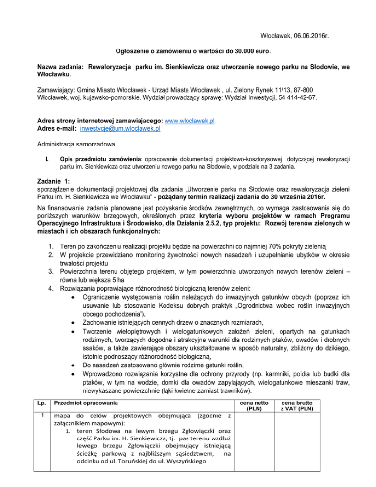 Włocławek, 06.06.2016r. Ogłoszenie o zamówieniu o wartości do 30.000 euro. Nazwa zadania: Rewaloryzacja parku im. Sienkiewicza oraz utworzenie nowego parku na Słodowie, we Włocławku. Zamawiający: Gmina Miasto Włocławek - Urząd Miasta Włocławek , ul. Zielony Rynek 11/13, 87-800 Włocławek, woj. kujawsko-pomorskie. Wydział prowadzący sprawę: Wydział Inwestycji, 54 414-42-67. Adres strony internetowej zamawiajacego: www.wloclawek.pl Adres e-mail: [email protected] Administracja samorzadowa. I. Opis przedmiotu zamówienia: opracowanie dokumentacji projektowo-kosztorysowej dotyczącej rewaloryzacji parku im. Sienkiewicza oraz utworzeniu nowego parku na Słodowie, w podziale na 3 zadania. Zadanie 1: sporządzenie dokumentacji projektowej dla zadania „Utworzenie parku na Słodowie oraz rewaloryzacja zieleni Parku im. H. Sienkiewicza we Włocławku” - pożądany termin realizacji zadania do 30 września 2016r. Na finansowanie zadania planowane jest pozyskanie środków zewnętrznych, co wymaga zastosowania się do poniższych warunków brzegowych, określonych przez kryteria wyboru projektów w ramach Programu Operacyjnego Infrastruktura i Środowisko, dla Działania 2.5.2, typ projektu: Rozwój terenów zielonych w miastach i ich obszarach funkcjonalnych: 1. Teren po zakończeniu realizacji projektu będzie na powierzchni co najmniej 70% pokryty zielenią 2. W projekcie przewidziano monitoring żywotności nowych nasadzeń i uzupełnianie ubytków w okresie trwałości projektu 3. Powierzchnia terenu objętego projektem, w tym powierzchnia utworzonych nowych terenów zieleni – równa lub większa 5 ha 4. Rozwiązania poprawiające różnorodność biologiczną terenów zieleni: Ograniczenie występowania roślin należących do inwazyjnych gatunków obcych (poprzez ich usuwanie lub stosowanie Kodeksu dobrych praktyk „Ogrodnictwa wobec roślin inwazyjnych obcego pochodzenia”), Zachowanie istniejących cennych drzew o znacznych rozmiarach, Tworzenie wielopiętrowych i wielogatunkowych założeń zieleni, opartych na gatunkach rodzimych, tworzących dogodne i atrakcyjne warunki dla rodzimych ptaków, owadów i drobnych ssaków, a także zawierające obszary ukształtowane w sposób naturalny, zbliżony do dzikiego, istotnie podnoszący różnorodność biologiczną, Do nasadzeń zastosowano głównie rodzime gatunki roślin, Wprowadzono rozwiązania korzystne dla ochrony przyrody (np. karmniki, poidła lub budki dla ptaków, w tym na wodzie, domki dla owadów zapylających, wielogatunkowe mieszanki traw, niewykaszane powierzchnie (łąki kwietne zamiast trawników). Lp. 1 Przedmiot opracowania mapa do celów projektowych obejmująca (zgodnie z załącznikiem mapowym): 1. teren Słodowa na lewym brzegu Zgłowiączki oraz część Parku im. H. Sienkiewicza, tj. pas terenu wzdłuż lewego brzegu Zgłowiączki obejmujący istniejącą ścieżkę parkową z najbliższym sąsiedztwem, na odcinku od ul. Toruńskiej do ul. Wyszyńskiego cena netto (PLN) cena brutto z VAT (PLN) 2 3 badania geologiczne, w tym: prace terenowe – 6 wierceń badawczych do głębokości 6m ppt (36mb), 3 wiercenia badawcze do głębokości 6m ppt (18mb), 10 wierceń badawczych do głębokości 3m ppt (30mb), wykonanie sondowań DPL do głębokości 3-6m ppt (30mb) badania laboratoryjne i prace kameralne 1. koncepcja zagospodarowania terenu 2. projekt zagospodarowania terenu, 3. projekt urządzenia rekreacyjnego miejsca spotkań mieszkańców, zrealizowanego w postaci ziemnych tarasów z siedziskami, z miejscem dla sezonowego lokowania dużej sceny oraz możliwością podłączenia do sieci energetycznej 4. projekt kina letniego – przeznaczenie jednego z basenów pod potrzeby kina letniego 5. zaproponować nową funkcję dla drugiego basenu – warianty 6. na wysokości Stanicy Harcerskiej: wykonanie drogi do Zgłowiączki i obniżenie jej brzegu w celu umożliwienia kończenia spływów kajakowych, wytyczenie miejsca na ognisko duże i ognisko małe; przy ognisku dużym zbudowanie zadaszonej wiaty; zbudowanie toru z przeszkodami, ustawienie urządzeń sportowych; zaprojektowanie w pobliżu przyłącza energetycznego i miejsca pod ustawienie urządzeń TOI TOI 7. projekt budowlany wyposażenia w elementy małej architektury 8. projekt budowlany drogowy z uwzględnieniem ścieżki pieszo-rowerowej (od. ul. Wyszyńskiego do ul. Wysokiej/Szpitalnej) 9. projekt budowlany oświetlenia parkowego na wybranym terenie Słodowa i zasilania w energię elektryczną miejsca spotkań z pkt 3 10. projekt budowlany branży sanitarnej (instalacja wody – zasilanie wybranych punktów poboru wody i instalacja hydrantowa) 11. inwentaryzacja szaty roślinnej 12. projekt gospodarki szatą roślinną 13. projekt szaty roślinnej 14. kosztorysy i specyfikacje techniczne 15. niezbędne uzgodnienia razem: Zadanie 2: sporządzenie dokumentacji projektowej dla zadania „Rewaloryzacja i ochrona różnorodności biologicznej „Ogrodu na Pompce” w zabytkowym Parku im. H. Sienkiewicza” - pożądany termin realizacji zadania do 30 października 2016r. Lp. 1 Przedmiot opracowania cena netto (PLN) cena brutto z VAT (PLN) 1. mapa do celów projektowych obejmująca, (zgodnie z załącznikiem mapowym) część Parku im. H. Sienkiewicza, tj. cały teren tzw. „Pompki” pomiędzy torami kolejowymi i ul. Toruńską 2. weryfikacja inwentaryzacji szaty roślinnej 3. ewentualny projekt gospodarki szatą roślinną 4. koncepcja zagospodarowania terenu jako systemu ścieżek edukacyjnych (z uwzględnieniem mapy obszarów chronionych na terenie Włocławka i globusa – metaloplastyka) 5. projekt budowlany drogowy 6. projekt budowlany wyposażenia w elementy małej architektury 7. projekt szaty roślinnej (o charakterze edukacyjnym, zróżnicowany gatunkowo) 8. kosztorysy i specyfikacje techniczne 9. niezbędne uzgodnienia razem: Zadanie 3: sporządzenie dokumentacji projektowej dla zadania „Park im. H. Sienkiewicza – partery kwiat