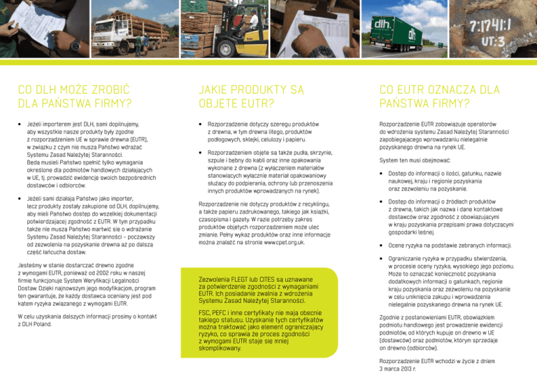 CO DLH MOŻE ZROBIĆ DLA PAŃSTWA FIRMY? JAKIE PRODUKTY SĄ OBJĘTE EUTR? CO EUTR OZNACZA DLA PAŃSTWA FIRMY? • J eżeli importerem jest DLH, sami dopilnujemy, aby wszystkie nasze produkty były zgodne z rozporządzeniem UE w sprawie drewna (EUTR), w związku z czym nie muszą Państwo wdrażać Systemu Zasad Należytej Staranności. Będą musieli Państwo spełnić tylko wymagania określone dla podmiotów handlowych działających w UE, tj. prowadzić ewidencję swoich bezpośrednich dostawców i odbiorców. • R ozporządzenie dotyczy szeregu produktów z drewna, w tym drewna litego, produktów podłogowych, sklejki, celulozy i papieru. Rozporządzenie EUTR zobowiązuje operatorów do wdrożenia systemu Zasad Należytej Staranności zapobiegającego wprowadzaniu nielegalnie pozyskanego drewna na rynek UE. • J eżeli sami działają Państwo jako importer, lecz produkty zostały zakupione od DLH, dopilnujemy, aby mieli Państwo dostęp do wszelkiej dokumentacji potwierdzającej zgodność z EUTR. W tym przypadku także nie muszą Państwo martwić się o wdrażanie Systemu Zasad Należytej Staranności - począwszy od zezwolenia na pozyskanie drewna aż po dalszą część łańcucha dostaw. Jesteśmy w stanie dostarczać drewno zgodne z wymogami EUTR, ponieważ od 2002 roku w naszej firmie funkcjonuje System Weryfikacji Legalności Dostaw. Dzięki najnowszym jego modyfikacjom, program ten gwarantuje, że każdy dostawca oceniany jest pod kątem ryzyka związanego z wymogami EUTR. W celu uzyskania dalszych informacji prosimy o kontakt z DLH Poland. • R ozporządzeniem objęte są także pudła, skrzynie, szpule i bębny do kabli oraz inne opakowania wykonane z drewna (z wyłączeniem materiałów stanowiących wyłącznie materiał opakowaniowy służący do podpierania, ochrony lub przenoszenia innych produktów wprowadzanych na rynek). Rozporządzenie nie dotyczy produktów z recyklingu, a także papieru zadrukowanego, takiego jak książki, czasopisma i gazety. W razie potrzeby zakres produktów objętych rozporządzeniem może ulec zmianie. Pełny wykaz produktów oraz inne informacje można znaleźć na stronie www.cpet.org.uk. Zezwolenia FLEGT lub CITES są uznawane za potwierdzenie zgodności z wymaganiami EUTR. Ich posiadanie zwalnia z wdrożenia Systemu Zasad Należytej Staranności. FSC, PEFC i inne certyfikaty nie mają obecnie takiego statusu. Uzyskanie tych certyfikatów można traktować jako element ograniczający ryzyko, co sprawia że proces zgodności z wymogami EUTR staje się mniej skomplikowany. System ten musi obejmować: • D ostęp do informacji o ilości, gatunku, nazwie naukowej, kraju i regionie pozyskania oraz zezwoleniu na pozyskanie. • D ostęp do informacji o źródłach produktów z drewna, takich jak nazwa i dane kontaktowe dostawców oraz zgodność z obowiązującymi w kraju pozyskania przepisami prawa dotyczącymi gospodarki leśnej. • Ocenę ryzyka na podstawie zebranych informacji. • O graniczanie ryzyka w przypadku stwierdzenia, w procesie oceny ryzyka, wysokiego jego poziomu. Może to oznaczać konieczność pozyskania dodatkowych informacji o gatunkach, regionie kraju pozyskania oraz zezwoleniu na pozyskanie w celu uniknięcia zakupu i wprowadzenia nielegalnie pozyskanego drewna na rynek UE. Zgodnie z postanowieniami EUTR, obowiązkiem podmiotu handlowego jest prowadzenie ewidencji podmiotów, od których kupuje on drewno w UE (dostawców) oraz podmiotów, którym sprzedaje on drewno (odbiorców). Rozporządzenie EUTR wchodzi w życie z dniem 3 marca 2013 r. Pytania i odpowiedzi NAJWAŻNIEJSZE TERMINY • C zy mogę kupować drewno z certyfikatem EUTR? Nie – EUTR nie jest programem certyfikacji, a właściwe organy w państwach członkowskich UE nie będą wydawały certyfikatów na konkretne dostawy ani dla konkretnych dostawców. Operatorzy: Firmy wprowadzające drewno i produkty z drewna na rynek UE po raz pierwszy. • C zy posiadając certyfikat FSC muszę się jakoś przygotować do wejścia w życie EUTR? Tak, ponieważ taki certyfikat nie jest wystarczającym dokumentem. Można jednak go wykorzystać w procesie wdrażania Systemu Zasad Należytej Staranności. • K upując drewno w krajach tropikalnych zawsze proszę lokalne władze o licencję eksportową mającą stanowić dowód legalności pochodzenia drewna – czy muszę robić coś więcej? Tak – zgodnie z EUTR proces weryfikacji zgodności prowadzony przez podmiot handlowy musi obejmować cały łańcuch dostaw, zwłaszcza w krajach o wysokim poziomie korupcji. Dlatego sama licencja eksportowa nie jest wystarczająca. Podmioty handlowe: Firmy kupujące i sprzedające drewno i produkty z drewna, które zostały już wprowadzone na rynek UE. Wprowadzenie na rynek: Wprowadzenie na rynek UE po raz pierwszy ma miejsce z chwilą zwolnienia lub odprawy drewna lub produktów z drewna przez władze cele w dowolnym kraju UE. System Zasad Należytej Staranności: Systematyczne wdrażanie środków kontroli dotyczących kupowanego drewna. Środki te muszą służyć zapobieganiu świadomemu lub nieświadomemu kupowaniu nielegalnie pozyskanego drewna i wprowadzaniu go na rynek UE. Reszta Świata • K upuję tylko drewno z upraw europejskich – czy muszę przejmować się wprowadzeniem EUTR? Tak, ale ponieważ ryzyko nielegalnego pochodzenia drewna jest najprawdopodobniej niskie, weryfikacja zgodności ze wszystkimi wymaganiami może być bardzo prosta. Rynek EU Ewidencja dostawców Podmiot handlowy / Sprzedawca detaliczny Ewidencja odbiorców Ewidencja dostawców Podmiot handlowy Zakaz wprowadzania na rynek drewna z nielegalnych źródeł System Zasad Należytej Staranności FLEGT – egzekwowanie prawa dotyczącego gospodarki leśnej, zarządzanie i handel. FLEGT to uruchomiony w 2003 roku program UE, którego celem jest usprawnienie egzekwowania prawa w dziedzinie gospodarki leśnej w krajach będących dostawcami drewna. Program jest realizowany poprzez różne inicja