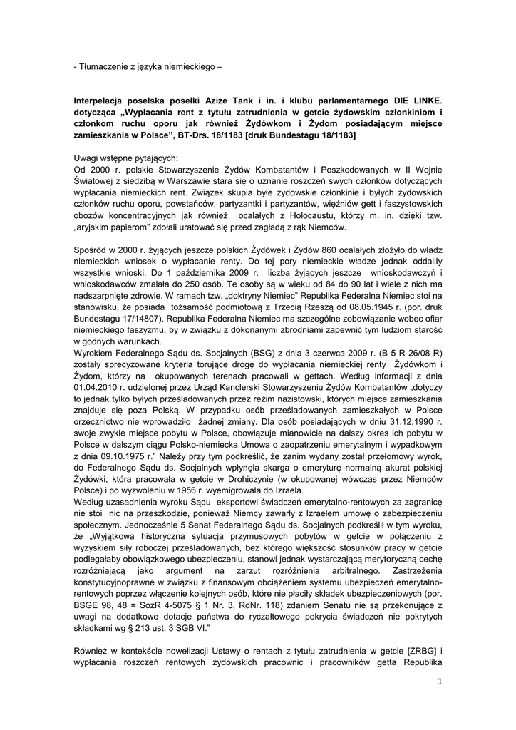 - Tłumaczenie z języka niemieckiego – Interpelacja poselska posełki Azize Tank i in. i klubu parlamentarnego DIE LINKE. dotycząca „Wypłacania rent z tytułu zatrudnienia w getcie żydowskim członkiniom i członkom ruchu oporu jak również Żydówkom i Żydom posiadającym miejsce zamieszkania w Polsce”, BT-Drs. 18/1183 [druk Bundestagu 18/1183] Uwagi wstępne pytających: Od 2000 r. polskie Stowarzyszenie Żydów Kombatantów i Poszkodowanych w II Wojnie Światowej z siedzibą w Warszawie stara się o uznanie roszczeń swych członków dotyczących wypłacania niemieckich rent. Związek skupia byłe żydowskie członkinie i byłych żydowskich członków ruchu oporu, powstańców, partyzantki i partyzantów, więźniów gett i faszystowskich obozów koncentracyjnych jak również ocalałych z Holocaustu, którzy m. in. dzięki tzw. „aryjskim papierom” zdołali uratować się przed zagładą z rąk Niemców. Spośród w 2000 r. żyjących jeszcze polskich Żydówek i Żydów 860 ocalałych złożyło do władz niemieckich wniosek o wypłacanie renty. Do tej pory niemieckie władze jednak oddalily wszystkie wnioski. Do 1 października 2009 r. liczba żyjących jeszcze wnioskodawczyń i wnioskodawców zmalała do 250 osób. Te osoby są w wieku od 84 do 90 lat i wiele z nich ma nadszarpnięte zdrowie. W ramach tzw. „doktryny Niemiec” Republika Federalna Niemiec stoi na stanowisku, że posiada tożsamość podmiotową z Trzecią Rzeszą od 08.05.1945 r. (por. druk Bundestagu 17/14807). Republika Federalna Niemiec ma szczególne zobowiązanie wobec ofiar niemieckiego faszyzmu, by w związku z dokonanymi zbrodniami zapewnić tym ludziom starość w godnych warunkach. Wyrokiem Federalnego Sądu ds. Socjalnych (BSG) z dnia 3 czerwca 2009 r. (B 5 R 26/08 R) zostały sprecyzowane kryteria torujące drogę do wypłacania niemieckiej renty Żydówkom i Żydom, którzy na okupowanych terenach pracowali w gettach. Według informacji z dnia 01.04.2010 r. udzielonej przez Urząd Kanclerski Stowarzyszeniu Żydów Kombatantów „dotyczy to jednak tylko byłych prześladowanych przez reżim nazistowski, których miejsce zamieszkania znajduje się poza Polską. W przypadku osób prześladowanych zamieszkałych w Polsce orzecznictwo nie wprowadziło żadnej zmiany. Dla osób posiadających w dniu 31.12.1990 r. swoje zwykle miejsce pobytu w Polsce, obowiązuje mianowicie na dalszy okres ich pobytu w Polsce w dalszym ciągu Polsko-niemiecka Umowa o zaopatrzeniu emerytalnym i wypadkowym z dnia 09.10.1975 r.” Należy przy tym podkreślić, że zanim wydany został przełomowy wyrok, do Federalnego Sądu ds. Socjalnych wpłynęła skarga o emeryturę normalną akurat polskiej Żydówki, która pracowała w getcie w Drohiczynie (w okupowanej wówczas przez Niemców Polsce) i po wyzwoleniu w 1956 r. wyemigrowala do Izraela. Według uzasadnienia wyroku Sądu eksportowi świadczeń emerytalno-rentowych za zagranicę nie stoi nic na przeszkodzie, ponieważ Niemcy zawarły z Izraelem umowę o zabezpieczeniu społecznym. Jednocześnie 5 Senat Federalnego Sądu ds. Socjalnych podkreślił w tym wyroku, że „Wyjątkowa historyczna sytuacja przymusowych pobytów w getcie w połączeniu z wyzyskiem siły roboczej prześladowanych, bez którego większość stosunków pracy w getcie podlegałaby obowiązkowego ubezpieczeniu, stanowi jednak wystarczającą merytoryczną cechę rozróżniającą jako argument na zarzut rozróżnienia arbitralnego. Zastrzeżenia konstytucyjnoprawne w związku z finansowym obciążeniem systemu ubezpieczeń emerytalnorentowych poprzez włączenie kolejnych osób, które nie płaciły składek ubezpieczeniowych (por. BSGE 98, 48 = SozR 4-5075 § 1 Nr. 3, RdNr. 118) zdaniem Senatu nie są przekonujące z uwagi na dodatkowe dotacje państwa do ryczałtowego pokrycia świadczeń nie pokrytych składkami wg § 213 ust. 3 SGB VI.” Również w kontekście nowelizacji Ustawy o rentach z tytułu zatrudnienia w getcie [ZRBG] i wypłacania roszczeń rentowych żydowskich pracownic i pracowników getta Republika 1 Federalna staje dotychczas na stanowisku, że możliwe jest wypłacanie rent do wszystkich krajów, z wyjątkiem pracownic i pracowników getta, którzy po wyzwoleniu z niemieckiego faszyzmu zachowali swoje miejsce zamieszkania w Polsce (por. odpowiedź Rządu Federalnego na pisemne zapytanie nr 74 poselki Azize Tank, druk Bundestagu 18/815). Bezpośrednio po wyroku Federalnego Sądu ds. Socjalnych Stowarzyszenie Żydów Kombatantów w 2009 r. ponownie zwróciło się do Niemieckiego Ubezpieczenia EmerytalnoRentowego „Deutsche Rentenversicherung Bund” i wskazało na nierówne traktowanie. Ponadto prezes Stowarzyszenia Tomasz Miedziński osobiście poprosił kanclerz federalną dr Angelę Merkel o zakończenie tego niewłaściwego merytorycznie nierównego traktowania pracowników getta i o wypłacenie rent według Ustawy o rentach z tytułu zatrudnienia w getcie [ZRBG] niewielu jeszcze żyjącym żydowskim pracownikom w Polsce, których wnioski wraz z dokumentami już od wielu lat znajdują się w Federalnym Urzędzie ds. Służb Centralnych i otwartych Kwestii Majątkowych Republika Federalna Niemiec jednak do tej pory odmawia wypłacania rent polskim Żydówkom i Żydom, którzy pracowali w gettach i posiadają w Polsce stałe miejsce zamieszkania. Federalny Urząd Kanclerski wyjaśnił osobom ocalałym z Holocaustu zamieszkałym w Polsce, których to dotyczy, że „z czasokresów płacenia składek w getcie zgodnie z Ustawą o rentach z tytułu zatrudnienia w getcie [ZRBG] oraz ewentualnych innych niemieckich czasokresów […] nie wynika roszczenie emerytalno-rentowe w Polsce. Ta sytuacja prawna nie uległa żadnej zmianie również po przystąpieniu Polski do Unii Europejskiej. […] Również w przypadku, gdy niemiecki czasokres nie prowadzi do podwyżki renty lub polscy ubezpieczyciele odmawiają świadczeń według przepisów polskich, tak samo nie powstaje