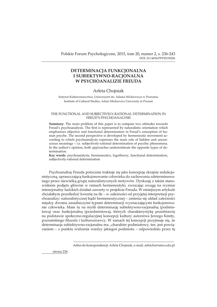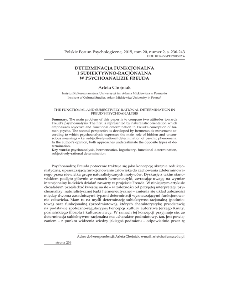 Polskie Forum Psychologiczne, 2015, tom 20, numer 2, s. 236-243 DZȱŗŖǯŗŚŜśŜȦŘŖŗśŖŘŖŜ DETERMINACJA FUNKCJONALNA ȱȬȱ ȱ ȱ Arleta Chojniak Instytut Kulturoznawstwa, Uniwersytet im. Adama Mickiewicza w Poznaniu ȱȱȱǰȱȱ £ȱ¢ȱȱ£Ú THE FUNCTIONAL AND SUBJECTIVELY-RATIONAL DETERMINATION IN Ȃȱ Summaryǯȱȱȱȱȱȱȱȱȱȱ ȱĴȱ ȱ Ȃȱ¢¢ǯȱȱęȱȱȱ¢ȱȱȱ ȱ £ȱ ȱ ȱ ȱ ȱ ȱ Ȃȱ ȱ ȱ ȱ¢ǯȱȱȱȱȱȱ¢ȱȱȱȱ ȱ ȱ ¢¢ȱ ¡ȱ ȱ ȱ ȱ ȱ ȱ ȱ ȱȱȮȱǯǯȱ¢Ȭȱȱȱ¢ȱǯȱ ȱȱȂȱǰȱȱȱȱȱȱ¢ȱȱtermination. Key wordsDZ psychoanalysis, hermeneutics, logotheory, functional determination, ¢Ȭȱ ¢£¿ȱȱ£ȱȱ¿ȱȱ¿ȱȱ¢£ǰȱ££ȱ ȱ£Ù ȱȱ£ ȱ£ ȱ££ȱ ȱ¿ȱ¢£¢ȱ¢ à ǯȱ¢¿ȱ£ȱȱ ȱ ¿ȱ Ùà ȱ ȱ ȱ ¢ǰȱ £ ȱ ¿ȱ ȱ ¢ȱ ¢ȱ£ȱ£ÙÚȱ£ ¢ȱ ȱȱǯȱȱ£¢ȱ¢ȱ Ù¢ȱ£ï£°ȱ ¿ȱȱȱȮȱ ȱ£Čïȱȱ£¢¿ȱȱ¢£¢DZȱ¢£ȱĊȱ¢£ȱȮȱ£ȱ¿ȱÙȱ£Čïȱ ¿£¢ȱ ȱ££¢ȱ¢ȱȱ ¢££¢ȱ ȱ £Ù ǯȱ ȱ ȱ ȱ ¢ïȱ ¿ȱ ¢ Ȭȱ ǻ Ǽȱ £ȱ ȱ ǻ£ Ǽǰȱ à¢ȱ ¢¢¿ȱ £ ¿ȱ ȱ ȱ Ù£Ȭ¢ȱ ȱ ¢ȱ ȱ £ȱ ¢ǰȱ £Úȱę£ȱȱ£ ¢ǯȱȱȱȱȱ£¢ȱ¿ǰȱČȱ ȱ¢ ȬȱȱǮȱ ¢ǰȱĵǯȱȱ £ȱ Ȯȱ £ȱ ȱ £ȱ £¢ȱ ïȱ ȱ Ȯȱ ȱ ££ȱ ¿ȱ ȱȱDZȱȱǰȱȬǰȱȓǯǯ strona 236 £¿ȱ¿ȱ£Ùȱ£ȱ ȱ££ȱȱ¿¢ȱȱǰȱȱ ¿ȱ ȱ ïǰȱȱàȱ£ȱ££ȱȄȱǻǰȱŗşşŘǰȱǯȱřřǼǯȱ¢ȱÙ ¢ȱ £ȱȱ¢ ¢ȱ£ £ȱ¿£¢ȱ £ȱȱȦ ïȱȱȱ°ȱȱȱ £ȱȱ£ÙȱȱȱČ ¢ȱȱ£¿ȱ Ȧȱ ȱ £Ùȱ £¢ȱ £ȱ £¿ȱ ȱ ȱ ǻǯȱ ǯȱ £ǰȱ ǰȱ ŗşşŗǰȱǯȱŘřȬŘŞǼǯȱ ȱ ȱ ¢ȱ £ȱ ¢¢£ȱ ȱ ę£ęȱ ¢Ùȱ Čȱ¿ȱ£ȱÙ¿ȱČȱ ȱȱ ȱ£ȱȱ £ȱ ǰȱȱȱȱǯȱ£ȱàČȱ ȱȱ¢ǰȱČȱȱȱǮȱȱ £¿ȱ£wy1ǰȱ ȱȱ £ȱïȱ¢ȱ£ÙÚȱ£ȱȱȱȱȱȱȮȱ£ȱ £¿ȱȱǰȱ£¢ȱȱȱ¢Ùȱ££ȱïȱ¢ȱ£¢ǰȱ ȱ ȱ££àïȱ ¢ȱȱȄȱǻǰȱŗşşŘǰȱǯȱřřǼǯȱ£ȱ££ȱǰȱ w pierwszym przypadku – determinacji podmiotowej – wiedza podmiotu na temat £¢ȱ£ÙÚȱ £¢ȱȱ££ȱȱȱ£¿¢ȱ ȱ ȱ ¿ǯȱ ȱ ȱ £¢ȱ Ȯȱ ȱ £ ȱ Ȯȱ ǰȱ £¢ȱ ȱ ȱ ïȱ £¿ȱ £¢ȱ ǰȱ ȱ DZȱ ȱ ȱ ȱ ȱ ȱï¢ȱ£ Úȱȱǯ ȱ£ȱ Úȱ£ȱȱ£¢ȱ£ȱ£¢ȱȱ £¢ȱ£ȱȱ£¢ïȱ £¢ǯȱÙï ¢ȱȱ¢ȱ £ȱ £ȱ £¢ȱ ȱ ȱ £ ȱ £ȱ £¿ȱ ȱ ǰȱ Čȱ ȱȱ¢ȱ£¢ïȱï ïȱǻȱȦȱ¢Ǽǯȱǰȱȱ ȱ£¢ȱ¢ȱ¿ȱ ȱ¢ïǰȱȱȱï £ǰȱȱ¿ȱàČȱ ¢ȱ ĵ ǯȱ ȱ ¢£ǯȱ ȱ ȱ ȱ ȱ ȱȱ¢ ¢ǰȱ¢Čȱ¢£¢ȱ£ ȱ£Č¢ȱȱï ïǯȱ ȱ¢ȱ£¢ȱ¿ ȱ £ȱǻĵ ǯȱ ¢ïȱǼȱȱ ȱȱȱ ¢ïȱȱ£ ǯȱ¢£ȱ£ȱ £¢ȱȱ £¢£ȱ£ȱ£¢£ £ȱ£ ȱ¢¿ǯ Zarówno psychoanaliza Freuda, jak i inne koncepcje omawiane w niniejszym ¢ȱ àȱ £¿°ȱ ȱ £ȱ ǯȱ ȱ ȱ ȱ ȱ ȱ ȱȱȱ£ȱǯȱȱ£ £ȱ£ȱ¢ȱ¿Ù¢ȱ£ȱ ïȱ ¢¢ȱ£ȱ ȱàČ¢ȱ£ȱ£¢ǯȱ ¢ȱ ¿ǰȱ Čȱ £¢ȱ £¿ï ȱ ȱ ¢ę ȱ ¿ȱ £ £à ȱ ¢¢ǰȱ £ ȱ ȱ ȱ Úȱ ¢ǯȱ ȱ ȱ ïȱà ȱ £¿ȱ Ùȱ¿ȱ¢£ȱČȱà °ȱČȱ w przypadku samego Freuda. ȱ à¢ȱ ¢£¢ȱ ¢Ùȱ ȱ ȱ ǰȱàȱÙÙ¢ȱ ¢ȱ ïȱ ȱ££ȱ¢¿ȱȱ£¿ï°ȱ¿ȱȱȱ¿DZȱǮ££ȱ ȱ £¿ï°ȱ£ ȱ ȱȱȱ£ȱȱȱȱȱǰȱČȱ£Ùȱ ȱ £¢ȱ £ȱ ȱ £ȱ ¿ȱ ȱ °ȱ ȱ £ ȱ ¢Ù£ȱ Čȱ ȱ ȱ ¢ȱ ¢ Ȭ¢ǰȱ £ïȱ ȱ Ù£ȱ ȱ ¢ïȱ ȱȱ £ȱȮȱȱȱȮȱ£¢ïȱ£ ¢ǰȱȱȱȱ ȱ ȱȱ ȄȱǻǰȱŗşşŘǰȱǯȱřřǼǯ 1 strona 237 ǯȱ ȱ¢ȱ£ȱ °ȱČȱ ȱ £¢ȱȱ¢ȱ £ȱ£ȱǻ§ǰȱãǰȱŗşşŝǼǯȱȱČȱȱ£¢ȱȱ ȱ£Ùȱȱ£ȱȱ££ȱstricteȱ¢£¢ǰȱȱČï°ȱ Ǯȱ ¢£Ȅȱ ȱ ï ȱ Ùȱ ȱ £Ùȱ ȱ ȱ ǯȱÙȱ ȱà ȱȱȱȱ ¢£¢ȱ uzasadnieniem dla naturalistycznego odczytania Freuda, a w konsekwencji redu ȱ ¢ȱ¢£ȱȱȱȱ¢ȱ ¢ȱ£ïȱ £ȱ£¢à ȱ£¢ȱǻǯȱ£ £ǰȱŗşŞřDzȱǰȱŗşşŞDzȱûǰȱŘŖŖŚǼǯȱ ǰȱ ȱàȱ£¢£¢°ȱÙ ȱȱǰȱï £ȱȱ£¢¿¢ȱ £ȱ £¢ȱ £ȱ ȱ àȱ ȱ ȱ ǯȱ ¢ £ȱ ¢ȱ¿ȱ £ǰȱČȱǮ¢ȱ¢£ȱǻǯǯǯǼȱ ȱ ȱ Ùï ȱ ¢¿Ȅȱ ǻǰȱ ŘŖŖŖǰȱ ǯȱ ŗŖşǼǯȱ ȱ £Ùǰȱ Čȱ ȱ ȱ ȱ ȱ ȱ ï ïȱ Ȯȱ ȱ ȱ ï£ǰȱ ¢Ùȱ ¿ȱ¿£¢ȱ£ȱ£¢ȱȱ¢£¢ǯȱ ȱ¢ȱ ï ȱ Ùȱ °ȱ ȱ £ °ȱ ȱ ¢ȱ ïàȱ ¢ȱÙ¿£ȱ£¢£ DZȱǮǰȱ£ȱ£ȱà¢ȱ¢ȱȱȱ ȱȱï ǰȱ£ ȱ¢¿ȱ££Ù°ȱ ȱ¿ȱ£¢£Ȅȱ ǻǰȱŘŖŖŖǰȱǯȱŗŗŖǼǯȱ ȱȱ£ ȱ¿ȱ£ȱ£¢ ¢ȱ ȱȱ¢£¢ȱ ȱ £ ȱ ȱ ȱ ȱ ï £¢ȱ à Čȱ ȱ ¢££¢ȱ £ȱȱÚȱ¢¢£¢ǯȱȱ £Ùȱ ǰȱČȱ ȱ£¢£Ùïȱ¿£ȱČ ȱȱ£ £à ȱ¿£¢ȱȱȱȱ¢¢£ȱ ǻ£ £ǰȱŗşŞřǰȱǯȱŗřřǼǯȱȱȱȱǮ£¿Ù¢¢ǰȱï¢ȱ£ȱà ȱ ¢£¢ȱČ¢°ȱà ȱ棣¢ȱȱ£¢ȄȱǻǰȱŘŖŖŖǰȱ ǯȱśśǼǯȱ£¢ ÙȱČǰȱČȱȱȱȱ¢¢ȱ ǰȱàȱČȱ Č¢°ȱȱ¢£¢DZȱǮǽǾȱȱ££¢ ïȱ££ȱ£¢ȱ Č ïǰȱ Č¢ȱ ¿ȱ ¿ȱ £ °ȱ ȱ ȱ £ȱ £ ¢ȱ ¢ïÚȱȱȱ¢¢ï¢ȱ ȱȱ°ǰȱȱ £ȱ£ȱȱ ȱ££ȱȱ¢ȱ£ȱȱ£ǯȱ¢°ȱČǰȱ¿ȱȱȱ Ùïȱ £ǰȱàȱÙȱ£ȱ£ ȱ¿ȱ£ȱ£ȱȱȱ£ȱȄȱǻǰȱŘŖŖŖǰȱǯȱśśǼǯȱ ÙČȱ¢ȱ ȱ ȱ£¢ǰȱÙ ȱexplicite, nie £Ù¢ȱȱȱ£¢¿ȱȱȱïȱȱȱ¢£¢ǯȱȱȱ ȱȱ£¢Ùȱ£ £ȱȱ£ȱȱ¢logów introspekcyjnych, którzy zastosowali program metodologiczny oparty na £ȱ ¢ę£¢£¢ǰȱ °ȱ ȱ ȱ £ȱ Ùȱ £ȱ ¢£¢ȱ ǻǰȱ ŗşşśǼǯȱ ȱ £Ùȱ ¢£ï°ȱ à ȱ ¢£¢ȱ ȱ ¢£¢ǰȱ £ȱ ȱ ¢£¢ȱ Ùȱ ¢Ù£ȱ ȱ ȱ ¢ȱ £ ǯȱ ¢Ùȱ ȱ £ £ȱ ï°ȱ ¢ ȱ ȱ ȱ £¢ǰȱ ࣢ȱ £ȱ ȱ ȱ£ȱà ȱÙ£¢°ȱ£ȱ£ȱ££ȱȱ¢ęȱ ȱ£ÙČïȱ£ ȱ¢ǯȱȱȱ Ùȱ¿ȱȱȱȱàȱ ¢ïȱ ȱ¢£ȱǰȱȱȱÚȱȱȱ ȱ£Ȭ棣ǯȱȱ£ȱ£ÙČȱȱ¢£ïȱȱ ȱà ȱ ¢ȱ£ȱȱȱȱ¢£¢ȱČÙ¢ȱ strona 238 ¢ £°ȱ ǰȱČȱǮȱ¢£¢Ȅȱ Ùȱȱ £àȱÙà ȱ¢ȱ ¢ȱ£ȱ £¢ȱȱ£¢£¢ǯȱȱïȱ ¢£ȱ ȱȱǰȱ£ȱ ¢Čȱ ¢¢ȱ £ǰȱ £ȱČȱàȱę ȱȱ¢ȱ££ȱȱȱȱȱ£ÚǰȱȱÙȱ ȱÙȱ¢ǯȱȱȱ ¢Ċȱ £¢ȱȱ ȱĵ ǯȱȱęȱpsycheǰȱ ȱàȱȱ ¢àČÙȱ£¢ȱ¢DZȱid, ego, superego ǻǯȱ ǯȱ ǰȱ ŗşşŗǰȱ ǯȱ řśDzȱ £ ǰȱ ŗşşŞǰȱ ǯȱ śşǼǯȱ ȱ ȱ £¿ȱ genez