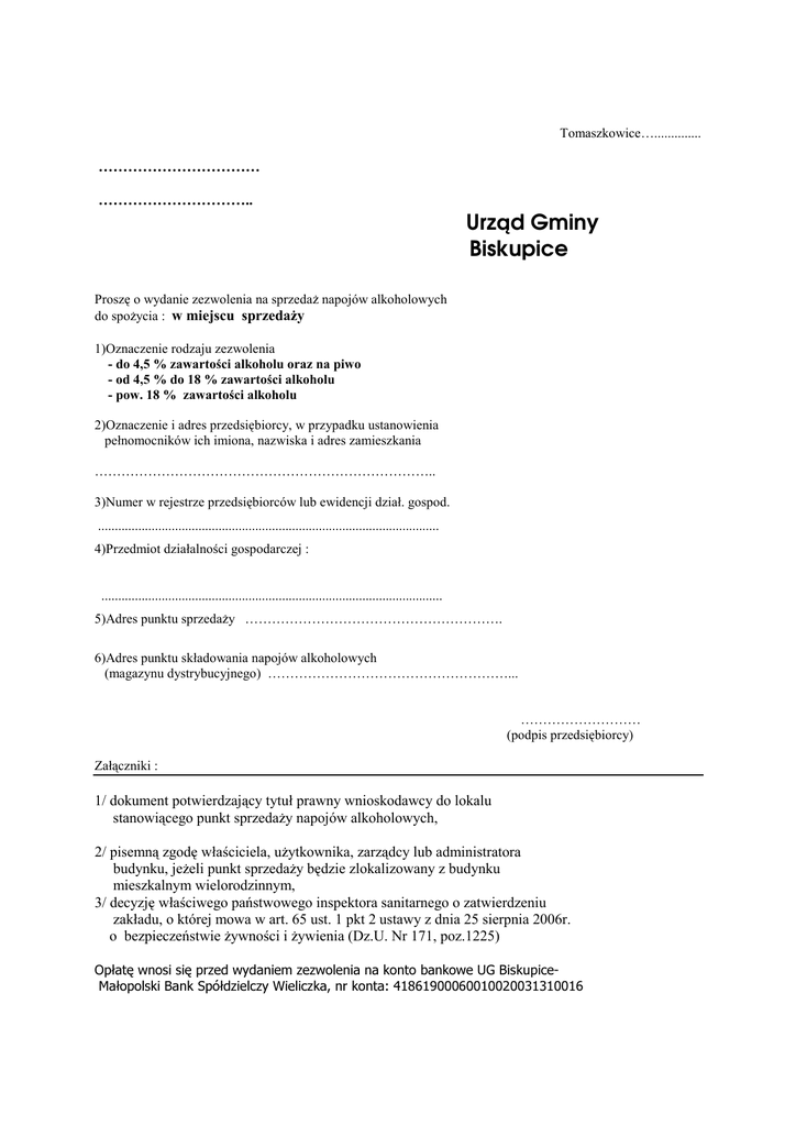 Tomaszkowice….............. …………………………… ………………………….. Urząd Gminy Biskupice Proszę o wydanie zezwolenia na sprzedaż napojów alkoholowych do spożycia : w miejscu sprzedaży 1)Oznaczenie rodzaju zezwolenia - do 4,5 % zawartości alkoholu oraz na piwo - od 4,5 % do 18 % zawartości alkoholu - pow. 18 % zawartości alkoholu 2)Oznaczenie i adres przedsiębiorcy, w przypadku ustanowienia pełnomocników ich imiona, nazwiska i adres zamieszkania ………………………………………………………………….. 3)Numer w rejestrze przedsiębiorców lub ewidencji dział. gospod. ...................................................................................................... 4)Przedmiot działalności gospodarczej : ...................................................................................................... 5)Adres punktu sprzedaży …………………………………………………. 6)Adres punktu składowania napojów alkoholowych (magazynu dystrybucyjnego) ………………………………………………... ……………………… (podpis przedsiębiorcy) Załączniki : 1/ dokument potwierdzający tytuł prawny wnioskodawcy do lokalu stanowiącego punkt sprzedaży napojów alkoholowych, 2/ pisemną zgodę właściciela, użytkownika, zarządcy lub administratora budynku, jeżeli punkt sprzedaży będzie zlokalizowany z budynku mieszkalnym wielorodzinnym, 3/ decyzję właściwego państwowego inspektora sanitarnego o zatwierdzeniu zakładu, o której mowa w art. 65 ust. 1 pkt 2 ustawy z dnia 25 sierpnia 2006r. o bezpieczeństwie żywności i żywienia (Dz.U. Nr 171, poz.1225) Opłatę wnosi się przed wydaniem zezwolenia na konto bankowe UG BiskupiceMałopolski Bank Spółdzielczy Wieliczka, nr konta: 41861900060010020031310016