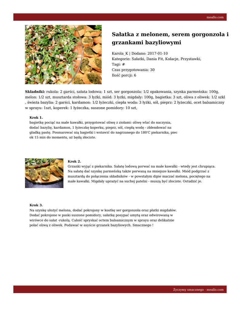meallo.com Sałatka z melonem, serem gorgonzola i grzankami bazyliowymi Karola_K | Dodano: 2017-01-10 Kategorie: Sałatki, Dania Fit, Kolacje, Przystawki, Tagi: # Czas przygotowania: 30 Ilość porcji: 6 Składniki: rukola: 2 garści, sałata lodowa: 1 szt, ser gorgonzola: 1/2 opakowania, szynka parmeńska: 100g, melon: 1/2 szt, musztarda stołowa: 3 łyżki, miód: 3 łyżki, migdały: 100g, bagietka: 3 szt, oliwa z oliwek: 1/2 szkl , świeża bazylia: 2 garści, kardamon: 1/2 łyżeczki, ciepła woda: 3 łyżki, sól, pieprz: 2 łyżeczki, ocet balsamiczny w sprayu: 1szt, koperek: 1 łyżeczka, suszone pomidory: 10 szt, Krok 1. bagietkę pociąć na małe kawałki, przygotować oliwę z ziołami: oliwę wlać do naczynia, dodać bazylię, kardamon, 1 łyżeczkę koperku, pieprz, sól, ciepłą wodę - zblendować na gładką pastę. Posmarować nią bagietki i wstawić do nagrzanego do 180'C piekarnika, piec ok 15 min do momentu, aż będą złociste. Krok 2. Grzanki wyjąć z piekarnika. Sałatę lodową porwać na małe kawałki - wtedy jest chrupiąca. Na sałatę dać szynkę parmeńską także porwaną na mniejsze kawałki. Miód podgrzać z musztardą do połączenia składników - w powstałym dipie maczać melona, pociętego na małe kawałki. Migdały uprażyć na suchej patelni - muszą być złociste. Ostudzić je. Krok 3. Na szynkę ułożyć melona, dodać pokrojony w kostkę ser gorgonzola oraz płatki migdałów. Dodać pokrojone w paski suszone pomidory, sałatkę posypać umytą oraz odwirowaną w wirówce do sałat -rukolą. Całość spryskać octem balsamicznym w sprayu oraz delikatnie polać oliwą z oliwek. Podawać w asyście grzanek bazyliowych. Smacznego ! Życzymy smacznego - meallo.com