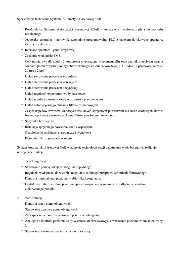 Specyfikacja techniczna Systemu Automatyki Basenowej SAB - Rozdzielnica Systemu Automatyki Basenowej RSAB - konstrukcja metalowa z płytą do montażu naściennego. - Jednostka centralna - sterownik swobodnie programowalny PLC z panelem dotykowym operatora, sterujący układami, - Interface operatora - panel dotykowy, - Zasilanie w układzie TN-S, - Cela pomiarowa dla sond - 2 komorowa wyposażona w rotametr, filtr oraz czujnik przepływu wraz z sondami pomiarowymi ( sondy: chloru wolnego, chloru całkowitego, pH, Redox ) i przetwornikami 420 mA ( 2 kpl. ) - Układ sterowania procesem koagulacji. - Sprężarka bezolejowa, Układ sterowania procesem korekcji pH. Układ sterowania procesem dezynfekcji. Układ regulacji temperatury wody basenowej. Układ regulacji poziomu wody w zbiorniku przelewowym. Układ automatycznego płukania filtrów ciśnieniowych. Zespół napędów zaworów klapowych zasilanych sprężonym powietrzem dla fasad czołowych filtrów basenowych oraz zaworów płukania filtrów sprężonym powietrzem. Instalacja sprężonego powietrza wraz z osprzętem. Okablowanie zasilające, sterownicze i sygnałowe Komputer PC z oprogramowaniem. System Automatyki Basenowej SAB w zakresie technologii stacji uzdatniania wody basenowej realizuje następujące funkcje: 1. Proces koagulacji - Sterowanie pompą dozującą koagulantu płynnego. Regulacja wydajności dozowania koagulantu w funkcji przepływu strumienia filtrowanego. Kontrola minimalnego poziomu w zbiorniku koagulantu. Dodatkowe zabezpieczenie przed nieuprawnionym dozowaniem przez odłączenie zasilania elektrycznego pompki. 2. Proces filtracji - Kontrola pracy pomp obiegowych. Sterowanie czasowe pomp obiegowych. Zabezpieczenie pomp obiegowych przed suchobiegiem. Analogowa kontrola poziomu wody w zbiorniku przelewowym ( wskazanie poziomu w cm słupa wody ). - Sterowanie zaworem uzupełniania wody świeżej. - Kontrola zużycia wody na potrzeby technologii ( dobowe oraz miesięczne ) wymaga zamontowania wodomierza z impulsatorem po stronie instalacji technologicznej - wodomierz nie jest w zakresie dostawy automatyki. - Kontrola zużycia energii elektryczne na potrzeby technologii basenowej. 3. Proces uzdatniania - Pomiar i regulacja parametrów fizykochemicznych wody, takich jak chlor wolny, pH ( regulacja P/PI, sterowanie impulsowe, PWM, ON-OFF, sterowanie dowolnym dozownikiem dezynfekcji ). - Pomiar potencjału Redox. Kontrola stopnia zużycia sond pomiarowych. Kontrola przepływu wody basenowej przez celę pomiarową. Kontrola poziomów w zbiornikach korektora pH i dezynfekatora. Ręczne sterowanie dozownikami z poziomu panelu operatorskiego np. w przypadku awarii sond lub układów pomiarowych. - Odłączenie zasilania elektrycznego dozowników w przypadku stanu alarmowego - Indywidualne nastawy sterowania oddzielnie dla każdego dozownika - funkcja pozwala na Zmniejszenie ilości załączeń co proporcjonalnie przekłada się na zwiększenie czasu eksploatacji urządzenia. - Sterowanie pracą urządzenia ozonatora. 4. Proces podgrzewania wody basenowej - Pomiar i regulacja temperatury wody w basenie. Sterowanie ręczne i automatyczne napędami układu podgrzewania wody. Sterowanie odzyskiem ciepła z OZE ( kolektory słoneczne, pompy ciepła ). Schłodzenie okresowe np. dla ograniczenia start ciepła w nocy. Kontrola współczynnika jednoczesności dla zabezpieczenia przed przekroczeniem mocy. maksymalnej. - Kontrola zużycia energii cieplnej na potrzeby. - Kontrola zużycia energii cieplnej na potrzeby technologii basenowej ( dobowe oraz miesięczne ), wymaga opomiarowania instalacji - opomiarowanie jest poza zakresem automatyki. 5. Funkcje dodatkowe - Podwójna blokada przez wyłączenie sterownika i odłączenie zasilania dozowników w przypadku stanów alarmowych. Integralną częścią SAB jest rozdzielnica elektryczna RTB, której podstawową funkcją jest rozdział zasilania, zabezpieczenie przeciw-przeciążeniowe, przeciw-zwarciowe, przeciw-porażeniowe napędów i urządzeń. Ponadto rozdzielnica elektryczna RTB uwzględniają dodatkowe założenia, dzięki którym SAB realizuje takie funkcje jak: - Sterowanie pracą pomp obiegowych. - Sterowanie pracą dmuchawy technologicznej. - Kontrolę efektywności procesu płukania filtrów oraz harmonogramu ich płukania. - Zabezpieczenie przed samoczynnym rozruchem. W skład kompletnego Systemu Automatyki Basenowej SAB wchodzą: - Rozdzielnica sterownika SAB wraz z panelem operatorskim - Rozdzielnica elektryczna RTB ( opcjonalnie we wspólnej obudowie z SAB w zależności od miejsca montażu ). - Oprogramowanie układu SAB Naczynie pomiarowe - cela 2 komorowa, wyposażona w filtr, czujnik przepływu, rotametr ( 2 kpl. ). Sonda pomiaru chloru wolnego z przetwornikiem. Sonda pomiaru chloru całkowitego z przetwornikiem. Sonda pomiaru pH z przetwornikiem. Sonda pomiaru Redox z przetwornikiem Moduł regulatora temperatury wyposażony w czujnik z przetwornikiem, układ do sterowania napędem regulacyjnym wymiennika. - Moduł regulatora poziomu wyposażony w przetwornik poziomu wody oraz napęd uzupełniania wody świeżej. - Układ kontroli poziomu w zbiorniku koagulantu - lanca ssawna z czujnikiem poziomu minimalnego. Układ kontroli poziomu w zbiorniku korektora pH - lanca ssawna z czujnikiem poziomu minimalnego. Układ kontroli poziomu w zbiorniku NaOCl - lanca ssawna z czujnikiem poziomu minimalnego Stanowisko komputerowa do wizualizacji i archiwizacji danych ( komputer PC + oprogramowanie ) Sprężarka bezolejowa z reduktorem Napędy zaworów klapowych fasad czołowych filtrów basenowych oraz zaworów dmuchawy technologicznej. - Instalacja sprężonego powietrza. - Komplet okablowania zasilającego, sterowniczego i sygnałowego łączącego urządzenia technologiczne z SAB CELA POMIAROWA + SONDY POMIAROWE - OPIS Przepływowa cela pomiarowa – podwójna, otwarta: ( 2 KPL. ) - przepływ próbki ( wolny wypływ ) ok. 30l/h (min. 12l/h) - ciśnienie wody: 0…1 bar - z