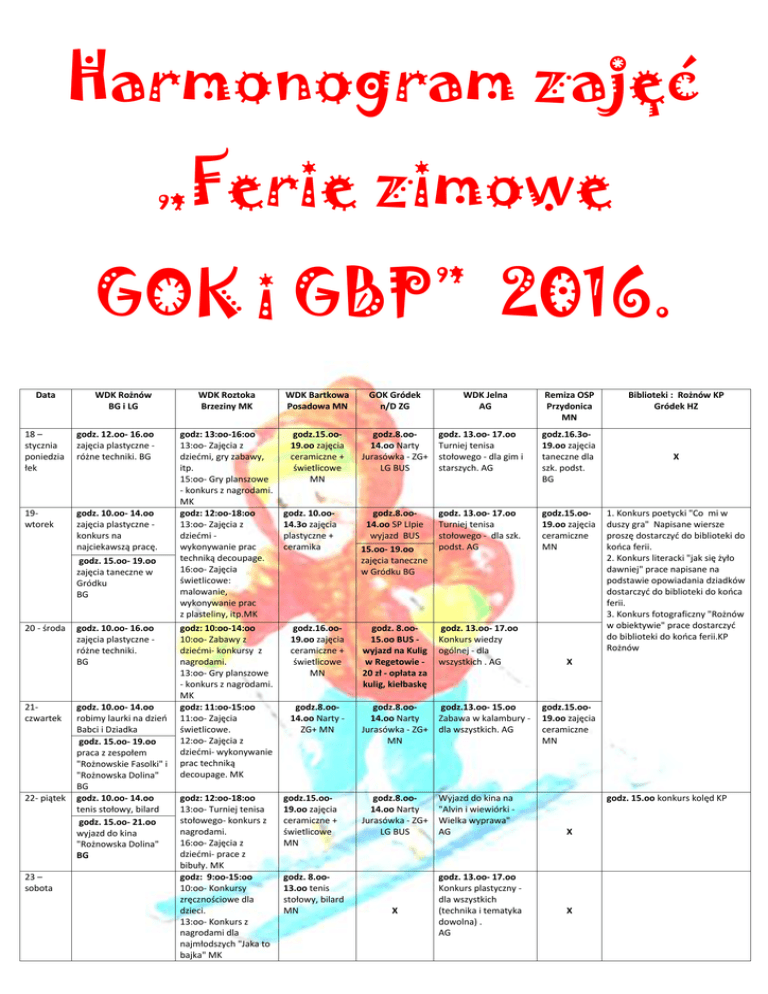 Harmonogram zajęć „Ferie zimowe GOK i GBP” 2016. Data WDK Rożnów BG i LG 18 – stycznia poniedzia łek godz. 12.oo- 16.oo zajęcia plastyczne różne techniki. BG 19wtorek godz. 10.oo- 14.oo zajęcia plastyczne konkurs na najciekawszą pracę. godz. 15.oo- 19.oo zajęcia taneczne w Gródku BG 20 - środa 21czwartek 22- piątek 23 – sobota godz. 10.oo- 16.oo zajęcia plastyczne różne techniki. BG godz. 10.oo- 14.oo robimy laurki na dzień Babci i Dziadka godz. 15.oo- 19.oo praca z zespołem "Rożnowskie Fasolki" i "Rożnowska Dolina" BG godz. 10.oo- 14.oo tenis stołowy, bilard godz. 15.oo- 21.oo wyjazd do kina "Rożnowska Dolina" BG WDK Roztoka Brzeziny MK WDK Bartkowa Posadowa MN GOK Gródek n/D ZG godz: 13:oo-16:oo 13:oo- Zajęcia z dziećmi, gry zabawy, itp. 15:oo- Gry planszowe - konkurs z nagrodami. MK godz: 12:oo-18:oo 13:oo- Zajęcia z dziećmi wykonywanie prac techniką decoupage. 16:oo- Zajęcia świetlicowe: malowanie, wykonywanie prac z plasteliny, itp.MK godz.15.oo19.oo zajęcia ceramiczne + świetlicowe MN godz.8.oo14.oo Narty Jurasówka - ZG+ LG BUS godz. 13.oo- 17.oo Turniej tenisa stołowego - dla gim i starszych. AG godz.16.3o19.oo zajęcia taneczne dla szk. podst. BG godz.8.oo14.oo SP LIpie wyjazd BUS 15.oo- 19.oo zajęcia taneczne w Gródku BG godz. 13.oo- 17.oo Turniej tenisa stołowego - dla szk. podst. AG godz.15.oo19.oo zajęcia ceramiczne MN godz.16.oo19.oo zajęcia ceramiczne + świetlicowe MN godz. 8.oo15.oo BUS wyjazd na Kulig w Regetowie 20 zł - opłata za kulig, kiełbaskę godz. 13.oo- 17.oo Konkurs wiedzy ogólnej - dla wszystkich . AG X godz.8.oo14.oo Narty ZG+ MN godz.8.oo14.oo Narty Jurasówka - ZG+ MN godz.13.oo- 15.oo Zabawa w kalambury dla wszystkich. AG godz.8.oo14.oo Narty Jurasówka - ZG+ LG BUS Wyjazd do kina na "Alvin i wiewiórki Wielka wyprawa" AG godz: 10:oo-14:oo 10:oo- Zabawy z dziećmi- konkursy z nagrodami. 13:oo- Gry planszowe - konkurs z nagrodami. MK godz: 11:oo-15:oo 11:oo- Zajęcia świetlicowe. 12:oo- Zajęcia z dziećmi- wykonywanie prac techniką decoupage. MK godz: 12:oo-18:oo 13:oo- Turniej tenisa stołowego- konkurs z nagrodami. 16:oo- Zajęcia z dziećmi- prace z bibuły. MK godz: 9:oo-15:oo 10:oo- Konkursy zręcznościowe dla dzieci. 13:oo- Konkurs z nagrodami dla najmłodszych "Jaka to bajka" MK godz. 10.oo14.3o zajęcia plastyczne + ceramika godz.15.oo19.oo zajęcia ceramiczne + świetlicowe MN godz. 8.oo13.oo tenis stołowy, bilard MN X WDK Jelna AG godz. 13.oo- 17.oo Konkurs plastyczny dla wszystkich (technika i tematyka dowolna) . AG Remiza OSP Przydonica MN Biblioteki : Rożnów KP Gródek HZ X 1. Konkurs poetycki "Co mi w duszy gra" Napisane wiersze proszę dostarczyć do biblioteki do końca ferii. 2. Konkurs literacki "jak się żyło dawniej" prace napisane na podstawie opowiadania dziadków dostarczyć do biblioteki do końca ferii. 3. Konkurs fotograficzny "Rożnów w obiektywie" prace dostarczyć do biblioteki do końca ferii.KP Rożnów godz.15.oo19.oo zajęcia ceramiczne MN godz. 15.oo konkurs kolęd KP X X 24– niedziela 25 poniedzia łek 26 wtorek godz. 15.oo Dzień Babci i Dziadka BG godz. 12.oo- 16.oo zajęcia techniczne szycie ręczne BG X godz: 13:oo-16:oo 13:oo- "Piłkarzyki"konkurs z nagrodami. 15:oo- Zajęcia świetlicowe. MK godz: 12:oo-18:oo 13:oo- Wykonywanie prac techniką decoupage. 16:oo- Konkursy zręcznościowe dla dzieci. MK godz.15.oo19.oo zajęcia ceramiczne + świetlicowe MN godz.8.oo14.oo Narty ZG+ MN godz. 10.oo- 16.oo kącik kulinarny sałatki, przekąski BG godz: 10:oo-14:oo 10:oo- Zajęcia świetlicowe. 12:oo- Robótki ręcznenauka robienia na szydełku i drutach. MK godz. 10.oo- 14.oo zajęcia techniczne kartka Walentynkowa godz. 15.oo- 20.oo dyskoteka : 15-17 dzieci 4-7 lat 17-20 pow.8 lat. BG godz. 10.oo- 14.oo tenis stołowy, bilard godz. 15.oo- 21.oo praca z zespołem i "Rożnowska Dolina" BG godz: 11:oo-15:oo 11:oo- Konkurs dla dzieci "1 z 10". 13:oo- Robótki ręczne. MK godz. 19.oo zabawa karnawałowa - płatna . informacje WDK Rożnów BG godz. 10.oo- 14.oo gry planszowe, tenis, bilard godz. 16.oo- 19.oo zajęcia taneczne w Gródku BG 27- środa 28czwartek 29 piątek 30 sobota X X X X godz. 10.oo- 14. Zajęcia komputerowe CK - ZG godz. 13.oo- 17.oo Turniej bilardu - dla gim i starszych AG godz.8.oo14.oo Narty Jurasówka - ZG+ MN godz. 16.oo- 19.oo zajęcia taneczne w Gródku BG godz. 13.oo- 17.oo Turniej bilardu - dla szk. podst. AG godz.8.oo14.oo Narty ZG+ MN godz.15.oo19.oo zajęcia ceramiczne + świetlicowe MN godz.8.oo14.oo Narty ZG+ MN godz.8.oo14.oo Narty Jurasówka - ZG+ MN godz. 13.oo- 17.oo Odkrywanie talentów za pomocą techniki zdobienia "decoupage" AG. godz.8.oo14.oo Narty Jurasówka - ZG+ MN godz. 13.oo- 15.oo C.d. prace techniką "decoupage". AG godz: 12:oo-18:oo 12:oo- Wykonywanie prac techniką decoupage. 16:oo- Gry w warcaby - konkurs z nagrodami. MK godz.8.oo14.oo Narty ZG+ MN godz.15.oo19.oo zajęcia ceramiczne + świetlicowe MN godz.8.oo14.oo Narty Jurasówka - ZG+ MN godz. 13.oo- 17.oo Konkurs gier planszowych (warcaby lub skoczki) - dla wszystkich . AG X godz: 9:oo-15:oo 10:oo- Konkursy zręcznościowe dla dzieci. 12:oo- Zajęcia świetlicowe malowanie, wycinanki, prace z plasteliny, itp. MK godz. 8.oo13.oo tenis stołowy, bilard MN godz. 13.oo- 17.oo Konkurs na najpiękniejszą rzeźbę w śniegu (może w końcu będzie :D ) lub rzeźba w plastelinie. AG X X godz.16.3o19.oo zajęcia taneczne dla szk. podst. BG godz.15.oo19.oo zajęcia ceramiczne MN X godz.15.oo19.oo zajęcia ceramiczne MN X X godz. 15.oo konkurs recytatorski "Mój ulubiony wiersz" KP Rożnów Gminna Biblioteka Publiczna w Gródku n /Dunajcem ogłasza na ferie zimowe 2016 konkursy: 1.„Książka w prezencie dla moich przyjaciół z dedykacją” Konkurs składa się z dwóch połączonych części :1. Napisz recenzję swojej ulubionej książki 2. Dołącz do niej dedykację dla bliskiej Ci osoby. W konkursie mogą brać udział uczniowie z klas I-III gimnazjów z gminy Gr