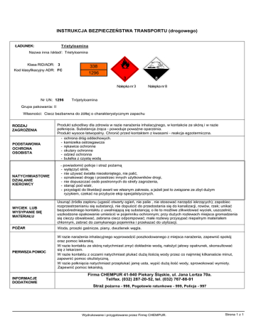 INSTRUKCJA BEZPIECZEŃSTWA TRANSPORTU (drogowego) ŁADUNEK: Trietyloamina Nazwa inna /skład/: Trietyloamina Klasa RID/ADR: 3 Kod klasyfikacyjny ADR: FC 338 1296 Nalepka nr 3 Nr UN: 1296 Nalepka nr 8 Trójetyloamina Grupa pakowania: II Własności: Ciecz bezbarwna do żółtej o charakterystycznym zapachu RODZAJ ZAGROŻENIA PODSTAWOWA OCHRONA OSOBISTA NATYCHMIASTOWE DZIAŁANIE KIEROWCY Produkt szkodliwy dla zdrowia w razie narażenia inhalacyjnego, w kontakcie ze skórą i w razie połknięcia. Substancja żrąca - powoduje poważne oparzenia. Produkt wysoce łatwopalny. Chronić przed kontaktem z kwasami - reakcja egzotermiczna. - ochrona dróg oddechowych. - kamizelka ostrzegawcza - rękawice ochronne - okulary ochronne - odzież ochronna - butelka z czystą wodą - powiadomić policje i straż pożarną - wyłączyć silnik, - nie używać światła nieosłoniętego, nie palić, - oznakować drogę i przestrzec innych użytkowników drogi, - nie dopuszczać osób postronnych do strefy zagrożenia, - stanąć pod wiatr, - przystąpić do likwidacji awarii we własnym zakresie, a jeżeli jest to związane ze zbyt dużym ryzykiem, czekać na przybycie ekip specjalistycznych. WYCIEK LUB WYSYPANIE SIĘ MATERIAŁU Usunąć źródła zapłonu (ugasić otwarty ogień, nie palie , nie stosować narzędzi iskrzących); zapobiec rozprzestrzenianiu się substancji, nie dopuścić do przedostania się do kanalizacji, rowów, rzek; unikać bezpośredniego kontaktu z uwalniającą się substancją; o ile to możliwe zlikwidować wyciek, uszczelnić, uszkodzone opakowanie umieścić w pojemniku ochronnym; przy dużych rozlewach miejsca gromadzenia się cieczy obwałować, zebrana ciecz odpompować; małe rozlewy przysypać niepalnym materiałem chłonnym, zebrać do zamykanego pojemnika i przekazać do utylizacji. POŻAR Woda, proszki gaśnicze, piany, dwutlenek węgla. PIERWSZA POMOC W razie narażenia inhalacyjnego wyprowadzić poszkodowanego z miejsca narażenia, zapewnić spokój oraz pomoc lekarską. W razie kontaktu ze skórą natychmiast zmyć dokładnie wodą, nałożyć jałowy opatrunek, skonsultować się z lekarzem. W razie kontaktu z oczami natychmiast płukać dużą ilością wody przez co najmniej kilkanaście minut, zapewnić pomoc okulistyczną. W razie połknięcia natychmiast przepłukać jamę usta, wypić dużą ilość wody, sprowokować wymioty. Zapewnić pomoc lekarską. INFORMACJE DODATKOWE Firma CHEMPUR 41-940 Piekary Śląskie, ul. Jana Lortza 70a. Tel/fax. (032) 287-20-52, tel. (032) 767-88-91 Straż pożarna - 998, Pogotowie ratunkowe - 999, Policja - 997 Wydrukowane i przygotowane przez Firmę CHEMPUR. Strona 1 z 1