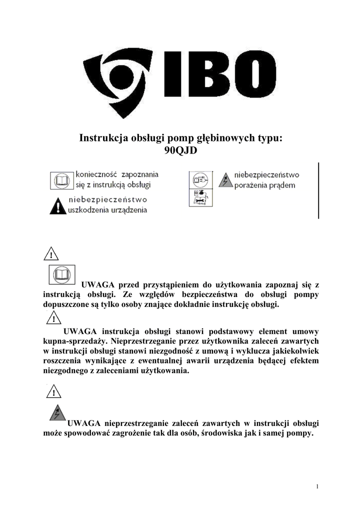 Instrukcja obsługi pomp głębinowych typu: 90QJD UWAGA przed przystąpieniem do uŜytkowania zapoznaj się z instrukcją obsługi. Ze względów bezpieczeństwa do obsługi pompy dopuszczone są tylko osoby znające dokładnie instrukcję obsługi. UWAGA instrukcja obsługi stanowi podstawowy element umowy kupna-sprzedaŜy. Nieprzestrzeganie przez uŜytkownika zaleceń zawartych w instrukcji obsługi stanowi niezgodność z umową i wyklucza jakiekolwiek roszczenia wynikające z ewentualnej awarii urządzenia będącej efektem niezgodnego z zaleceniami uŜytkowania. UWAGA nieprzestrzeganie zaleceń zawartych w instrukcji obsługi moŜe spowodować zagroŜenie tak dla osób, środowiska jak i samej pompy. 1 ZASTOSOWANIE: Pompy, których instrukcja dotyczy przeznaczone są do pompowania czystej wody z wierconych ujęć głębinowych lub podwyŜszania ciśnienia w układach wodociągowych przy zabudowie agregatu w płaszczu hermetycznym. Mogą być wykorzystywane w gospodarstwach domowych przy zaopatrzeniu w wodę, gospodarstwach rolnych przy nawadnianiu. Pompy 90QJD przeznaczone są do zamontowania na stałe w studni. Pompowana woda nie moŜe zawierać zanieczyszczeń mechanicznych. Pompa przeznaczona jest do pompowania wody bez zawartości części stałychszlifujących. Pompowanie wody zawierającej piach doprowadzi do szybkiego jej zuŜycia i w konsekwencji do awarii. W takim przypadku naprawa będzie moŜliwa tylko w trybie odpłatnym. Pompa nie jest przystosowana do przepompowywania substancji Ŝrących, łatwopalnych, o niszczących właściwościach lub wybuchowych (np.benzyna, nitro, ropa naftowa, itp.), produktów Ŝywnościowych, słonej wody. Awarie spowodowane pompowaniem tego typu cieczy nie podlegają naprawom gwarancyjnym. Maksymalna temperatura pompowanej wody wynosi 35oC. Pompa nie jest przystosowana do pompowania wody zawierającej nadmierną ilość składników mineralnych powodujących odkładanie się kamienia na elementach pompujących. UŜytkowanie pompy w takich warunkach doprowadzi do przedwczesnego zuŜycia elementów roboczych. W tym przypadku naprawa pompy będzie moŜliwa tylko w trybie odpłatnym. Pompa nie moŜe pompować wody zawierającej oleje i substancje ropopochodne. Praca pompy w takiej wodzie doprowadzi do uszkodzenia elementów gumowych np. kabla lub uszczelnień, a w efekcie do rozszczelnienia pompy i awarii silnika. W tym przypadku naprawa pompy będzie moŜliwa tylko w trybie odpłatnym. 2 INSTALACJA POMPY: Przed rozpoczęciem jakichkolwiek prac instalacyjnych naleŜy bezwzględnie odłączyć prąd zasilający. NaleŜy zabezpieczyć się przed jego przypadkowym włączeniem. Pompa musi być zamontowana w części nadfiltrowej studni. Minimalna odległość między górną krawędzią ostatniej części filtra studziennego, a dolną krawędzią silnika nie moŜe być mniejsza niŜ 30 cm. Pompa nie moŜe pracować „na sucho” bez wody. Praca „na sucho” doprowadzi do zniszczenia urządzenia. W tym przypadku naprawa będzie moŜliwa tylko w trybie odpłatnym. Aby zapobiec ewentualnej pracy na sucho naleŜy pompę zainstalować na takiej głębokości aby najniŜszy, dynamiczny poziom lustra wody (poziom lustra wody ustalony w czasie nieprzerwanego pompowania przy wolnym wypływie) był minimum 2 m powyŜej króćca tłocznego pompy. JeŜeli wydajność studni uniemoŜliwia taki montaŜ (studnia jest zbyt mało wydajna w stosunku do wydajności pompy), to naleŜy wg.wyboru: - zamontować na rurociągu tłocznym zawór ograniczający stale przepływ, - zamontować zabezpieczenie przed suchobiegiem, monitorujące poziom lustra wody i w razie niebezpieczeństwa wystąpienia pracy na sucho wyłączający dopływ prądu do agregatu. W czasie opuszczania pompy do studni naleŜy dopilnować aby kabel zasilający pompy był co max. 2m przymocowany do rury tłocznej plastikowymi opaskami. Przy, niekiedy duŜej głębokości na jakiej zainstalowana jest pompa nie przymocowany do rurociągu tłocznego kabel pod wpływem swojej wagi moŜe ulec zerwaniu. 3 Zaleca się dodatkowo podwiesić pompę na stalowej lince, tak aby w przypadku wystąpienia samorozkręcenia rurociągu tłocznego nie doszło do utopienia agregatu w studni. Bezpośrednio nad pompą naleŜy zainstalować zawór zwrotny zabezpieczający urządzenie przed uderzeniami powracającej wody. Silnik pompy wypełniony jest ekologicznym olejem. W przypadku awarii silnika moŜe dojść do wycieku oleju do studni. Przed opuszczeniem pompy do nowej studni uŜytkownik powinien upewnić się czy firma studniarska wykonująca studnię dokonała jej oczyszczenia poprzez spompowanie wody. W czasie wykonywania studni woda wewnątrz rury osłonowej i filtra ulega zanieczyszczeniu mułem i piachem. Pompowanie wody zawierającej piach zdecydowanie skraca Ŝywotność pomp głębinowych. Przy ustawianiu wyłącznika ciśnieniowego i doborze zbiornika hydroforowego, naleŜy przestrzegać zasady, Ŝe silnik pompy nie powinien się częściej włączać niŜ 30 razy na godzinę. Częstsze włączanie moŜe doprowadzić do przeciąŜenia silnika i jego awarii. Nigdy nie naleŜy sprawdzać obrotów silnika przed włoŜeniem pompy do studni. Nawet krótkotrwałe uruchomienie pompy „na sucho” moŜe doprowadzić do jej zniszczenia. PODŁĄCZENIE ELEKTRYCZNE: Sieć elektryczna z której pompa ma być zasilana powinna mieć dane znamionowe zgodne z danymi zawartymi na tabliczce znamionowej silnika. Pompa musi być podłączona do sieci z czynnym uziemieniem. Producent, oraz gwarant jest zwolniony od wszelkiej odpowiedzialności za szkody wyrządzone ludziom lub rzeczom wynikające z braku odpowiedniego uziemienia. śyła Ŝółto-zielona przewodu przyłączeniowego jest uziemiająca. Sieć elektryczna zasilająca pompę powinna być wyposaŜona wyłącznik instalacyjny, nadprądowy - silnikowy np. M611 zabezpieczający silnik przed przeciąŜeniem. Aby wyłącznik skutecznie zabezpieczał silnik przed 4 przecią