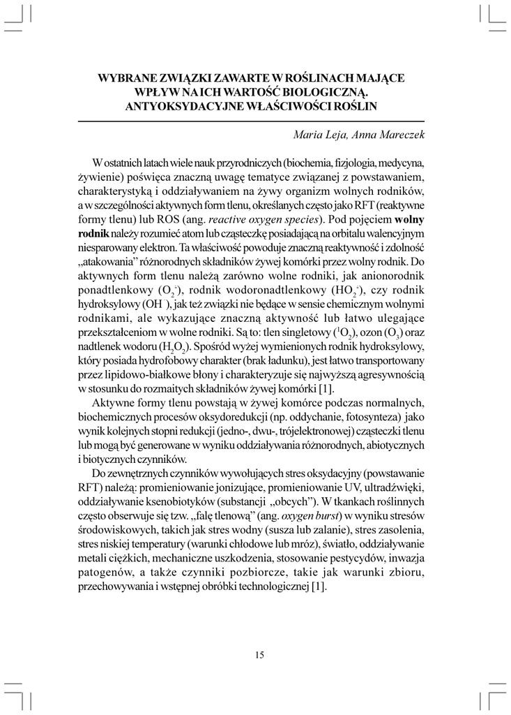 WYBRANE ZWI¥ZKI ZAWARTE W ROLINACH MAJ¥CE WP£YW NA ICH WARTOÆ BIOLOGICZN¥. ANTYOKSYDACYJNE W£ACIWOCI ROLIN Maria Leja, Anna Mareczek W ostatnich latach wiele nauk przyrodniczych (biochemia, fizjologia, medycyna, ¿ywienie) powiêca znaczn¹ uwagê tematyce zwi¹zanej z powstawaniem, charakterystyk¹ i oddzia³ywaniem na ¿ywy organizm wolnych rodników, a w szczególnoci aktywnych form tlenu, okrelanych czêsto jako RFT (reaktywne formy tlenu) lub ROS (ang. reactive oxygen species). Pod pojêciem wolny rodnik nale¿y rozumieæ atom lub cz¹steczkê posiadaj¹c¹ na orbitalu walencyjnym niesparowany elektron. Ta w³aciwoæ powoduje znaczn¹ reaktywnoæ i zdolnoæ atakowania ró¿norodnych sk³adników ¿ywej komórki przez wolny rodnik. Do aktywnych form tlenu nale¿¹ zarówno wolne rodniki, jak anionorodnik . . ponadtlenkowy (O2-), rodnik wodoronadtlenkowy (HO2-), czy rodnik . hydroksylowy (OH ), jak te¿ zwi¹zki nie bêd¹ce w sensie chemicznym wolnymi rodnikami, ale wykazuj¹ce znaczn¹ aktywnoæ lub ³atwo ulegaj¹ce przekszta³ceniom w wolne rodniki. S¹ to: tlen singletowy (1O2), ozon (O3) oraz nadtlenek wodoru (H2O2). Sporód wy¿ej wymienionych rodnik hydroksylowy, który posiada hydrofobowy charakter (brak ³adunku), jest ³atwo transportowany przez lipidowo-bia³kowe b³ony i charakteryzuje siê najwy¿sz¹ agresywnoci¹ w stosunku do rozmaitych sk³adników ¿ywej komórki [1]. Aktywne formy tlenu powstaj¹ w ¿ywej komórce podczas normalnych, biochemicznych procesów oksydoredukcji (np. oddychanie, fotosynteza) jako wynik kolejnych stopni redukcji (jedno-, dwu-, trójelektronowej) cz¹steczki tlenu lub mog¹ byæ generowane w wyniku oddzia³ywania ró¿norodnych, abiotycznych i biotycznych czynników. Do zewnêtrznych czynników wywo³uj¹cych stres oksydacyjny (powstawanie RFT) nale¿¹: promieniowanie jonizuj¹ce, promieniowanie UV, ultradwiêki, oddzia³ywanie ksenobiotyków (substancji obcych). W tkankach rolinnych czêsto obserwuje siê tzw. falê tlenow¹ (ang. oxygen burst) w wyniku stresów rodowiskowych, takich jak stres wodny (susza lub zalanie), stres zasolenia, stres niskiej temperatury (warunki ch³odowe lub mróz), wiat³o, oddzia³ywanie metali ciê¿kich, mechaniczne uszkodzenia, stosowanie pestycydów, inwazja patogenów, a tak¿e czynniki pozbiorcze, takie jak warunki zbioru, przechowywania i wstêpnej obróbki technologicznej [1]. 15 Reaktywne formy tlenu reaguj¹ ze sk³adnikami organizmów ¿ywych, co mo¿e mieæ niepo¿¹dane, a nawet grone skutki. Szczególne niebezpieczne s¹ reakcje aktywnych form tlenu z podstawowymi strukturami komórki, jak bia³ka, b³ony lipidowo-bia³kowe i kwasy nukleinowe. Zmiany spowodowane przez RFT w cz¹steczkach bia³ek, zw³aszcza enzymatycznych (modyfikacja aminokwasów, utlenienie grup SH, destrukcja struktur wy¿szych rzêdów), mog¹ prowadziæ do daleko id¹cych zaburzeñ metabolicznych. Peroksydacja lipidów wchodz¹cych w sk³ad b³on komórkowych jest szczególnie grona ze wzglêdu na ³añcuchowy charakter reakcji (nadtlenkowe rodniki kwasów t³uszczowych inicjuj¹ nastêpne reakcje peroksydacji) i prowadzi do daleko id¹cych zmian przepuszczalnoci b³on biologicznych, polegaj¹cych na obni¿eniu ich hydrofobowoci, wzrocie przepuszczalnoci dla H+, depolaryzacji b³ony i inhibicji b³onowych uk³adów enzymatycznych. Ze wzglêdu na pe³nione funkcje zwi¹zane z przekazywaniem informacji genetycznej, kwasy nukleinowe s¹ stosunkowo odporne na RFT i mog¹ byæ atakowane tylko przez rodnik hydroksylowy, co prowadzi do zniszczenia zasad azotowych, rybozy b¹d dezoksyrybozy, a tak¿e rozerwania wi¹zañ fosfodiestrowych [1]. Tkanki rolinne posiadaj¹ sprawnie funkcjonuj¹cy system obrony przed aktywnymi formami tlenu, polegaj¹cy na dzia³aniu enzymów neutralizuj¹cych RFT (dysmutaza ponadtlenkowa, katalaza, peroksydaza) oraz na interakcji z antyoksydantami. Do tych ostatnich zalicza siê kwas askorbinowy, zwi¹zki z grupy terpenoidów (karotenoidy, tokoferole), a przede wszystkim ró¿norodne polifenole. Enzym dysmutaza ponadtlenkowa, obecny w cytoplazmie, mitochondriach i chloroplastach przekszta³ca, w reakcji dysproporcjonowania, anionorodnik ponadtlenkowy w cz¹steczkê nadtlenku wodoru: . . O2- + O2- + 2H+ g H2O2 + O2 Z kolei cz¹steczka nadtlenku wodoru, nale¿¹ca do RFT, zostaje roz³o¿ona przez katalazê, enzym charakterystyczny dla peroksysomów: 2H2O2 g 2H2O + O2 lub uk³ad peroksydaz (peroksydaza askorbinianowa, peroksydaza glutationowa) wystêpuj¹cy zarówno we frakcji rozpuszczalnej, jak te¿ zwi¹zany z b³onowymi strukturami i cian¹ komórkow¹: H2O2 + AH2 g 2H2O + A Powy¿sze enzymy, nazywane czêsto enzymatyczn¹ triad¹, stanowi¹ g³ówny uk³ad zabezpieczaj¹cy komórkê przed aktywnymi formami tlenu [1]. Drobnocz¹steczkowe antyoksydanty reaguj¹ bezporednio z reaktywnymi formami tlenu lub z porednimi metabolitami reakcji oksydoredukcji, nie 16 dopuszczaj¹c do powstawania RFT. Zwi¹zki te s¹ mniej specyficzne ni¿ enzymy i st¹d s¹ zaliczane do obroñców uniwersalnych, aktywnych zarówno w fazie hydrofilowej (kwas askorbinowy), jak te¿ hydrofobowej (tokoferole, karotenoidy). Zwi¹zki fenolowe, w zale¿noci od budowy, mog¹ przejawiaæ aktywnoæ antyoksydacyjn¹ w obu fazach. Kwas askorbinowy, znany od dawna jako czynnik przeciwszkorbutowy (witamina C), posiada wysokie redukuj¹ce w³aciwoci, warunkuj¹ce antyoksydacyjn¹ aktywnoæ tego zwi¹zku w reakcji z anionorodnikiem ponadtlenkowym, nadtlenkiem wodoru, tlenem singletowym, rodnikiem hydroksylowym i innymi rodnikami nadtlenkowymi. Bogatym ród³em kwasu askorbinowego (tab.1) s¹ owoce i warzywa [2]. Tabela 1. Zawartoæ witaminy C w wybranych produktach spo¿ywczych 5RG]DMSUR 3RU]HF]NLF] .LZL 7UXVNDZNL *UHMSIUXW &\WU\Q\ $JUHVW G³ównym hydrofobowym antyoksydantem jest witamina E, stanowi¹ca mieszaninê 4 tokoferoli i 4 tokotrienoli. Zwi¹zki te uczestnicz¹ przede wszystkim w reakcjach zmiatania organicznych wolnych rodnik