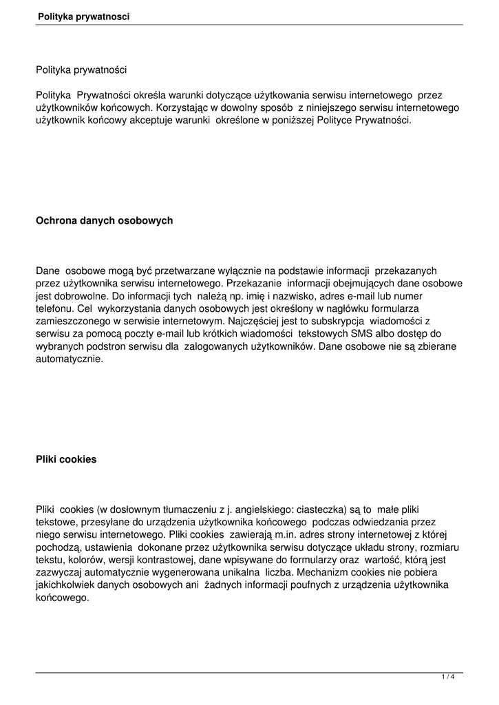 Polityka prywatnosci Polityka prywatności Polityka Prywatności określa warunki dotyczące użytkowania serwisu internetowego przez użytkowników końcowych. Korzystając w dowolny sposób z niniejszego serwisu internetowego użytkownik końcowy akceptuje warunki określone w poniższej Polityce Prywatności. Ochrona danych osobowych Dane osobowe mogą być przetwarzane wyłącznie na podstawie informacji przekazanych przez użytkownika serwisu internetowego. Przekazanie informacji obejmujących dane osobowe jest dobrowolne. Do informacji tych należą np. imię i nazwisko, adres e-mail lub numer telefonu. Cel wykorzystania danych osobowych jest określony w nagłówku formularza zamieszczonego w serwisie internetowym. Najczęściej jest to subskrypcja wiadomości z serwisu za pomocą poczty e-mail lub krótkich wiadomości tekstowych SMS albo dostęp do wybranych podstron serwisu dla zalogowanych użytkowników. Dane osobowe nie są zbierane automatycznie. Pliki cookies Pliki cookies (w dosłownym tłumaczeniu z j. angielskiego: ciasteczka) są to małe pliki tekstowe, przesyłane do urządzenia użytkownika końcowego podczas odwiedzania przez niego serwisu internetowego. Pliki cookies zawierają m.in. adres strony internetowej z której pochodzą, ustawienia dokonane przez użytkownika serwisu dotyczące układu strony, rozmiaru tekstu, kolorów, wersji kontrastowej, dane wpisywane do formularzy oraz wartość, którą jest zazwyczaj automatycznie wygenerowana unikalna liczba. Mechanizm cookies nie pobiera jakichkolwiek danych osobowych ani żadnych informacji poufnych z urządzenia użytkownika końcowego. 1/4 Polityka prywatnosci Korzystając z serwisu internetowego użytkownik końcowy wyraża zgodę na wykorzystywanie plików cookies. Użytkownik końcowy ma możliwość korzystania z serwisu internetowego bez wykorzystywania plików cookies, ale oznacza to, że niektóre funkcje serwisu nie będą działać poprawnie. Użytkownik końcowy może samodzielnie i w każdym czasie zmienić ustawienia dotyczące plików cookies, jak również może usunąć pliki cookies korzystając z dostępnych funkcji w przeglądarce internetowej, której używa. w przypadku nie wyrażenia zgody na korzystanie z plików cookies, użytkownik końcowy winien zaznaczyć w ustawieniach przeglądarki opcję odrzucania plików cookies lub sygnalizowania ich przesłania. Niniejszy serwis internetowy może stosować następujące pliki cookies: a. pliki uwierzytelniające - wykorzystywane do usług wymagających uwierzytelniania użytkownika końcowego w serwisie internetowym oraz do wykrywania nadużyć w zakresie uwierzytelniania w ramach serwisu; b. pliki statystyczne - wykorzystywane do zbierania informacji o sposobie korzystania użytkownika końcowego z serwisu internetowego; c. pliki funkcjonalne - wykorzystywane do zapamiętania wybranych przez użytkownika końcowego ustawień i personalizację interfejsu użytkownika, np. w zakresie wybranego języka, rozmiaru czcionki, wyglądu strony internetowej, itp. W celu zarządzania ustawieniami plików cookies wybierz z listy oficjalnych stron internetowych producentów najczęściej używanych przeglądarek internetowych aplikację, której używasz i postępuj zgodnie z instrukcjami producenta: - Internet Explorer - http://support.microsoft.com/ Chrome - http://support.google.com/chrome/ Safari - http://support.apple.com/ Firefox - http://support.mozilla.org/pl/ Opera - http://help.opera.com/Windows/ 2/4 Polityka prywatnosci Urządzenia mobilne: - Android - http://support.google.com/chrome/ Safari - http://support.apple.com/ Windows Phone - http://www.windowsphone.com/pl-pl/how-to/ Blackberry - http://docs.blackberry.com/en/smartphone_users/ Narzędzia i treść z innych firm Niniejszy serwis internetowy może zawierać przyciski, narzędzia lub treści kierujące do usług innych firm, m.in. Facebook (przycisk „Lubię to”), Google (Google Maps, Google Analitycs, Google Translate), Youtube (filmy), IVONA Software (webreader), Stat24 (statystyki), Payu (płatności elektroniczne). Korzystanie z aplikacji innych firm może powodować przesyłanie informacji do urządzenia użytkownika końcowego przez zewnętrzny podmiot. Informacji na temat wykorzystania plików cookies przez zewnętrzne aplikacje należy szukać w polityce prywatności danego podmiotu. Prawa autorskie Zawartość serwisu internetowego (teksty, grafiki, muzyka, filmy) oraz wszystkie jej fragmenty a także mechanizmy i oprogramowanie używane w serwisie internetowym są objęte ochroną, wynikającą z przepisów polskiego i międzynarodowego prawa autorskiego. Zgodnie z przepisami prawa autorskiego oraz przepisami o ochronie baz danych, użytkownik końcowy otrzymuje niewyłączną, ograniczoną licencję na korzystanie z serwisu wyłącznie w celach prywatnych, bez możliwości samodzielnego pobierania lub zapisywania stron oraz 3/4 Polityka prywatnosci dokonywania ich modyfikacji. Użytkownik końcowy serwisu internetowego, bez zgody właściciela serwisu nie posiada prawa do odsprzedaży lub wykorzystania w celach komercyjnych serwisu internetowego i jego zawartości. Właściciel serwisu internetowego udziela ograniczonego, odwoływalnego, niewyłącznego prawa do tworzenia linku do serwisu internetowego, o ile nie przedstawia on właściciela serwisu w sposób fałszywy, mylący i niezgodny z prawdą. Wykorzystanie niniejszego serwisu internetowego w sposób, który naruszałby w/w warunki albo wszelkie obowiązujące prawa lub przepisy, a także w sposób, który powoduje albo może spowodować uszkodzenie serwisu internetowego, przerwę lub zakłócenia w pracy jest zabronione. 4/4