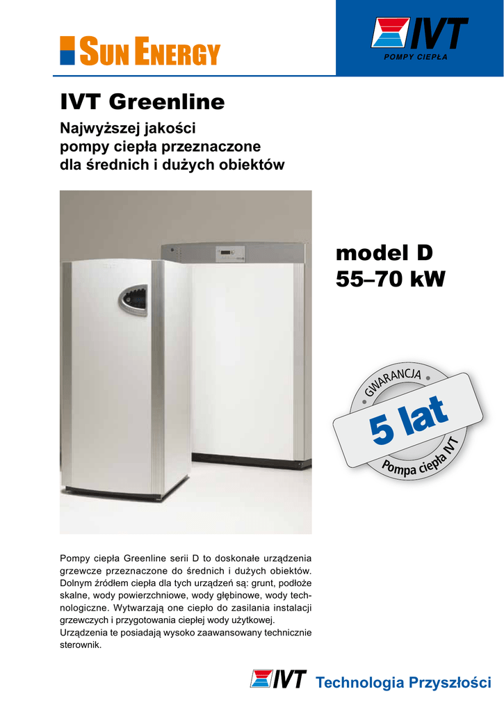 IVT Greenline Najwyższej jakości pompy ciepła przeznaczone dla średnich i dużych obiektów ANCJA • AR W t a 5l IV T •G model D 55–70 kW Pom ciepła pa Pompy ciepła Greenline serii D to doskonałe urządzenia grzewcze przeznaczone do średnich i dużych obiektów. Dolnym źródłem ciepła dla tych urządzeń są: grunt, podłoże skalne, wody powierzchniowe, wody głębinowe, wody technologiczne. Wytwarzają one ciepło do zasilania instalacji grzewczych i przygotowania ciepłej wody użytkowej. Urządzenia te posiadają wysoko zaawansowany technicznie sterownik. Technologia Przyszłości Dane techniczne serii Greenline D IVT – skandynawski lider w produkcji pomp ciepła Firma IVT jest czołowym producentem pomp ciepła w Skandynawii. Oferuje szeroką gamę urządzeń prze znaczonych dla różnorodnych obiektów użytkowych. Ciągły wkład firmy IVT w badania naukowe i ciągłe dążenie do doskonałości sprawiają, że produkowane pompy ciepła serii Greenline osiągają najlepsze wskaź niki energetyczne. MODEL GREENLINE j.m. D55 D70 Wydajność cieplna pompy ciepła przy parametrach 0/35o C1 kW 54,8 67,8 Napędowa moc elektryczna przy parametrach 0/35o C1 kW 13,5 16,7 Wydajność cieplna pompy ciepła przy parametrach 0/50o C1 kW 55,6 69,8 Napędowa moc elektryczna przy parametrach 0/50o C1 kW 17,7 22,3 Nominalny przepływ nośnika ciepła źródła górnego (skraplacz) dm3/s 1,40 1,73 Nominalny przepływ nośnika ciepła źródła dolnego (parownik) dm3/s 3,16 3,95 Maksymalny zewnętrzny spadek ciśnienia w instalacji c.o. kPa 30 40 Maksymalny zewnętrzny spadek ciśnienia w instalacji dolnego źródła ciepła kPa 70 90 Maksymalne ciśnienie w instalacji górnego źródła bar 4,03 Maksymalne ciśnienie w instalacji dolnego źródła bar 4,03 C od -5 do +20 Napięcie zasilania V 400 V, trójfazowe Prąd znamionowy zabezpieczenia A 40 50 Zalecane zabezpieczenia sprężarki A 35 42 Zakres temperatur pracy dolnego źródła ciepła o Typ sprężarki Prąd rozruchowy spiralna A 152 164 Króćce przyłączeniowe górnego źródła ciepła – Cu mm 42 42 Króćce przyłączeniowe dolnego źródła ciepła – Cu mm 54 54 Pompa obiegowa górnego i dolnego źródła ciepła wyposażenie standardowe Zabezpieczenie elektryczne i termiczne sprężarki, pomp obiegowych i centrali sterującej wyposażenie standardowe C +55 Maksymalna temperatura na zasilaniu o Masa czynnika roboczego R407C kg 9,2 9,8 Masa całkowita urządzenia kg 490 510 Wymiary gabarytowe mm 950 x 750 x 1520 1 – wydajność cieplna wyznaczona została przy parametrach 0/35 i 0/50 zgodnie ze standardem europejskim EN 255 (bez pomp obiegowych) 2 – bezpiecznik topikowy lub automatyczny klasy D 3 – maksymalne ciśnienie instalacji górnego żródła jest zależne od ciśnienia pracy c.w.u. Przyjmuje się iż jest to 1,5 i 3,0 bar 4 – trójstopniowa praca dogrzewacza - 6,7 kW / 11,3 kW / 18,0 kW 80-557 Gdańsk • ul. Narwicka 2G tel./fax 58 344 66 90 www.sunenergy.pl e-mail: [email protected]