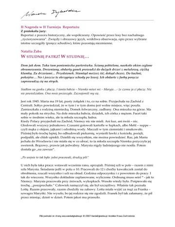 II Nagroda w II Turnieju Reportażu Z protokołu jury: Reportaż z pozoru historyczny, ale współczesny. Opowieść przez losy bez nachalnego „życiorysowania”. Zwięzły i obrazowy język, wnikliwa obserwacja, opis przez wybrane istotne szczegóły (poręcz schodów), które pozostają niezmienne. Natalia Żaba W STUDNIĘ PATRZ! W STUDNIĘ… Dom jak dom. Taka tam poniemiecka parterówka. Ściany pobielone, naokoło okien ceglane obramowania. Drewniany, obdarty ganek prowadzi do dużych drzwi z metalową, ciężką klamką. Za drzwiami… Przedsionek. Stamtąd możesz iść, dokąd chcesz. Do kuchni, pokojów… No i jeszcze te skrzypiące schody po lewej. Ich obdarte z farby poręcze zaprowadzą cię na strych. Siadłam na ganku i płaczę. I tamta babcia – Niemka mówi mi: - Maryja…- że czemu ja ci płaczę. Nic nie powiedziałam. Ona mnie pocieszyła. Zaznajomili my się. Jest rok 1945. Maria ma 19 lat, pusty żołądek i to, co na sobie. Przyjechała na Zachód z Centrali. Sołtys powiedział, że w tym i w tym domu jest wolne miejsce, więc poszła. Zamieszkała z rodziną niemiecką. Domek folwarczny, zadbany. Ona mieszka na górze. Ma mały pokoik na strychu. Na dole mieszka babcia, dziadek, ich córka z mężem. Facet taki sobie w średnim wieku, ale ta młoda szczupła, ładna. Kiedy Polacy przyjechali na Zachód, Niemcy nic nie mieli. Ani kur, ani świń – nic. Głodowali wszyscy jednakowo. Czasami gotowali kartofle w łupkach, albo Mehl – suppe – czyli mąka z olejem, jajkami i odrobiną wody. Maczali w tym ziemniaki i smakowało. Później było trochę lepiej, bo odbudowali piekarnię, wynieśli ławki z kościoła, pocięli, podpalili, ale chleb upiekli. Dzielili się wszystkim, nie można powiedzieć. Raz, jak Maria jechała do Wrocławia i nie miała się w co ubrać, to ta młoda szczupła Niemka pożyczyła jej sweterek. Brązowy, prawie jak jedwabny. Marysia nigdy ładniejszego nie nosiła. Potem dostała go „na zawsze”. „Po wojnie to tak było: jedni pracowali, drudzy pili” U nich była taka praca: wstawali wcześnie rano, oprzątali. Później szli w pole – razem z nimi szła Marysia. Śniadanie jedli w polu o 10. Pracowali do 12 i choćby kawałeczek został do obrobienia, rzucali wszystko i szli na obiad. Godzina odpoczynku i z powrotem do pracy. I tak do wieczora. Wszystko dokładnie zaplanowane, wyliczone. Ordnung muss sein! * - jak to Niemcy. Marysia pracowała przy żniwach, wykopkach. Wesoło wtedy było. Pośpiewało się trochę, „poszprechało.” Człowiek namęczył się, ale był szczęśliwy. Właśnie tak poznała Lottę. Razem pracowały, razem chodziły na zabawy. Lotta miała wyjść za mąż za Franka – szwagra Maryśki. Nie wyszło, bo jej rodzice się nie zgodzili. Franek był tak załamany, że pił przez miesiąc, dzień w dzień. Potem jakoś mu przeszło. Plik pochodzi ze strony www.wandadybalska.pl. § 2007 WandaDybalska.pl. Wszelkie Prawa Zastrzeπone. Ale za to imprezy były przednie. Chłopaki przychodzili, na organkach pograli, pośpiewali – niejedna dziewczyna głowę traciła. Mówić po niemiecku mało kto umiał – jakieś tam półsłówka każdy. „Lotta kamm – ja zawsze. A ona mówi: Maryja! Ona po swojemu, ja po swojemu, o: Milch, Saltz, Brot, lieben, schlafen**… To najważniejsze słowa były. Jak się kogoś po prostu lubi, to nie trzeba znać wielu słów, żeby mu o tym powiedzieć.” Stypy też się zdarzały. Marysia pamięta, jak zmarła dwudziestoletnia dziewczyna. Na pogrzeb przyszli Niemcy i Polacy. Msza była w ewangelickim kościele. Świątynia wielka, z dzwonnicą. Później wszystko rozkradli. Polacy dywany, Niemcy ławki na opał. Po wojnie tak bywało. Na pogrzebie dużo osób było. Niemcy śpiewali głośno, Polacy cicho siedzieli. Do komunii też nie szli, ale byli, płakali. Grób wykopano wymiarowo, przystrojono gałązkami świerków czy może innymi. Smutno było – jak to na pogrzebach. „Wyjedź od najlepszej koleżanki czy kolegi to masz uczucie bardzo głębokie, głębsze od studni – westchnienie” Nadeszły zawiadomienia z gminy, że Niemcy muszą wyjechać. Każdy mógł zabrać tylko podręczny bagaż. Polacy odwozili ich na wozach do pobliskiej stacji kolejowej. Ruscy przyjechali. Zabierali ich meble, cały dobytek. Lotta i inni Niemcy bali się, że wywożą ich nie wiadomo gdzie, że ich zabiją. Rozstanie było ciężkie. „Przyszła ona do mnie i mówi auf Wiedersehen***. Do widzenia, moja droga. Ucałowałyśmy się mocno i wywieźli moją Lottę.” Lotta i Maria spotkały się ponownie po kilkudziesięciu latach. Tyle było do opowiedzenia, gdyby to jeszcze człowiek znał język… Obie miały już dzieci, mężów. Marysia pokazała przyjaciółce, co udało jej się zrobić przez te lata. O złych rzeczach nie mówiła, bo po co. Tak samo Lotta. Poniemiecka parterówka dalej stoi, jak stała. Drewniany ganek jest trochę bardziej podniszczony, ale drzwi, do których prowadzi, otwierają się nadal za pomocą ciężkiej, metalowej klamki. Trudno je otworzyć przyzwyczajonym do nowoczesnych wynalazków gościom. Na strych prowadzą schody o krętych, drewnianych poręczach… *- porządek musi być ** - mleko, sól, chleb, kochać, spać *** - do widzenia, żegnaj Natalia Żaba, uczennica IV Liceum Ogólnokształcącego we Wrocławiu, nauczyciel Robert Chmielewski. Plik pochodzi ze strony www.wandadybalska.pl. § 2007 WandaDybalska.pl. Wszelkie Prawa Zastrzeπone.
