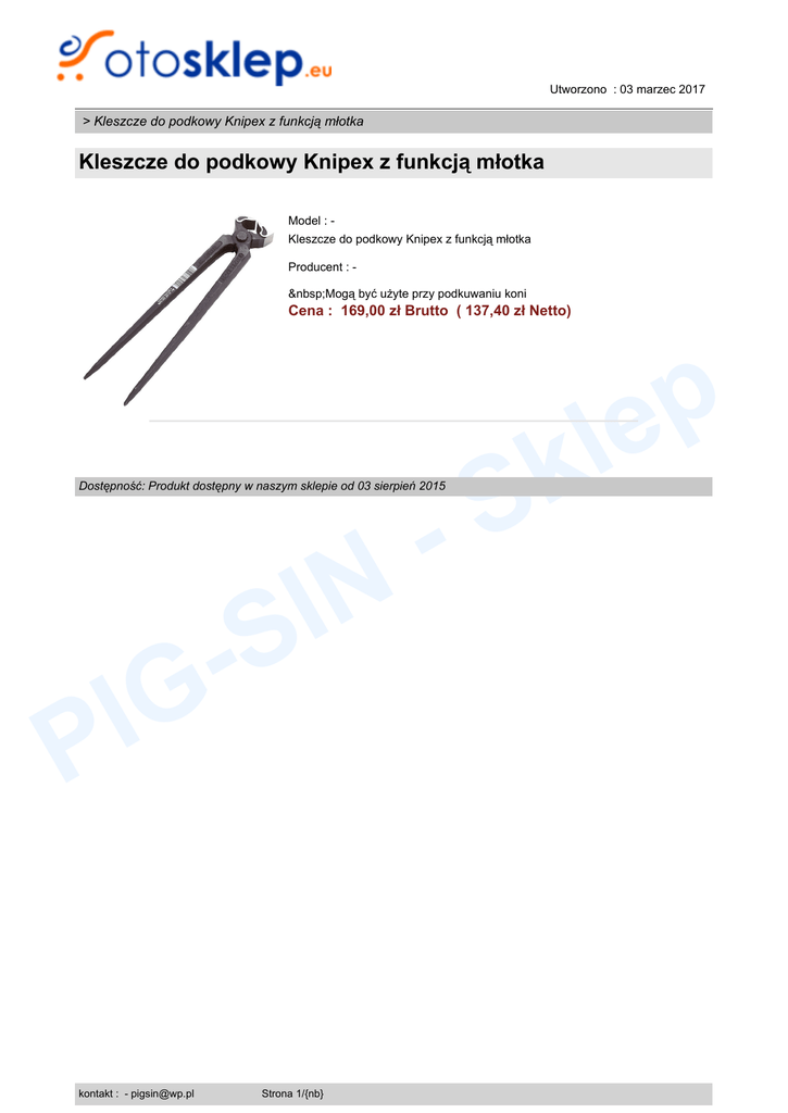 Utworzono : 03 marzec 2017 > Kleszcze do podkowy Knipex z funkcją młotka Kleszcze do podkowy Knipex z funkcją młotka Model : Kleszcze do podkowy Knipex z funkcją młotka Producent : Mogą być użyte przy podkuwaniu koni Cena : 169,00 zł Brutto ( 137,40 zł Netto) Dostępność: Produkt dostępny w naszym sklepie od 03 sierpień 2015 G I P kontakt : - [email protected] N I -S Strona 1/{nb} p e l k S