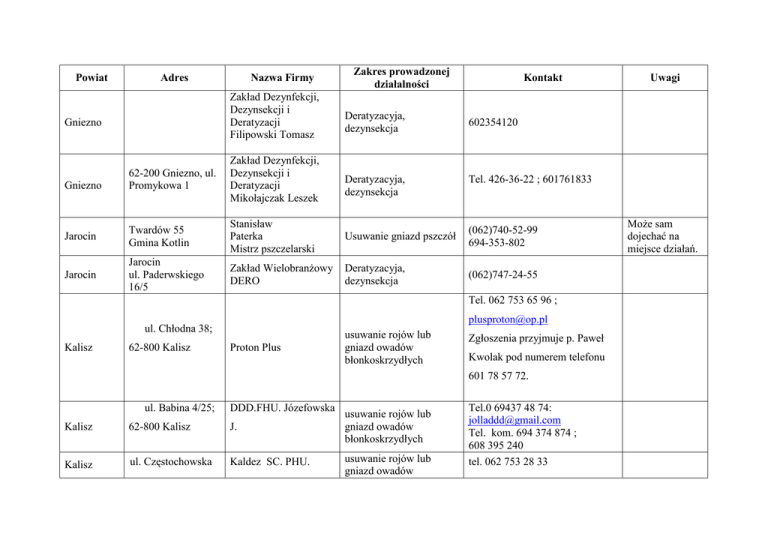 Powiat Adres Nazwa Firmy Zakład Dezynfekcji, Dezynsekcji i Deratyzacji Filipowski Tomasz Gniezno Zakres prowadzonej działalności Deratyzacyja, dezynsekcja Kontakt 602354120 62-200 Gniezno, ul. Promykowa 1 Zakład Dezynfekcji, Dezynsekcji i Deratyzacji Mikołajczak Leszek Jarocin Twardów 55 Gmina Kotlin Stanisław Paterka Mistrz pszczelarski Usuwanie gniazd pszczół (062)740-52-99 694-353-802 Jarocin Jarocin ul. Paderwskiego 16/5 Zakład WielobranŜowy DERO Deratyzacyja, dezynsekcja (062)747-24-55 Gniezno Deratyzacyja, dezynsekcja Tel. 426-36-22 ; 601761833 Tel. 062 753 65 96 ; [email protected] ul. Chłodna 38; Kalisz 62-800 Kalisz Proton Plus usuwanie rojów lub gniazd owadów błonkoskrzydłych Zgłoszenia przyjmuje p. Paweł Kwolak pod numerem telefonu 601 78 57 72. ul. Babina 4/25; DDD.FHU. Józefowska Kalisz 62-800 Kalisz J. usuwanie rojów lub gniazd owadów błonkoskrzydłych Kalisz ul. Częstochowska Kaldez SC. PHU. usuwanie rojów lub gniazd owadów Uwagi Tel.0 69437 48 74: [email protected] Tel. kom. 694 374 874 ; 608 395 240 tel. 062 753 28 33 MoŜe sam dojechać na miejsce działań. 221; 62-800 Kalisz Hurtownia chemiczna błonkoskrzydłych czynny od ul. 3 Maja 13a; 62Kalisz 800 Kalisz Regionalny Związki Pszczelarzy Wielkopolski Południowej z siedzibą w Kaliszu pszczelarze – usuwanie gniazd pszczół 41/8 Jerzy Śpiewak tylko pszczoły tel.: 662 105 872 Władysław Zabłocki usuwanie rojów lub gniazd owadów błonkoskrzydłych (062) 58 10 081 Wieruszów ul. Kępno Koło Koło Konin Kępińska 12/4 Borki Ul. Polna 8 62-600 Koło Kolasa Joanna. Zakład dezynfekcji i deratyzacji Usuwanie os. pszczół, szerszeni P.U.H. "KAJA" Usuwanie os. pszczół, szerszeni Konin, ul. 11-go Listopada 34/44 PHU „TERMIT” Usuwanie zagroŜeń owadów błonkoskrzydłych (osy, szerszenie), deratyzacja, dezynsekcja, dezynfekcja śychlin, ul. Jodłowa 7 gm. St. Miasto W. Jesiołowski, Usługi pszczelarskie Usuwanie gniazd pszczół. Ul. Spółdzielców 31/1 62-510 Konin poniedziałku do [email protected] piątku w godz. 8-16 Kępno ul. Rynek Kępno tel. 062 757 44 85; 607058523 (063)222-94-00 608-180-048 604-084-478 Tel. kom.: 604 226 353; dom.: 063 245 10 10. Tel. kom.:. 609 205 861 dom. 063 244 25 58 Konin Konin, ul. Aleje 1go Maja 8/7 Bogdan Kaniewski, Usługi pszczelarskie Usuwanie gniazd pszczół. Tel. kom.: 606 922 565 Konin Konin, ul. Szeligowskiego3/63 Jan Czeszejko, Usługo pszczelarskie Usuwanie gniazd pszczół oraz zagroŜeń od os i szerszeni. Konin Sługocinek 14, gm. Golina Konin Konin Leszno Nowy Tomyśl Nowy Tomyśl Nowy Tomyśl Lubstów, ul. Jeziorna 9a gm. Sompolno Dębowiec, ul. Towarzystwo 3 gm. Wilczyn 64-100 Leszno, Mariusz Wojciechowski Usługi Pszczelarskie Usuwanie gniazd pszczół. Tel. kom. 668 005 775 Andrzej Rzeźnik Usługi pszczelarskie Usuwanie gniazd pszczół, istnieje moŜliwość usunięcia os i szerszeni. Tel. kom. 605 516 428 Jacek Biernacki Usługi pszczelarskie Usuwanie gniazd pszczół Tel. kom. 607 107 413 Higiena ul. Sanitarna Holenderska 9/6 Piotr Skorupiński Usługowy zakład dezynfekcji, ul. Poznańska 36 / 1, dezynsekcji, 64 – 300 Nowy deratyzacji. Tomyśl Leszek Garski Specjalistyczny Zakład ul. Piłsudzkiego 47 / DDD. 1, 64 – 300 Nowy Paweł Słaboszewski Tomyśl Chojniki 24, 64 – 300 Nowy Tomyśl Tel. kom. 691 533 140. dom: 063 244 96 34 Praca: 063 247 46 17 Specjalistyczny Zakład Dezynfekcji, Dezynsekcji i Tel. (065) 5261606, tel. Usuwanie os i szerszeni kom. 0605871707 działa równieŜ Deratyzacyja, dezynsekcja Usuwanie os i szerszeni Deratyzacyja, dezynsekcja domowy: 0614422045, kom: 603327197, 608404457. kom. 510879910. tel/fax – 0614424096 kom. 660418753, 606335880 na terenie Grodziska Wlkp. Deratyzacji „ BLEGS ” Nowy Tomyśl Nowy Tomyśl Nowy Tomyśl Nowy Tomyśl Nowy Tomyśl Nowy Tomyśl Nowy Tomyśl pl. Chopina 17, 64 – Wichert Jacek 300 Nowy Tomyśl os. S. Batorego 50 / Świderski Henryk 8, 64 -300 Nowy Tomyśl os. S. Batorego 41, 64 – 300 Nowy Kasper Michał Tomyśl Nowy Tomyśl os. S. Batorego 33 / Gola Zbigniew 3 ul. Wybudowanie Poł. 15, Wąsowo Opalenica Nowy Tomyśl ul. Powstańców Wlkp. 64 – 310 Lwówek Oborniki Poznań, Os. Zwycięstwa 9i Oborniki Poznań, ul. Taczaka18 Oborniki Piechowiak Bronisław Poznań, ul. Jagodowa 20 Rogal Alfons Bartkowiak Dariusz Jarnot Kazimierz SPEC ROBALEX Leszek Pranke pszczelarz pszczelarze – usuwanie gniazd pszczół domowy: 0614422568, kom: 505019957. pszczelarze – usuwanie gniazd pszczół domowy: 0612913004, kom: 880534309. pszczelarze – usuwanie gniazd pszczół domowy: 0614423179, kom: 501375398 pszczelarze – usuwanie gniazd pszczół domowy: 0614428118. pszczelarze – usuwanie gniazd pszczół domowy: 0614425346, kom: 602252437. pszczelarze – usuwanie gniazd pszczół pszczelarze – usuwanie gniazd pszczół pszczelarze – usuwanie gniazd pszczół Usuwanie wszystkich owadów błonkoskrzydłych Usuwanie wszystkich owadów błonkoskrzydłych Usuwanie wszystkich owadów błonkoskrzydłych domowy: 0614472926. domowy: 0614479210, kom: 603075030. kom: 783567511 602814648 603124380 609490798 061-8798013 Oborniki Luboń, ul. Kościuszki 51/10 Oborniki Gorzewo Ostrów Wlkp. ul. Nałkowskiej 18, 63-400 Ostrów Wielkopolski Ostrzeszów Ostrzeszów ul. Jana Kochanowskiego 4 Ostrzeszów Ostrów Wlkp. ul. Nałkowskiej 18 Piła Piła ul. ul. Dąbrowskiego 87 Piła Piła ul. Śniadeckich 5 c/4 Piła Kruszewo ul. Towarowa 6 Poznań Poznań, ul. Raszkowska 3/4 RAPIDO Zbąszyniak Henryk - pszczelarz Dezynfekcja, Dezynsekcja i Deratyzacja. Andrzej Kubik Usuwanie wszystkich owadów błonkoskrzydłych 601731267 061-8103138 Usuwanie pszczół 695713056 067-2837722 Dezynfekcja, Dezynsekcja Deratyzacja i tel. 062 738 – 32 – 50, 608 – 475 – 195 osoba prywatna Dezynfekcja, Dezynsekcja i Deratyzacja. Andrzej Kubik CIMEX Specjalistyczny Zakład Dezynfekcji, Dezynsekcji i Deratyzacji Specjalistyczny Zakład Dezynfekcji Dezynsekcji i Deratyzacji Jerzy Spychała chemi