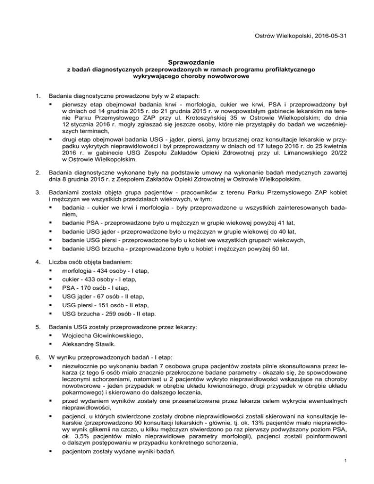 Ostrów Wielkopolski, 2016-05-31 Sprawozdanie z badań diagnostycznych przeprowadzonych w ramach programu profilaktycznego wykrywającego choroby nowotworowe 1. Badania diagnostyczne prowadzone były w 2 etapach: pierwszy etap obejmował badania krwi - morfologia, cukier we krwi, PSA i przeprowadzony był w dniach od 14 grudnia 2015 r. do 21 grudnia 2015 r. w nowopowstałym gabinecie lekarskim na terenie Parku Przemysłowego ZAP przy ul. Krotoszyńskiej 35 w Ostrowie Wielkopolskim; do dnia 12 stycznia 2016 r. mogły zgłaszać się jeszcze osoby, które nie przystąpiły do badań we wcześniejszych terminach, drugi etap obejmował badania USG - jąder, piersi, jamy brzusznej oraz konsultacje lekarskie w przypadku wykrytych nieprawidłowości i był przeprowadzany w dniach od 17 lutego 2016 r. do 25 kwietnia 2016 r. w gabinecie USG Zespołu Zakładów Opieki Zdrowotnej przy ul. Limanowskiego 20/22 w Ostrowie Wielkopolskim. 2. Badania diagnostyczne wykonane były na podstawie umowy na wykonanie badań medycznych zawartej dnia 8 grudnia 2015 r. z Zespołem Zakładów Opieki Zdrowotnej w Ostrowie Wielkopolskim. 3. Badaniami została objęta grupa pacjentów - pracowników z terenu Parku Przemysłowego ZAP kobiet i mężczyzn we wszystkich przedziałach wiekowych, w tym: 4. 5. 6. badania - cukier we krwi i morfologia - były przeprowadzone u wszystkich zainteresowanych badaniem, badanie PSA - przeprowadzone było u mężczyzn w grupie wiekowej powyżej 41 lat, badanie USG jąder - przeprowadzone było u mężczyzn w grupie wiekowej do 40 lat, badanie USG piersi - przeprowadzone było u kobiet we wszystkich grupach wiekowych, badanie USG brzucha - przeprowadzone było u kobiet i mężczyzn powyżej 50 lat. Liczba osób objęta badaniem: morfologia - 434 osoby - I etap, Wojciecha Głowinkowskiego, niezwłocznie po wykonaniu badań 7 osobowa grupa pacjentów została pilnie skonsultowana przez lekarza (z tego 5 osób miało znacznie przekroczone badane parametry - okazało się, że spowodowane leczonymi schorzeniami, natomiast u 2 pacjentów wykryto nieprawidłowości wskazujące na choroby nowotworowe - jeden przypadek w obrębie układu krwionośnego, drugi przypadek w obrębie układu pokarmowego) i skierowano do dalszego leczenia, cukier - 433 osoby - I etap, PSA - 170 osób - I etap, USG jąder - 67 osób - II etap, USG piersi - 151 osób - II etap, USG brzucha - 259 osób - II etap. Badania USG zostały przeprowadzone przez lekarzy: Aleksandrę Stawik. W wyniku przeprowadzonych badań - I etap: przed wydaniem wyników zostały one przeanalizowane przez lekarza celem wykrycia ewentualnych nieprawidłowości, pacjenci, u których stwierdzone zostały drobne nieprawidłowości zostali skierowani na konsultacje lekarskie (przeprowadzono 90 konsultacji lekarskich - głównie, tj. ok. 13% pacjentów miało nieprawidłowy wynik glikemii na czczo, u kilku mężczyzn stwierdzono po raz pierwszy podwyższony poziom PSA, ok. 3,5% pacjentów miało nieprawidłowe parametry morfologii), pacjenci zostali poinformowani o dalszym postępowaniu w przypadku konkretnego schorzenia, pacjentom zostały wydane wyniki badań. 1 7. W wyniku przeprowadzonych badań - II etap - stwierdzono następujące zmiany: Rodzaj zmiany Kamica pęcherzyka żółciowego Torbiele wątroby Naczyniak wątroby Stłuszczenie wątroby Kamica nerkowa Torbiele nerki Angiomyolipoma Powiększenie prostaty Torbiel piersi Włókniak piersi Tłuszczak piersi Lity guz - podejrzenie nowotworu piersi Żylaki powrózka nasiennego Torbiele najądrza Microcalcinosis testis 8. Liczba 17 5 3 96 8 18 1 20 34 5 3 1 1 3 2 % 6,5 1,9 1,15 36 3 6,9 0,4 7,7 22,5 1,9 2 0,66 1,5 4,5 3 W organizacji przeprowadzenia badań profilaktycznych wzięło udział 4 wolontariuszy z terenu Parku Przemysłowego ZAP. Opracowała: Małgorzata Fischer 2