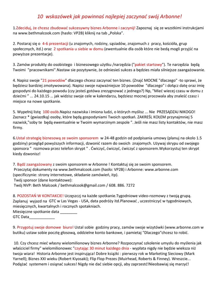 10 wskazówek jak powinnaś najlepiej zaczynać swój Arbonne! 1.Zdeciduj, że chcesz zbudować sukcesywny biznes Arbonne i zaczynij! Zapoznaj się ze wszstkimi instrukcjami na www.bethmalcook.com (hasło: VP2B) kliknij na tab „Polska”. 2. Postaraj się o 4‐6 prezentacji (u znajomych, rodziny, sąsiadów, znajomuch z pracy, kościóła, grup społecznych, itd.) oraz 2 spotkania u siebie w domu (ewentualnie dla osób które nie bedą mogli przyjść na powyższe prezentacje). 3. Zamów produkty do osobistego i biznesowego użytku /narzędzia ("pakiet startowy”). Te narzędzia będą Twoimi "pracownikami".Nastaw sie pozytywnie, że odniesieś sukces a będzies miała silniejsze zaangażowanie. 4. Napisz swoje "21 powodów" dlaczego chcesz zaczynać ten biznes. (Znajć MOCNE "dlaczego" ‐to sprawi, że będziesz bardziej zmotywowana). Napisz swoje najważniejsze 10 powodów "dlaczego" i dołącz datę oraz imię gospodyni do każdego powodu (czy jesteś gotówa zrezygnować z jednego?) Np, "Mieć wiecej czasu w domu z dziećmi ” ... 24.10.15 … jak widzisz swoje cele w kalendarzu, będziesz mocnej procowala aby znaleść czasz i miejsce na nowe spotkanie. 5. Wypełnij listę 100 osób.Napisz nazwiska i imiona ludzi, o których myślisz ... Nie PRZESĄDZAJ NIKOGO! Zaznacz * (gwiazdką) osoby, które będą gospodyniami Twoich spotkań. ZAKREŚL KOŁEM przynajmniej 5 nazwisk,"soby te będą ewentualnie w Twoim wymarzinym zespole ”. Jeśli nie masz listy kontaktów, nie masz firmy. 6.Ustal strategię biznesową ze swoim sponsorem w 24‐48 godzin od podpisania umowy (planuj na okolo 1.5 godziny) przegląd powyższych informacji, dzwonić razem do swoich znajomych. Używaj skrypu od swojego sponsora " rozmowa przez telefon skrypt " . Ćwiczyć, ćwiczyć, ćwiczyć z sponsorem.Wykorzystuj ten skrypt kiedy dzwonisz! 7. Bądź zaangażowany z swoim sponsorem w Arbonne ! Kontaktuj się ze swoim sponsorem. Przeczytaj dokumenty na www.bethmalcook.com (hasło: VP2B) i Arbonne: www.arbonne.com (specificzynie: strony internetowe, składanie zamówień, itp). Twój sponsor (dane kontaktowe): Twój NVP: Beth Malcook / [email protected] / 608. 886. 7272 8. POZOSTAŃ W KONTAKCIE! Uczęszczj na każde spotkanie.Tygodniowe video‐rozmowy z twoją grupą. Zaplanuj wyjazd na GTC w Las Vegas ‐ USA, data podróży itd.Planować , uczestniczyć w tygodniowych, miesięcznych, kwartalnych i rocznych spotakniach. Miesięczne spotkanie data ________ GTC Data____________ 9. Przygotuj swoje domowe biuro! Ustal sobie godziny pracy, zamów swoje wizytówki (www.arbonne.com w butiku) ustaw sobie pocztę głosową, oddzielne konto bankowe, i pamietaj "Dlaczego"chcesz to robić. 10. Czy chcesz mieć własny wielomilionowy biznes Arbonne? Rozpoczynać szkolenie umysłu do myślenia jak właściciel firmy" wielomilionowec "czytając 30 minut każdego dnia ‐ wypłata nigdy nie będzie wieksza niż twoja wiara! Historia Arbonne jest inspirująca! Dobre książki : pierwszy rok w Marketing Sieciowy (Mark Yarnell); Biznes XXI wieku (Robert Kiyosaki); Flip Flop Prezes (Muirhead, Roberts & Finney). Wreszcie... Podążać systemem i osiąnać sukces! Nigdy nie dać siebie opcji, aby zaprzestć!Nieobawiaj się marzyć!