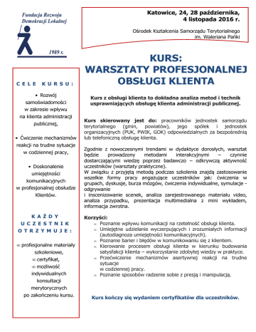 Katowice, 24, 28 października, Rozwiązania informatyczne 4 listopada 2016 r. Ośrodek Kształcenia Samorządu Terytorialnego im. Waleriana Pańki C E L E K U R S U : • Rozwój samoświadomości w zakresie wpływu na klienta administracji publicznej, • Ćwiczenie mechanizmów reakcji na trudne sytuacje w codziennej pracy, • Doskonalenie umiejętności komunikacyjnych w profesjonalnej obsłudze Klientów. K A Ż D Y U C Z E S T N I K O T R Z Y M U J E : • profesjonalne materiały szkoleniowe, • certyfikat, • możliwość indywidualnych KURS: WARSZTATY PROFESJONALNEJ OBSŁUGI KLIENTA Kurs z obsługi klienta to dokładna analiza metod i technik usprawniających obsługę klienta administracji publicznej. Kurs skierowany jest do: pracowników jednostek samorządu terytorialnego (gmin, powiatów), jego spółek i jednostek organizacyjnych (PUK, PWIK, GOK) odpowiedzialnych za bezpośrednią lub telefoniczną obsługę klienta. Zgodnie z nowoczesnymi trendami w dydaktyce dorosłych, warsztat będzie prowadzony metodami interakcyjnymi – czynnie dostarczającymi wiedzę poprzez badawczo – odkrywczą aktywność uczestników (warsztaty praktyczne). W związku z przyjętą metodą podczas szkolenia znajdą zastosowanie wszelkie formy pracy angażujące uczestników jak: ćwiczenia w grupach, dyskusje, burza mózgów, ćwiczenia indywidualne, symulacje odgrywanie i inscenizowanie scenek, analiza zarejestrowanego materiału video, analiza przypadku, prezentacja multimedialna z mini wykładem, informacja zwrotna. Korzyści: • Poznanie wpływu komunikacji na rzetelność obsługi klienta. • Umiejętne udzielanie wyczerpujących i zrozumiałych informacji (autodiagnoza umiejętności komunikacyjnych). • Poznanie barier i błędów w komunikowaniu się z klientem. • Kierowanie procesem obsługi klienta w kierunku budowania satysfakcji klienta – wykorzystanie zdobytej wiedzy w praktyce. • Przećwiczenie mechanizmów asertywnej reakcji na trudne sytuacje w codziennej pracy. • Poznanie sposobów radzenie sobie z presją i manipulacją. konsultacji merytorycznych po zakończeniu kursu. Kurs kończy się wydaniem certyfikatów dla uczestników. Dzień DZIEŃ PIERWSZY 24.10.2016 R. DZIEŃ DRUGI 28.10.2016R. Godzina 9.30 – 15.00 9.30 – 15.00 9.30 – DZIEŃ TRZECI 15.00 4.11.2016 R. Zagadnienia szczegółowe 1. Komunikacja w obsłudze klienta – definicja oraz elementy składające się na proces skutecznej komunikacji. 2. Podstawowe bariery w komunikacji: • Bariery po stronie klienta, • Bariery po stronie obsługującego, • Bariery obiektywne. 3. Techniki usprawniające komunikację: • Parafraza, • Dopasowanie, • Aktywne słuchanie. 4. Komunikacja niewerbalna w obsłudze klienta. 5. Telefoniczna obsługa klienta. Standard prowadzenia rozmów telefonicznych. 1. Czym jest asertywność – definicja. 2. Postawy – asertywna, agresywna, bierna i manipulacyjna: • Cechy poszczególnych postaw, • Korzyści i niebezpieczeństwa wynikające z postawy asertywnej, agresywnej, biernej i manipulacyjnej. 3. Komunikat JA i komunikat TY – różnice, konstrukcja komunikatu FUO. 4. Asertywna odmowa: • Budowa komunikatu „NIE”, • Psychologiczne konsekwencje odmowy. 5. Jak asertywnie reagować na krytykę klientów? • Technika mgły, • Generalizacja, • Aluzja, • Technika zdartej płyty. 6. Prawa asertywności. 1. Trudne sytuacje w obsłudze klienta – sposoby postępowania – na płaszczyźnie komunikacji werbalnej i niewerbalnej. 2. Postępowanie z agresywnym zachowaniem klientów. 3. Stopniowanie reakcji na niepożądane zachowanie – komunikat FUOK. 4. Błędy w obsłudze klienta. 5. Słowa i zachowania irytujące klientów. 6. Podsumowanie i zakończenie szkolenia. MIEJSCE KURSU: Katowice, siedziba Ośrodka ul. Mariacka 1, II piętro. Mapkę dojazdu do siedziby znajdą Państwo na stronie www.okst.pl/dojazd. TERMINY KURSU: 24, 28 października i 4 listopada 2016 r.; godz. 09:30 – 15:00. CENA: 639 ZŁ UWAGA! Przy zgłoszeniu do 30 września 2016 r. cena kursu 599 zł od osoby. Udział w kursie zwolniony z VAT w przypadku finansowania szkolenia ze środków publicznych. Cena zawiera materiały szkoleniowe, certyfikat, lunch i serwis kawowy w każdym dniu kursu. W przypadku chęci rezerwacji noclegu prosimy o kontakt z koordynatorem kursu. Cena 1 noclegu ze śniadaniem to 120 zł. ZGŁOSZENIA: Wypełnioną kartę zgłoszenia należy przesłać mailem lub faksem lub poprzez formularz na www.okst.pl do 19 października 2016 r. Uwaga: Ilość miejsc ograniczona. Brak pisemnej rezygnacji na 3 dni robocze przed szkoleniem będzie równoznaczny z obciążeniem Państwa pełnym kosztem kursu niezależnie od przyczyn rezygnacji. Płatność przelewem na podstawie faktury otrzymanej po szkoleniu. DANE DO KONTAKTU: Ośrodek Kształcenia Samorządu Terytorialnego im. Waleriana Pańki 40-014 Katowice ul. Mariacka 1 Tel 32 259 86 73, 32 253 84 09 Fax. 32 259 86 73 w. 22 e-mail: [email protected]; www.okst.pl OSOBA DO KONTAKTU: Zofia Chodarcewicz tel. 32 206 80 39, 32 206 98 43 w. 31 [email protected] KOD SZKOLENIA ☐ Katowice 1077/16/CH Nazwa nabywcy (dane do faktury) Adres nabywcy (ulica, nr domu, kod pocztowy, miejscowość) NIP Telefon Email 1. Imię i nazwisko uczestnika, stanowisko 2. Imię i nazwisko uczestnika, stanowisko 3. Imię i nazwisko uczestnika, stanowisko Oświadczam, że szkolenie dla ww. pracowników jest kształceniem zawodowym finansowanym w całości lub co najmniej 70% ze środków publicznych (proszę zaznaczyć właściwe) Rezerwacja noclegu UWAGA Ilość miejsc ograniczona. O udziale w kursie decyduje kolejność zgłoszeń. Zgłoszenie na kurs musi zostać potwierdzone przesłaniem do Ośrodka karty zgłoszenia (mail, fax lub formularz na www.okst.pl). Brak pisemnej rezygnacji ze kursu najpóźniej na trzy dni robocze przed terminem niezależnie od przyczyn rezygnacji będzie równoznaczny z obciążeniem Państwa należnością za to szkol