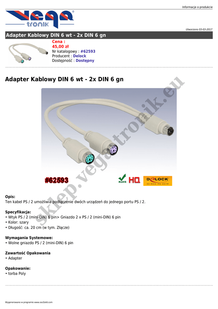 Informacje o produkcie Utworzono 03-03-2017 Adapter Kablowy DIN 6 wt - 2x DIN 6 gn Cena : 45,00 zł Nr katalogowy : #62593 Producent : Delock Dostępność : Dostępny p. ve g atr on i k. eu Adapter Kablowy DIN 6 wt - 2x DIN 6 gn sk le Opis: Ten kabel PS / 2 umożliwia podłączenie dwóch urządzeń do jednego portu PS / 2. Specyfikacja: • Wtyk PS / 2 (mini-DIN) 6 pin> Gniazdo 2 x PS / 2 (mini-DIN) 6 pin • Kolor: szary • Długość: ca. 20 cm (w tym. Złącze) Wymagania Systemowe: • Wolne gniazdo PS / 2 (mini-DIN) 6 pin Zawartość Opakowania • Adapter Opakowanie: • torba Poly Wygenerowano w programie www.oscGold.com
