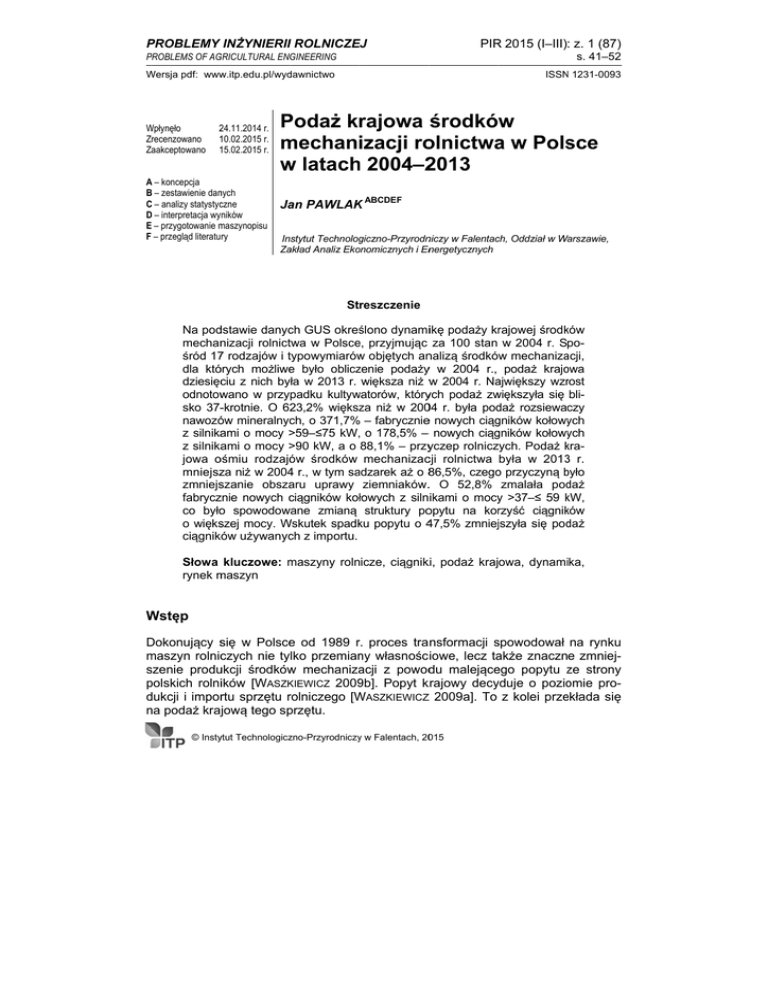 PROBLEMY P INŻYNIERIII ROLNICZE EJ PIR R 2015 (I–III): z. 1 (87) PROBLEMS P OF AG GRICULTURAL ENG GINEERING s. 41–52 Wersja W pdf: www w.itp.edu.pl/wyd dawnictwo ISSN N 1231-0093 Wpłynęło W Zrecenzowano Zaakceptowano 224.11.2014 r. 110.02.2015 r. 115.02.2015 r. A – koncepcja B – zestawienie dannych C – analizy statystycczne D – interpretacja wyyników E – przygotowanie m maszynopisu F – przegląd literatury Podaż krajowa środków P m mechan izacji ro olnictwa a w Pols sce w latach h 2004–2 2013 Ja an PAWLAK K ABCDEF Instytut Technolog giczno-Przyrodn niczy w Falentac ch, Oddział w Warszawie, W akład Analiz Eko onomicznych i En nergetycznych Za Streszczenie Na pod dstawie danycch GUS okreś ślono dynamiikę podaży krrajowej środk ków mechan nizacji rolnicttwa w Polsce e, przyjmując za 100 stan w 2004 r. Spośród 17 7 rodzajów i typowymiarów t w objętych an nalizą środków mechaniza acji, dla któ órych możliwe e było oblicz zenie podażyy w 2004 r., podaż krajo owa dziesięcciu z nich byyła w 2013 r. większa niż w 2004 r. Na ajwiększy wzrrost odnotow wano w przypadku kultyw watorów, któryych podaż zw większyła się blisko 37--krotnie. O 62 23,2% większ za niż w 200 04 r. była pod daż rozsiewaczy nawozó ów mineralnycch, o 371,7% % – fabrycznie e nowych ciąg gników kołowy ych z silnika ami o mocy >59–≤75 > kW, o 178,5% – nowych ciąg gników kołowy ych z silnika ami o mocy >90 > kW, a o 88,1% – przyyczep rolnicz zych. Podaż krak jowa o ośmiu rodzajó ów środków mechanizaccji rolnictwa była w 2013 3 r. mniejszza niż w 2004 4 r., w tym sa adzarek aż o 8 86,5%, czego o przyczyną było b zmniejsszanie obsza aru uprawy ziemniaków.. O 52,8% zmalała pod daż fabryczznie nowych ciągników c kołłowych z siln ikami o mocy y >37–≤ 59 kW, k co było o spowodow wane zmianą struktury po opytu na korrzyść ciągnik ków o więksszej mocy. Wskutek W spadk ku popytu o 4 47,5% zmniejjszyła się pod daż ciągnikków używanycch z importu. m rolnicze, ciągnikki, podaż krajowa, dynamika, Słowa kluczowe: maszyny maszyn rynek m Wstęp W Dokonujący D ssię w Polsce e od 1989 r. r proces tra nsformacji spowodował s na rynku maszyn m rolnicczych nie tylko przemian ny własnośc iowe, lecz ta akże znaczne zmniejszenie s produ ukcji środków w mechaniza acji z powod du malejące ego popytu ze z strony polskich p rolniików [WASZK KIEWICZ 2009 9b]. Popyt kkrajowy decy yduje o pozio omie produkcji d i imporrtu sprzętu rolniczego r [W WASZKIEWICZZ 2009a]. To z kolei prze ekłada się na n podaż krajjową tego sp przętu. © Instyytut Technologiczzno-Przyrodniczy y w Falentach, 20015 Jan Pawlak Sytuacja na rynku maszyn rolniczych jest ściśle związana z koniunkturą w rolnictwie. Wejście Polski do Unii Europejskiej (UE) spowodowało poprawę sytuacji rolników polskich dzięki wdrożeniu wspólnej polityki rolnej (WPR) oraz uruchomiło mechanizmy finansowego wsparcia rolnictwa w ramach tworzonych programów rolno-środowiskowych, w tym stymulujących rozwój działalności prowadzonej w systemach ekologicznych [JUCHERSKI, KRÓL 2013]. Spowodowało to zwiększenie popytu, między innymi na fabrycznie nowe ciągniki rolnicze [PAWLAK 2012; ZALEWSKI (red.) 2014], co jednak nie przełożyło się na zwiększenie poziomu krajowej produkcji tych środków [PAWLAK 2014]. Park maszynowy gospodarstw rolnych wymaga dużej modernizacji i przystosowania go do wykonywania zabiegów z zastosowaniem nowoczesnych technologii produkcji, przyjaznych środowisku naturalnemu [MARCZUK 2013]. Dotyczy to m.in. kombajnów zbożowych, których średni wiek w Polsce szacowano w 2005 r. na 21 lat [MUZALEWSKI 2013]. Średni wiek ciągników i maszyn w gospodarstwach badanych przez WÓJCICKIEGO [2013b] w 2009 r. wyniósł 14,5 lat. Okres trwania zestawów maszyn mógłby być zmniejszony, gdyby w wyniku modernizacji gospodarstw wyeliminowano stare ciągniki i niektóre wyeksploatowane lub zbędne maszyny i urządzenia techniczne [WÓJCICKI i in. 2014]. W koncepcji systemu modernizacji gospodarstw przewiduje się powiązanie przemian technicznych z niezbędnymi zmianami organizacyjnymi i agrotechnicznymi, aby powstał kompleksowy system projektowania technologicznej i ekologicznej modernizacji przedsiębiorstw rolniczych [WÓJCICKI 2013a]. Po integracji Polski z UE nastąpiła wyraźna poprawa w zakresie inwestowania w polskim rolnictwie. Wyniki badań 53 gospodarstw rolnych o areale od 8,8 do 150 ha użytków rolnych (UR), przeprowadzonych w latach 2009 i 2010, dają podstawę do pozytywnej oceny działalności inwestycyjnej właścicieli tych gospodarstw [WÓJCICKI, KUREK 2011; WÓJCICKI, RUDEŃSKA 2013]. Potrzeba modernizacji parku ciągnikowo-maszynowego gospodarstw rolnych w Polsce generuje popyt na środki mechanizacji, a możliwość korzystania z funduszy unijnych podczas zakupów tych środków ułatwia realizację tego popytu. Odpowiedzią na ten popyt powinno być zwiększanie podaży krajowej środków mechanizacji rolnictwa. Istnieje potrzeba zbadania, jak zmieniała się podaż poszczególnych rodzajów środków mechanizacji rolnictwa wraz z poprawą sytuacji w rolnictwie po wejściu Polski do UE. Celem niniejszej pracy jest analiza trendów w podaży krajowej poszczególnych rodzajów środków mechanizacji rolnictwa po wejściu Polski do Unii Europejskiej. Zakres czasowy analizy obejmuje lata 2004–2013. Zakres asortymentowy jest ograniczony do tych rodzajów sprzętu rolniczego, odnośnie do których dostępne są odpowiednie dane w zasobach Głównego Urzędu Statystycznego (GUS) za cały okres objęty analizą. 42 © ITP w Falentach; PIR 2015 (I–III): z. 1 (87) Podaż krajowa środków mechanizacji rolnictwa w Polsce... Materiał źródłowy i metody badań Podstawę analizy sytuacji na polskim rynku maszyn rolniczych stanowiły dane GUS [2005; 2007; 2009; 2011; 2013; 2014b], dotyczące produkcji środków mechanizacji rolnictw