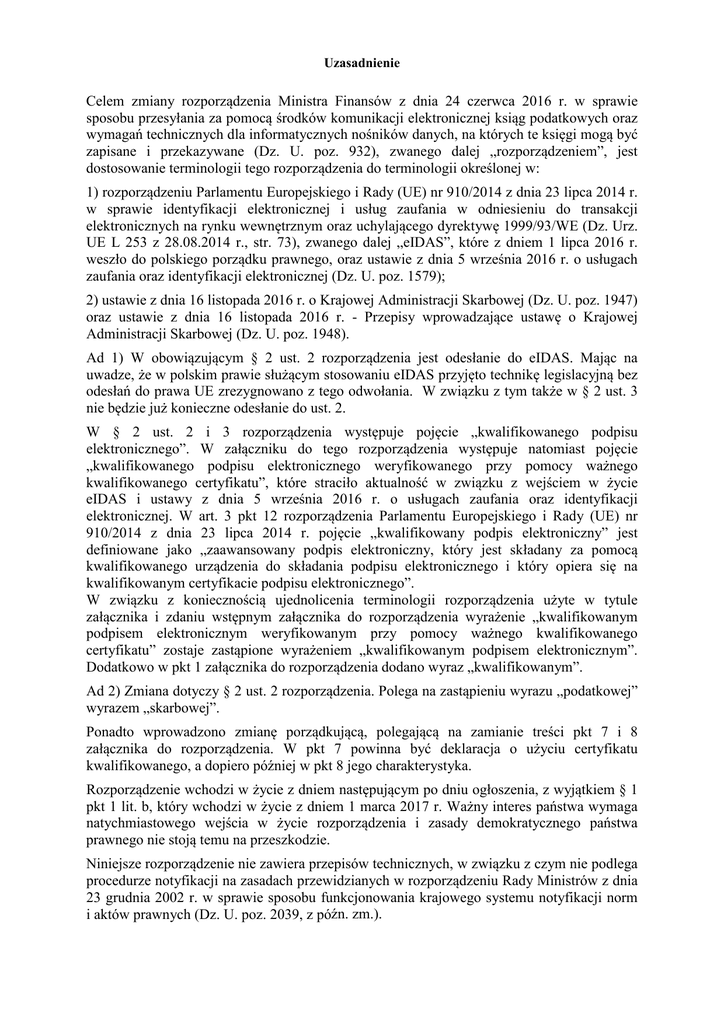 Uzasadnienie Celem zmiany rozporządzenia Ministra Finansów z dnia 24 czerwca 2016 r. w sprawie sposobu przesyłania za pomocą środków komunikacji elektronicznej ksiąg podatkowych oraz wymagań technicznych dla informatycznych nośników danych, na których te księgi mogą być zapisane i przekazywane (Dz. U. poz. 932), zwanego dalej „rozporządzeniem”, jest dostosowanie terminologii tego rozporządzenia do terminologii określonej w: 1) rozporządzeniu Parlamentu Europejskiego i Rady (UE) nr 910/2014 z dnia 23 lipca 2014 r. w sprawie identyfikacji elektronicznej i usług zaufania w odniesieniu do transakcji elektronicznych na rynku wewnętrznym oraz uchylającego dyrektywę 1999/93/WE (Dz. Urz. UE L 253 z 28.08.2014 r., str. 73), zwanego dalej „eIDAS”, które z dniem 1 lipca 2016 r. weszło do polskiego porządku prawnego, oraz ustawie z dnia 5 września 2016 r. o usługach zaufania oraz identyfikacji elektronicznej (Dz. U. poz. 1579); 2) ustawie z dnia 16 listopada 2016 r. o Krajowej Administracji Skarbowej (Dz. U. poz. 1947) oraz ustawie z dnia 16 listopada 2016 r. - Przepisy wprowadzające ustawę o Krajowej Administracji Skarbowej (Dz. U. poz. 1948). Ad 1) W obowiązującym § 2 ust. 2 rozporządzenia jest odesłanie do eIDAS. Mając na uwadze, że w polskim prawie służącym stosowaniu eIDAS przyjęto technikę legislacyjną bez odesłań do prawa UE zrezygnowano z tego odwołania. W związku z tym także w § 2 ust. 3 nie będzie już konieczne odesłanie do ust. 2. W § 2 ust. 2 i 3 rozporządzenia występuje pojęcie „kwalifikowanego podpisu elektronicznego”. W załączniku do tego rozporządzenia występuje natomiast pojęcie „kwalifikowanego podpisu elektronicznego weryfikowanego przy pomocy ważnego kwalifikowanego certyfikatu”, które straciło aktualność w związku z wejściem w życie eIDAS i ustawy z dnia 5 września 2016 r. o usługach zaufania oraz identyfikacji elektronicznej. W art. 3 pkt 12 rozporządzenia Parlamentu Europejskiego i Rady (UE) nr 910/2014 z dnia 23 lipca 2014 r. pojęcie „kwalifikowany podpis elektroniczny” jest definiowane jako „zaawansowany podpis elektroniczny, który jest składany za pomocą kwalifikowanego urządzenia do składania podpisu elektronicznego i który opiera się na kwalifikowanym certyfikacie podpisu elektronicznego”. W związku z koniecznością ujednolicenia terminologii rozporządzenia użyte w tytule załącznika i zdaniu wstępnym załącznika do rozporządzenia wyrażenie „kwalifikowanym podpisem elektronicznym weryfikowanym przy pomocy ważnego kwalifikowanego certyfikatu” zostaje zastąpione wyrażeniem „kwalifikowanym podpisem elektronicznym”. Dodatkowo w pkt 1 załącznika do rozporządzenia dodano wyraz „kwalifikowanym”. Ad 2) Zmiana dotyczy § 2 ust. 2 rozporządzenia. Polega na zastąpieniu wyrazu „podatkowej” wyrazem „skarbowej”. Ponadto wprowadzono zmianę porządkującą, polegającą na zamianie treści pkt 7 i 8 załącznika do rozporządzenia. W pkt 7 powinna być deklaracja o użyciu certyfikatu kwalifikowanego, a dopiero później w pkt 8 jego charakterystyka. Rozporządzenie wchodzi w życie z dniem następującym po dniu ogłoszenia, z wyjątkiem § 1 pkt 1 lit. b, który wchodzi w życie z dniem 1 marca 2017 r. Ważny interes państwa wymaga natychmiastowego wejścia w życie rozporządzenia i zasady demokratycznego państwa prawnego nie stoją temu na przeszkodzie. Niniejsze rozporządzenie nie zawiera przepisów technicznych, w związku z czym nie podlega procedurze notyfikacji na zasadach przewidzianych w rozporządzeniu Rady Ministrów z dnia 23 grudnia 2002 r. w sprawie sposobu funkcjonowania krajowego systemu notyfikacji norm i aktów prawnych (Dz. U. poz. 2039, z późn. zm.). Wstępna ocena zgodności z prawem Unii Europejskiej – materia regulowana przedmiotowym rozporządzeniem w zakresie podpisu elektronicznego jest objęta zakresem prawa Unii Europejskiej. Kwestie podpisu elektronicznego są uregulowane w eIDAS. Zmiany zawarte w projekcie rozporządzenia są zgodne z eIDAS. Tym samym należy uznać, że projekt rozporządzenia jest zgodny z prawem Unii Europejskiej. Projekt rozporządzenia nie wymaga przedstawienia właściwym instytucjom i organom Unii Europejskiej lub Europejskiemu Bankowi Centralnemu celem uzyskania opinii, dokonania konsultacji albo uzgodnienia, w przypadkach określonych w obowiązujących na terytorium Rzeczypospolitej Polskiej przepisach Unii Europejskiej. Stosownie do przepisów art. 5 ustawy z dnia 7 lipca 2005 r. o działalności lobbingowej w procesie stanowienia prawa (Dz. U. poz. 1414, z późn. zm.) oraz § 52 ust. 1 uchwały nr 190 Rady Ministrów z dnia 29 października 2013 r. – Regulamin pracy Rady Ministrów (M. P. z 2016 r. poz. 1006) projekt rozporządzenia został udostępniony w Biuletynie Informacji Publicznej na stronie podmiotowej Rządowego Centrum Legislacji, w serwisie Rządowy Proces Legislacyjny. 2
