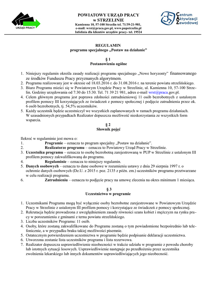 POWIATOWY URZĄD PRACY w STRZELINIE Kamienna 10, 57-100 Strzelin tel. 71/39-21-981, e-mail: [email protected], www.pupstrzelin.pl Infolinia dla klientów urzędów pracy- tel. 19524 REGULAMIN programu specjalnego „Postaw na działanie” §1 Postanowienia ogólne 1. Niniejszy regulamin określa zasady realizacji programu specjalnego „Nowe horyzonty” finansowanego ze środków Funduszu Pracy przyznanych algorytmem. 2. Programu realizowany jest w okresie od 18.03.2016 r. do 31.08.2016 r. na terenie powiatu strzelińskiego. 3. Biuro Programu mieści się w Powiatowym Urzędzie Pracy w Strzelinie, ul. Kamienna 10, 57-100 Strzelin. Godziny urzędowania od 7:30 do 15:30. Tel. 71 39 21 981, adres e-mail [email protected]. 4. Celem głównym programu jest poprawa zdolności zatrudnieniowej 11 osób bezrobotnych z ustalonym profilem pomocy III korzystających ze świadczeń z pomocy społecznej i podjęcie zatrudnienia przez ok. 6 osób bezrobotnych, tj. 54,5% uczestników. 5. Każdy uczestnik będzie uczestniczył we wszystkich zaplanowanych w ramach programu działaniach. W uzasadnionych przypadkach Realizator dopuszcza możliwość nieskorzystania ze wszystkich form wsparcia. §2 Słownik pojęć Ilekroć w regulaminie jest mowa o: 1. Programie – oznacza to program specjalny „Postaw na działanie”. 2. Realizatorze programu – oznacza to Powiatowy Urząd Pracy w Strzelinie. 3. Uczestniku programu – oznacza to osobę bezrobotną zarejestrowaną w PUP w Strzelinie z ustalonym III profilem pomocy zakwalifikowaną do programu. 4. Regulaminie – oznacza to niniejszy regulamin. 5. Danych osobowych – oznacza to dane osobowe w rozumieniu ustawy z dnia 29 sierpnia 1997 r. o ochronie danych osobowych (Dz.U. z 2015 r. poz. 2135 z późn. zm.) uczestników programu przetwarzane w celu realizacji programu. 6. Zatrudnieniu – oznacza to podjęcie pracy na umowę zlecenia na okres minimum 1 miesiąca. §3 Uczestnictwo w programie 1. Uczestnikami Programu mogą być wyłącznie osoby bezrobotne zarejestrowane w Powiatowym Urzędzie Pracy w Strzelinie z ustalonym III profilem pomocy i korzystające ze świadczeń z pomocy społecznej. 2. Rekrutacja będzie prowadzona z uwzględnieniem zasady równości szans kobiet i mężczyzn na rynku pra cy w porozumieniu z gminami z ternu powiatu strzelińskiego. 3. Liczba uczestników Programu: 11 osób. 4. Osoby, które zostaną zakwalifikowane do Programu zostaną o tym powiadomione bezpośrednio lub telefonicznie, a w przypadku braku takiej możliwości pisemnie. 5. Ostatecznym potwierdzeniem uczestnictwa w programie będzie podpisanie deklaracji uczestnictwa. 6. Utworzona zostanie lista uczestników programu i lista rezerwowa. 7. Realizator dopuszcza usprawiedliwienie nieobecności w trakcie udziału w programie z powodu choroby lub istotnych sytuacji losowych. Usprawiedliwienie następuje po przedłożeniu przez uczestnika zwolnienia lekarskiego lub innych dokumentów usprawiedliwiających jego nieobecność. §4 Formy wsparcia dla uczestników programu 1. W ramach programu organizowane będą następujące działania: poradnictwo zawodowe i / lub pośrednictwo pracy, warsztaty z zakresu aktywnego poszukiwania pracy, przyznanie bonu na zakup odzieży roboczej, prace społecznie użyteczne w gminach, zwrot kosztów dojazdu na prace społecznie użyteczne, wypłata premii dla pracodawcy za zatrudnienie bezrobotnego bezpośrednio po zakończeniu prac społecznie użytecznych. 2. Uczestnicy programu zostaną skierowani na trwające 1 dzień / 3 godziny zegarowe warsztaty z zakresu aktywnego poszukiwania pracy. 3. Wszyscy uczestnicy programu zobowiązani są złożyć w PUP w Strzelinie „Wniosek o przyznanie bonu na zakup odzieży roboczej w ramach programu specjalnego „Postaw na działanie” w terminie wskazanym przez doradcę klienta. 4. Bon o wartości 100 zł będzie przyznany na podstawie umowy zawartej pomiędzy Realizatorem a uczestnikiem programu i przeznaczony wyłącznie na zakup odzieży roboczej. 5. Uczestnik programu jest zobowiązany dokonać zakupu odzieży roboczej i rozliczyć otrzymane środki w terminie 14 dni od dnia wypłaty świadczenia w ramach bonu przedkładając Realizatorowi programu rachunki lub faktury. Niewydatkowaną lub wydatkowaną niezgodnie z przeznaczeniem kwotę bonu na zakup odzieży roboczej należy zwrócić na rachunek PUP w Strzelinie. 6. Realizator skieruje uczestników programu na prace społecznie użyteczne do gmin. 7. Czas trwania prac społecznie użytecznych: 3 miesiące. 8. Za okres uczestnictwa w pracach społecznie użytecznych przysługuje świadczenie i zwrot kosztów dojaz du (na podstawie biletów lub oświadczenia przewoźnika). 9. Realizator programu zastrzega sobie prawo skreślenia uczestnika programu z listy uczestników programu w przypadku: - utraty statusu osoby bezrobotnej za wyjątkiem utraty statusu osoby bezrobotnej z tytułu podjęcia zatrudnienia - nieusprawiedliwionej nieobecności podczas więcej niż jednego dnia uczestnictwa w programie, - złożenia nieprawdziwych oświadczeń w dokumentach rekrutacyjnych, - rażącego naruszenia Regulamin programu, - rażącego naruszenia zasad współżycia społecznego. 10. Rezygnacja z udziału w Programie / formie wsparcia może być spowodowana wyłącznie podjęciem zatrudnienia. W przypadku rezygnacji z innego powodu uczestnik pozbawiony zostanie statusu bezrobotnego i jest zobowiązany do zwrotu kosztów dojazdu i kosztów bonu na zakup odzieży. Rezygnacja z udziału w Programie wymaga formy pisemnej wraz z podaniem przyczyny rezygnacji (Załącznik nr 3). §5 Obowiązki uczestnika projektu Uczestnik programu zobowiązuje się do: 1. Wypełniania wszystkich dokumentów związanych z udziałem w Programie. 2. Regularnego i aktywnego uczestnictwa we wszystkich formach wsparcia przewidzianych w ramach Programu oraz innych zaproponowanych przez urząd. 3. Niezwłocznego informowania o problemach w realizacji poszczególnych form aktywiz