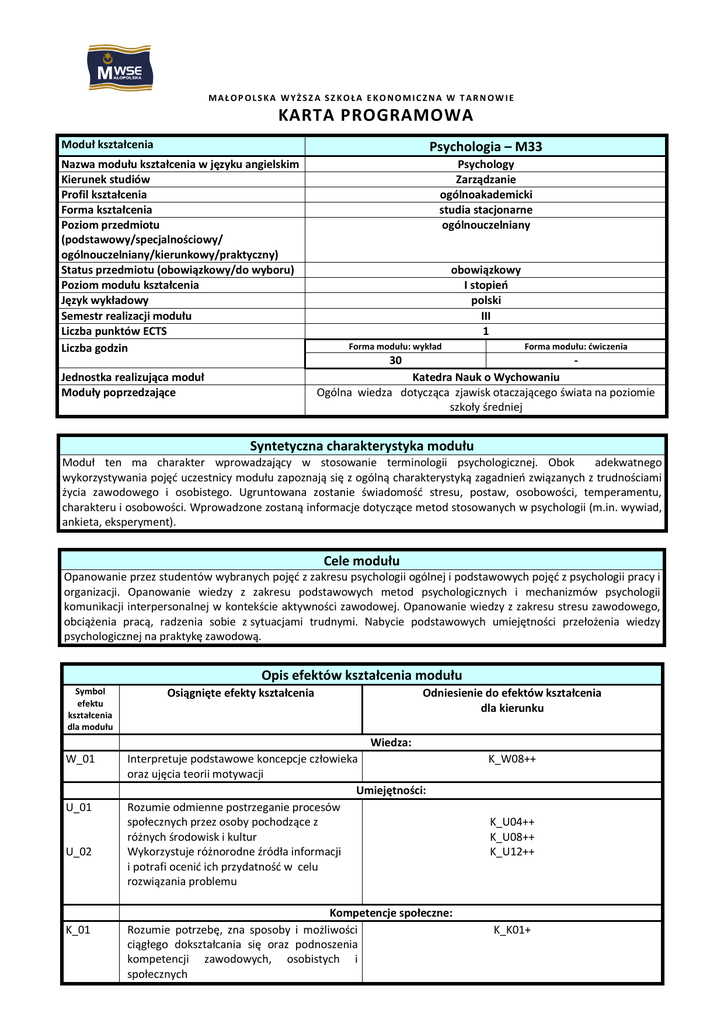 MAŁOP OLSKA WYŻSZ A SZ KOŁA E KONOMICZNA W TARN OW IE KARTA PROGRAMOWA Moduł kształcenia Psychologia – M33 Nazwa modułu kształcenia w języku angielskim Kierunek studiów Profil kształcenia Forma kształcenia Poziom przedmiotu (podstawowy/specjalnościowy/ ogólnouczelniany/kierunkowy/praktyczny) Status przedmiotu (obowiązkowy/do wyboru) Poziom modułu kształcenia Język wykładowy Semestr realizacji modułu Liczba punktów ECTS Liczba godzin Jednostka realizująca moduł Moduły poprzedzające Psychology Zarządzanie ogólnoakademicki studia stacjonarne ogólnouczelniany obowiązkowy I stopień polski III 1 Forma modułu: wykład Forma modułu: ćwiczenia 30 - Katedra Nauk o Wychowaniu Ogólna wiedza dotycząca zjawisk otaczającego świata na poziomie szkoły średniej Syntetyczna charakterystyka modułu Moduł ten ma charakter wprowadzający w stosowanie terminologii psychologicznej. Obok adekwatnego wykorzystywania pojęć uczestnicy modułu zapoznają się z ogólną charakterystyką zagadnień związanych z trudnościami życia zawodowego i osobistego. Ugruntowana zostanie świadomość stresu, postaw, osobowości, temperamentu, charakteru i osobowości. Wprowadzone zostaną informacje dotyczące metod stosowanych w psychologii (m.in. wywiad, ankieta, eksperyment). Cele modułu Opanowanie przez studentów wybranych pojęć z zakresu psychologii ogólnej i podstawowych pojęć z psychologii pracy i organizacji. Opanowanie wiedzy z zakresu podstawowych metod psychologicznych i mechanizmów psychologii komunikacji interpersonalnej w kontekście aktywności zawodowej. Opanowanie wiedzy z zakresu stresu zawodowego, obciążenia pracą, radzenia sobie z sytuacjami trudnymi. Nabycie podstawowych umiejętności przełożenia wiedzy psychologicznej na praktykę zawodową. Opis efektów kształcenia modułu Symbol efektu kształcenia dla modułu W_01 U_01 U_02 K_01 Osiągnięte efekty kształcenia Odniesienie do efektów kształcenia dla kierunku Wiedza: Interpretuje podstawowe koncepcje człowieka oraz ujęcia teorii motywacji Umiejętności: Rozumie odmienne postrzeganie procesów społecznych przez osoby pochodzące z różnych środowisk i kultur Wykorzystuje różnorodne źródła informacji i potrafi ocenić ich przydatność w celu rozwiązania problemu Kompetencje społeczne: Rozumie potrzebę, zna sposoby i możliwości ciągłego dokształcania się oraz podnoszenia kompetencji zawodowych, osobistych i społecznych K_W08++ K_U04++ K_U08++ K_U12++ K_K01+ Treści kształcenia modułu Forma modułu: wykład Psychologia jako nauka: przedmiot, cel, metoda, aspekt. 2. Procesy poznawcze: wrażenia, spostrzeżenia, myślenie, pamięć, uwaga. 3. Procesy emocjonalne i motywacyjne. 4. Postawy: komponenty i kształtowanie. 5. Psychologia pracy: cel, przedmiot i metody. 6. Teoria wyuczonej bezradności. Wypalenie zawodowe. 7. Teoria stresu psychologicznego. Radzenie sobie ze stresem. Stres zawodowy. 8. Podstawy psychologii społecznej; teoria atrybucji; Jak spostrzegamy siebie i innych? Zasady komunikacji interpersonalnej i aktywnego słuchania. 9. Koncepcje dojrzałej osobowości. 10. Jak poznajemy i siebie i innych. Mechanizmy wpływu społecznego. 11. Negocjacje. 12. Psychologia pracy z klientem: zachowania asertywne czy agresywne? Konflikt interpersonalny i zasady jego rozwiązania. Forma modułu: ćwiczenia 1. Literatura podstawowa 1. 2. Literatura uzupełniająca 1. Zimbardo Ph. G., Psychologia : kluczowe koncepcje. 1, Podstawy psychologii, Wydawnictwo Naukowe PWN, Warszawa 2010. Ratajczak Z., Psychologia pracy i organizacji, Wydawnictwo Naukowe PWN, Warszawa 2008. Matusewicz C., Wprowadzenie do psychologii, Vizja Press&IT, Warszawa 2011. Metody dydaktyczne Wykład prowadzony z użyciem środków audiowizualnych.