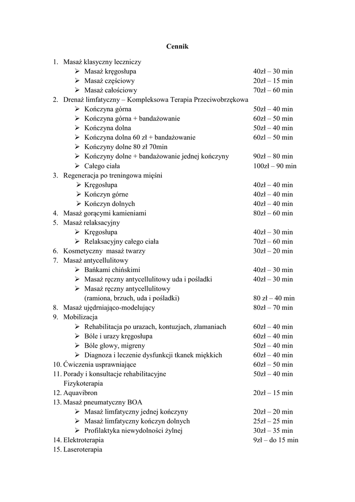Cennik 1. Masaż klasyczny leczniczy Masaż kręgosłupa Masaż częściowy Masaż całościowy 2. Drenaż limfatyczny – Kompleksowa Terapia Przeciwobrzękowa Kończyna górna Kończyna górna + bandażowanie Kończyna dolna Kończyna dolna 60 zł + bandażowanie Kończyny dolne 80 zł 70min Kończyny dolne + bandażowanie jednej kończyny Całego ciała 3. Regeneracja po treningowa mięśni Kręgosłupa Kończyn górne Kończyn dolnych 4. Masaż gorącymi kamieniami 5. Masaż relaksacyjny Kręgosłupa Relaksacyjny całego ciała 6. Kosmetyczny masaż twarzy 7. Masaż antycellulitowy Bańkami chińskimi Masaż ręczny antycellulitowy uda i pośladki Masaż ręczny antycellulitowy (ramiona, brzuch, uda i pośladki) 8. Masaż ujędrniająco-modelujący 9. Mobilizacja Rehabilitacja po urazach, kontuzjach, złamaniach Bóle i urazy kręgosłupa Bóle głowy, migreny Diagnoza i leczenie dysfunkcji tkanek miękkich 10. Ćwiczenia usprawniające 11. Porady i konsultacje rehabilitacyjne Fizykoterapia 12. Aquavibron 13. Masaż pneumatyczny BOA Masaż limfatyczny jednej kończyny Masaż limfatyczny kończyn dolnych Profilaktyka niewydolności żylnej 14. Elektroterapia 15. Laseroterapia 40zł – 30 min 20zł – 15 min 70zł – 60 min 50zł – 40 min 60zł – 50 min 50zł – 40 min 60zl – 50 min 90zł – 80 min 100zł – 90 min 40zł – 40 min 40zł – 40 min 40zł – 40 min 80zł – 60 min 40zł – 30 min 70zł – 60 min 30zł – 20 min 40zł – 30 min 40zł – 30 min 80 zł – 40 min 80zł – 70 min 60zł – 40 min 60zł – 40 min 50zł – 40 min 60zł – 40 min 60zł – 50 min 50zł – 40 min 20zł – 15 min 20zł – 20 min 25zł – 25 min 30zł – 35 min 9zł – do 15 min Jedna procedura Dwie procedury 16. Ultradźwięk 17. Magnetoterapia 18. Sollux 10zł 15zł 10 zł 10 zł 9 zł Rabaty 10 zabiegów 30% taniej. Przy zakupie karty stałego klienta (koszt 10 zł) 20% taniej na wszystkie zabiegi. We dwoje 10% taniej na dowolny zabieg. Urodziny 40% taniej. Promocje i rabatów nie łączymy.