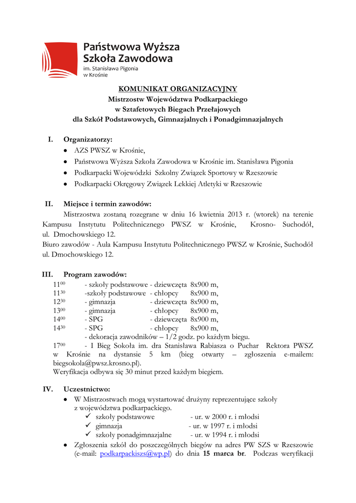 KOMUNIKAT ORGANIZACYJNY Mistrzostw Województwa Podkarpackiego w Sztafetowych Biegach Przełajowych dla Szkół Podstawowych, Gimnazjalnych i Ponadgimnazjalnych I. Organizatorzy: AZS PWSZ w Krośnie, Państwowa Wyższa Szkoła Zawodowa w Krośnie im. Stanisława Pigonia Podkarpacki Wojewódzki Szkolny Związek Sportowy w Rzeszowie Podkarpacki Okręgowy Związek Lekkiej Atletyki w Rzeszowie II. Miejsce i termin zawodów: Mistrzostwa zostaną rozegrane w dniu 16 kwietnia 2013 r. (wtorek) na terenie Kampusu Instytutu Politechnicznego PWSZ w Krośnie, Krosno- Suchodół, ul. Dmochowskiego 12. Biuro zawodów - Aula Kampusu Instytutu Politechnicznego PWSZ w Krośnie, Suchodół ul. Dmochowskiego 12. III. Program zawodów: 1100 - szkoły podstawowe - dziewczęta 8x900 m, 1130 -szkoły podstawowe - chłopcy 8x900 m, 30 12 - gimnazja - dziewczęta 8x900 m, 1300 - gimnazja - chłopcy 8x900 m, 00 14 - SPG - dziewczęta 8x900 m, 30 14 - SPG - chłopcy 8x900 m, - dekoracja zawodników – 1/2 godz. po każdym biegu. 1700 - I Bieg Sokoła im. dra Stanisława Rabiasza o Puchar Rektora PWSZ w Krośnie na dystansie 5 km (bieg otwarty – zgłoszenia e-mailem: [email protected]). Weryfikacja odbywa się 30 minut przed każdym biegiem. IV. Uczestnictwo: W Mistrzostwach mogą wystartować drużyny reprezentujące szkoły z województwa podkarpackiego. szkoły podstawowe - ur. w 2000 r. i młodsi gimnazja - ur. w 1997 r. i młodsi szkoły ponadgimnazjalne - ur. w 1994 r. i młodsi Zgłoszenia szkół do poszczególnych biegów na adres PW SZS w Rzeszowie (e-mail: [email protected]) do dnia 15 marca br. Podczas weryfikacji w dniu zawodów należy przedłożyć: listę imienną potwierdzoną przez dyrekcję szkoły oraz legitymacje szkolne. V. Założenia techniczno-organizacyjne: Zawody odbywają się w formie sztafet, na podłożu trawiastym i asfaltowym. Zawodnicy startujący na I zmianie biegną ze startu wspólnego. Strefa zmian 20 m. Obowiązuje obuwie sportowe bez kolców. Szkoły posiadają własne numery startowe (przydzielone przez organizatora i wykonane wg wzoru w komunikacie nr 2) oraz pałeczki sztafetowe. VI. Nagrody: 3 najlepsze szkoły w każdej kategorii otrzymają puchary i medale.Wszystkie szkoły, które ukończą zawody otrzymają dyplomy. Najlepsza drużyna (10 osób + opiekun) w kategorii szkół ponadgimnazjalnych dziewcząt i chłopców wyjedzie na 3-dniowy obóz nad jeziorem Solińskim w bazie AZS PWSZ Krosno !!! Wszystkie drużyny będą mogły skorzystać ze specjalnej oferty w postaci wycieczki do Centrum Dziedzictwa Szkła w Krośnie (szczegóły w komunikacie nr 2). Zawody stanowią eliminacje wojewódzkie do Finału Krajowego VENA CROSS FESTIVAL – Łódź, 21.04.2013r. (zwycięzcy zawodów w poszczególnych kategoriach). VII. Uwagi końcowe: Koszty organizacyjne (wynajem obiektów, obsługa techniczna, sędziowska i medyczna, nagrody: dyplomy, puchary i medale) pokrywają organizatorzy. Koszty uczestnictwa (przejazdy i wyżywienie) pokrywają uczestnicy we własnym zakresie. Zawody nie są punktowane w systemie współzawodnictwa prowadzonego przez PW SZS w Rzeszowie. Wszelkie dodatkowe informacje na stronie www.pwsz.krosno.pl oraz pod numerem tel. 669 430 560 (Pan Andrzej Zatorski) i na stronie www.szs.rzeszow.pl.