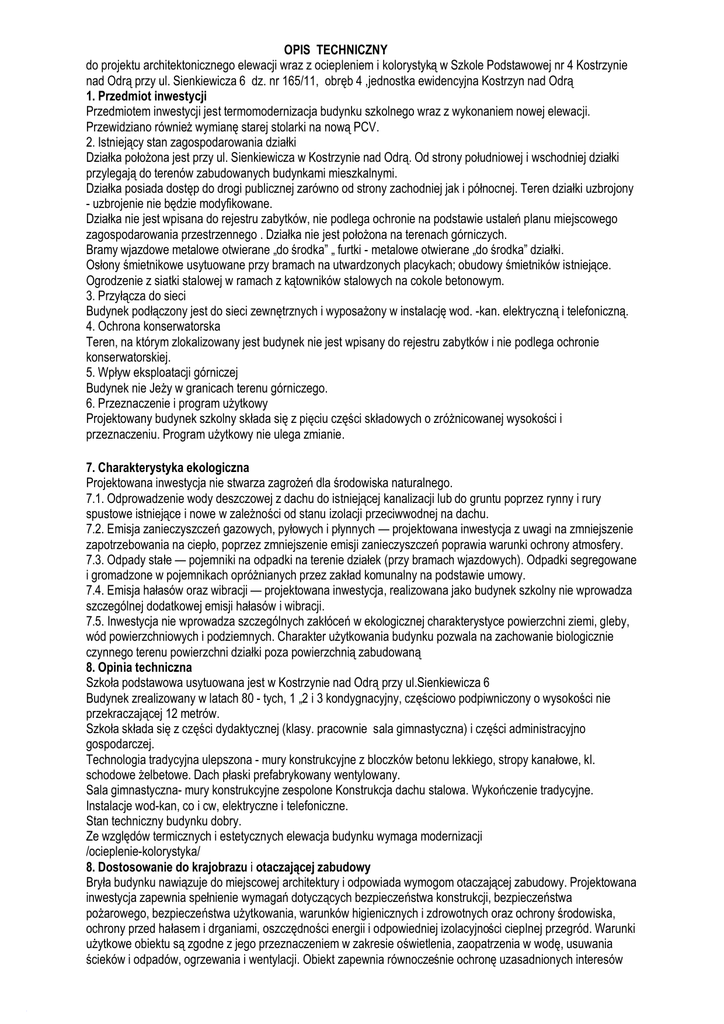 OPIS TECHNICZNY do projektu architektonicznego elewacji wraz z ociepleniem i kolorystyką w Szkole Podstawowej nr 4 Kostrzynie nad Odrą przy ul. Sienkiewicza 6 dz. nr 165/11, obręb 4 ,jednostka ewidencyjna Kostrzyn nad Odrą 1. Przedmiot inwestycji Przedmiotem inwestycji jest termomodernizacja budynku szkolnego wraz z wykonaniem nowej elewacji. Przewidziano również wymianę starej stolarki na nową PCV. 2. Istniejący stan zagospodarowania działki Działka położona jest przy ul. Sienkiewicza w Kostrzynie nad Odrą. Od strony południowej i wschodniej działki przylegają do terenów zabudowanych budynkami mieszkalnymi. Działka posiada dostęp do drogi publicznej zarówno od strony zachodniej jak i północnej. Teren działki uzbrojony - uzbrojenie nie będzie modyfikowane. Działka nie jest wpisana do rejestru zabytków, nie podlega ochronie na podstawie ustaleń planu miejscowego zagospodarowania przestrzennego . Działka nie jest położona na terenach górniczych. Bramy wjazdowe metalowe otwierane „do środka” „ furtki - metalowe otwierane „do środka” działki. Osłony śmietnikowe usytuowane przy bramach na utwardzonych placykach; obudowy śmietników istniejące. Ogrodzenie z siatki stalowej w ramach z kątowników stalowych na cokole betonowym. 3. Przyłącza do sieci Budynek podłączony jest do sieci zewnętrznych i wyposażony w instalację wod. -kan. elektryczną i telefoniczną. 4. Ochrona konserwatorska Teren, na którym zlokalizowany jest budynek nie jest wpisany do rejestru zabytków i nie podlega ochronie konserwatorskiej. 5. Wpływ eksploatacji górniczej Budynek nie Jeży w granicach terenu górniczego. 6. Przeznaczenie i program użytkowy Projektowany budynek szkolny składa się z pięciu części składowych o zróżnicowanej wysokości i przeznaczeniu. Program użytkowy nie ulega zmianie. 7. Charakterystyka ekologiczna Projektowana inwestycja nie stwarza zagrożeń dla środowiska naturalnego. 7.1. Odprowadzenie wody deszczowej z dachu do istniejącej kanalizacji lub do gruntu poprzez rynny i rury spustowe istniejące i nowe w zależności od stanu izolacji przeciwwodnej na dachu. 7.2. Emisja zanieczyszczeń gazowych, pyłowych i płynnych — projektowana inwestycja z uwagi na zmniejszenie zapotrzebowania na ciepło, poprzez zmniejszenie emisji zanieczyszczeń poprawia warunki ochrony atmosfery. 7.3. Odpady stałe — pojemniki na odpadki na terenie działek (przy bramach wjazdowych). Odpadki segregowane i gromadzone w pojemnikach opróżnianych przez zakład komunalny na podstawie umowy. 7.4. Emisja hałasów oraz wibracji — projektowana inwestycja, realizowana jako budynek szkolny nie wprowadza szczególnej dodatkowej emisji hałasów i wibracji. 7.5. Inwestycja nie wprowadza szczególnych zakłóceń w ekologicznej charakterystyce powierzchni ziemi, gleby, wód powierzchniowych i podziemnych. Charakter użytkowania budynku pozwala na zachowanie biologicznie czynnego terenu powierzchni działki poza powierzchnią zabudowaną 8. Opinia techniczna Szkoła podstawowa usytuowana jest w Kostrzynie nad Odrą przy ul.Sienkiewicza 6 Budynek zrealizowany w latach 80 - tych, 1 „2 i 3 kondygnacyjny, częściowo podpiwniczony o wysokości nie przekraczającej 12 metrów. Szkoła składa się z części dydaktycznej (klasy. pracownie sala gimnastyczna) i części administracyjno gospodarczej. Technologia tradycyjna ulepszona - mury konstrukcyjne z bloczków betonu lekkiego, stropy kanałowe, kl. schodowe żelbetowe. Dach płaski prefabrykowany wentylowany. Sala gimnastyczna- mury konstrukcyjne zespolone Konstrukcja dachu stalowa. Wykończenie tradycyjne. Instalacje wod-kan, co i cw, elektryczne i telefoniczne. Stan techniczny budynku dobry. Ze względów termicznych i estetycznych elewacja budynku wymaga modernizacji /ocieplenie-kolorystyka/ 8. Dostosowanie do krajobrazu i otaczającej zabudowy Bryła budynku nawiązuje do miejscowej architektury i odpowiada wymogom otaczającej zabudowy. Projektowana inwestycja zapewnia spełnienie wymagań dotyczących bezpieczeństwa konstrukcji, bezpieczeństwa pożarowego, bezpieczeństwa użytkowania, warunków higienicznych i zdrowotnych oraz ochrony środowiska, ochrony przed hałasem i drganiami, oszczędności energii i odpowiedniej izolacyjności cieplnej przegród. Warunki użytkowe obiektu są zgodne z jego przeznaczeniem w zakresie oświetlenia, zaopatrzenia w wodę, usuwania ścieków i odpadów, ogrzewania i wentylacji. Obiekt zapewnia równocześnie ochronę uzasadnionych interesów osób trzecich, obejmującą w szczególności zapewnienie dostępu do drogi publicznej, ochronę przed pozbawieniem możliwości korzystania z wody, kanalizacji, energii elektrycznej oraz środków łączności, dopływu światła dziennego do pomieszczeń przeznaczonych na pobyt ludzi, ochronę przed uciążliwościami powodowanymi przez hałas, wibracje, zakłócenia elektryczne, promieniowanie, ochronę przed zanieczyszczeniami powietrza, wody lub gleby. 9. Parametry techniczne przyjętych rozwiązań modernizacji budynku 9.1. Izolacje termiczne - ocieplenie ścian zewnętrznych fundamentowych — styropian FS-20 grubości 10 cm z warstwą ochronną do styczności z gruntem ocieplenie ścian zewnętrznych parteru i poddasza — styropian grubości 12 cm przyklejany szczelnie do ściany Płyty styropianowe przyklejane do ściany czystej i suchej, bez nalotów, wykwitów i środków utrudniających wiązanie, w sposób szczelny (wg wybranego systemu,) metodą „ramki i placków” (ramka dookoła szer. 5 cm, gr. 1 cm i ok. 6 placków wewnątrz ramki). Szczeliny między płytami wypełnić masą uszczelniającą trwale plastyczną, zapobiegającą penetracji wilgoci pod powierzchnię płyt oraz pianką poliuretanową, zapobiegającą powstawaniu mostków termicznych. W przypadku istniejącego tynku źle związanego z podłożem, należy go skuć i miejsce te naprawić. Obróbki blacharskie z blachy ocynkowanej gr. 0,55mm. T