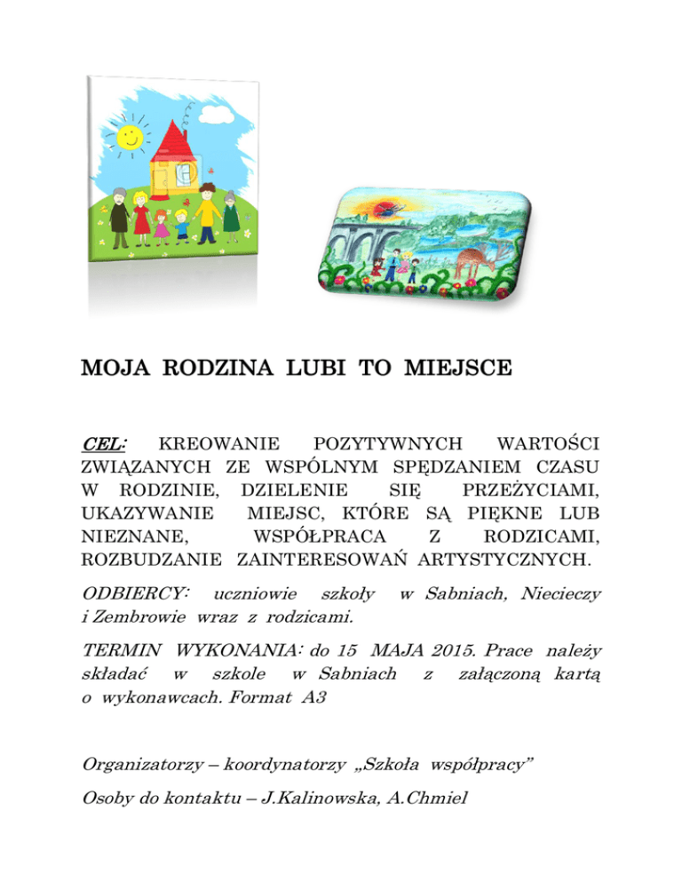 MOJA RODZINA LUBI TO MIEJSCE CEL: KREOWANIE POZYTYWNYCH WARTOŚCI ZWIĄZANYCH ZE WSPÓLNYM SPĘDZANIEM CZASU W RODZINIE, DZIELENIE SIĘ PRZEŻYCIAMI, UKAZYWANIE MIEJSC, KTÓRE SĄ PIĘKNE LUB NIEZNANE, WSPÓŁPRACA Z RODZICAMI, ROZBUDZANIE ZAINTERESOWAŃ ARTYSTYCZNYCH. ODBIERCY: uczniowie szkoły i Zembrowie wraz z rodzicami. w Sabniach, Niecieczy TERMIN WYKONANIA: do 15 MAJA 2015. Prace należy składać w szkole w Sabniach z załączoną kartą o wykonawcach. Format A3 Organizatorzy – koordynatorzy „Szkoła współpracy” Osoby do kontaktu – J.Kalinowska, A.Chmiel MOJA RODZINA LUBI TO MIEJSCE CEL: KREOWANIE POZYTYWNYCH WARTOŚCI ZWIĄZANYCH Z AKTYWNYM, WSPÓLNYM SPĘDZANIEM CZASU W RODZINIE, WZAJEMNEGO SZACUNKU, WSPÓŁPRACA Z RODZICAMI, ROZBUDZANIE ZAINTERESOWAŃ ARTYSTYCZNYCH. ODBIERCY: uczniowie szkoły i Zembrowie wraz z rodzicami. w Sabniach, Niecieczy TERMIN WYKONANIA: do 15 MAJA 2015. Prace należy składać w szkole w Sabniach z załączoną kartą o wykonawcach. Format A3 Organizatorzy – koordynatorzy – SZKOŁA PROMUJĄCA ZDROWIE, „Szkoła współpracy” Osoby do kontaktu – J.Kalinowska, A.Chmiel