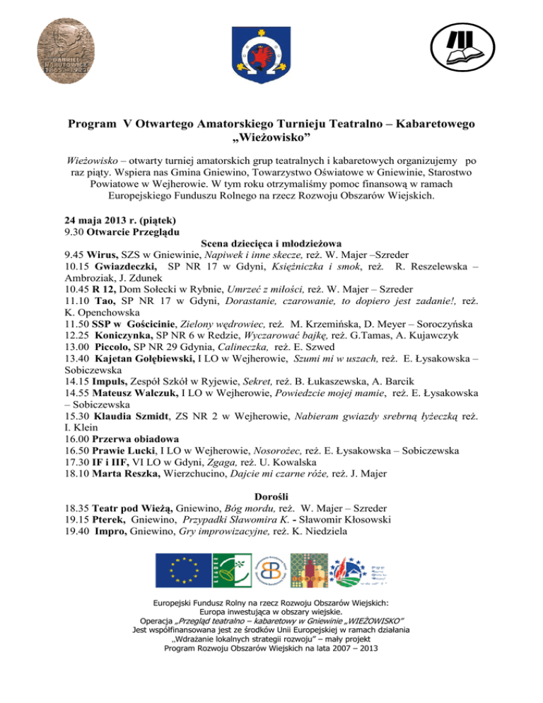 Program V Otwartego Amatorskiego Turnieju Teatralno – Kabaretowego „WieŜowisko” WieŜowisko – otwarty turniej amatorskich grup teatralnych i kabaretowych organizujemy po raz piąty. Wspiera nas Gmina Gniewino, Towarzystwo Oświatowe w Gniewinie, Starostwo Powiatowe w Wejherowie. W tym roku otrzymaliśmy pomoc finansową w ramach Europejskiego Funduszu Rolnego na rzecz Rozwoju Obszarów Wiejskich. 24 maja 2013 r. (piątek) 9.30 Otwarcie Przeglądu Scena dziecięca i młodzieŜowa 9.45 Wirus, SZS w Gniewinie, Napiwek i inne skecze, reŜ. W. Majer –Szreder 10.15 Gwiazdeczki, SP NR 17 w Gdyni, KsięŜniczka i smok, reŜ. R. Reszelewska – Ambroziak, J. Zdunek 10.45 R 12, Dom Sołecki w Rybnie, Umrzeć z miłości, reŜ. W. Majer – Szreder 11.10 Tao, SP NR 17 w Gdyni, Dorastanie, czarowanie, to dopiero jest zadanie!, reŜ. K. Openchowska 11.50 SSP w Gościcinie, Zielony wędrowiec, reŜ. M. Krzemińska, D. Meyer – Soroczyńska 12.25 Koniczynka, SP NR 6 w Redzie, Wyczarować bajkę, reŜ. G.Tamas, A. Kujawczyk 13.00 Piccolo, SP NR 29 Gdynia, Calineczka, reŜ. E. Szwed 13.40 Kajetan Gołębiewski, I LO w Wejherowie, Szumi mi w uszach, reŜ. E. Łysakowska – Sobiczewska 14.15 Impuls, Zespół Szkół w Ryjewie, Sekret, reŜ. B. Łukaszewska, A. Barcik 14.55 Mateusz Walczuk, I LO w Wejherowie, Powiedzcie mojej mamie, reŜ. E. Łysakowska – Sobiczewska 15.30 Klaudia Szmidt, ZS NR 2 w Wejherowie, Nabieram gwiazdy srebrną łyŜeczką reŜ. I. Klein 16.00 Przerwa obiadowa 16.50 Prawie Lucki, I LO w Wejherowie, NosoroŜec, reŜ. E. Łysakowska – Sobiczewska 17.30 IF i IIF, VI LO w Gdyni, Zgaga, reŜ. U. Kowalska 18.10 Marta Reszka, Wierzchucino, Dajcie mi czarne róŜe, reŜ. J. Majer Dorośli 18.35 Teatr pod WieŜą, Gniewino, Bóg mordu, reŜ. W. Majer – Szreder 19.15 Pterek, Gniewino, Przypadki Sławomira K. - Sławomir Kłosowski 19.40 Impro, Gniewino, Gry improwizacyjne, reŜ. K. Niedziela Europejski Fundusz Rolny na rzecz Rozwoju Obszarów Wiejskich: Europa inwestująca w obszary wiejskie. Operacja „Przegląd teatralno – kabaretowy w Gniewinie „WIEśOWISKO” Jest współfinansowana jest ze środków Unii Europejskiej w ramach działania „WdraŜanie lokalnych strategii rozwoju” – mały projekt Program Rozwoju Obszarów Wiejskich na lata 2007 – 2013 20.15 GOŚCINNIE – Teatr Labiau, Polessk, Okręg Kaliningradzki w Rosji, Kolekcjoner Lalek, reŜ. N. Szewczenko 25 maja 2013 r. (sobota) Scena dziecięca i młodzieŜowa 9.30 JBT Junior, SSP w Bolszewie, Nie ma tego złego, reŜ. M. Czoska, M. Angel 10.15 Słoneczni śeglarze, SP w Swarzewie, Cudnalińscy, reŜ. K. Bialkowska, B.Liepke, M.Wolff 10.50 Wiktoria Pieper, Samorządowe Gimnazjum w Bolszewie, Jestem Julią, reŜ. M. Falkiewicz, M. Czoska 11.30 A co to jest?, Gimnazjum Nr 2 w Pruszczu Gdańskim, Czerwony kapturek w poszukiwaniu księcia, reŜ. A. M. Krasucka 12.10 Kreator, Puck, Białe zaczynają, reŜ. I. Gerszewska 12.40 Teatrzyk Zielona Kurtyna i Dwa Filary, Dom Rzemiosła w Gdyni, Wysypisko, reŜ. K. Baliński 13.20 Mix Blue, Samorządowe Gimnazjum w Bolszewie, Oskar i pani RóŜa, reŜ. M. Czoska, M. Angel, M. Falkiewicz 14.00 Ku pamięci - Paulina Bianga, MDK w Rumi, Julia i Romeo, reŜ. W. Ochocka 14.35 A co to jest?, Gimnazjum Nr 2 w Pruszczu Gdańskim, Warto umierać Ŝyciem, reŜ. A. M. Krasucka 15.10 No name, Samorządowe Gimnazjum w Gniewinie, Casting, reŜ. P. Jadczak 15.45 Amator, Centrum Kultury i Biblioteka w Gniewinie, Jak jest, B. Hirt – Niedziela 16.15 Przerwa obiadowa Dorośli 17.10 Sebastian Gołębiewski, Bolszewo Nieposłuszny prorok, reŜ. M. Czoska 17.45 UTW Gniewino, Shirley Valentine w 10 odsłonach, reŜ. B. Hirt - Niedziela Poza konkursem – w czasie obrad jury 18.20 OMC Absolwenci (młodzieŜ gimnazjalna z Gniewina), Egzamin, reŜ. B.Hirt- Niedziela 18.40 GOŚCINNIE - Labiau Polessk, Stilagi (Bikiniarze), reŜ. N. Szewczenko 19.15 Podsumowanie V WieŜowiska, werdykt jury, wręczenie nagród Organizatorzy zastrzegają sobie prawo zmian w programie z przyczyn od siebie niezaleŜnych. Europejski Fundusz Rolny na rzecz Rozwoju Obszarów Wiejskich: Europa inwestująca w obszary wiejskie. Operacja „Przegląd teatralno – kabaretowy w Gniewinie „WIEśOWISKO” Jest współfinansowana jest ze środków Unii Europejskiej w ramach działania „WdraŜanie lokalnych strategii rozwoju” – mały projekt Program Rozwoju Obszarów Wiejskich na lata 2007 – 2013