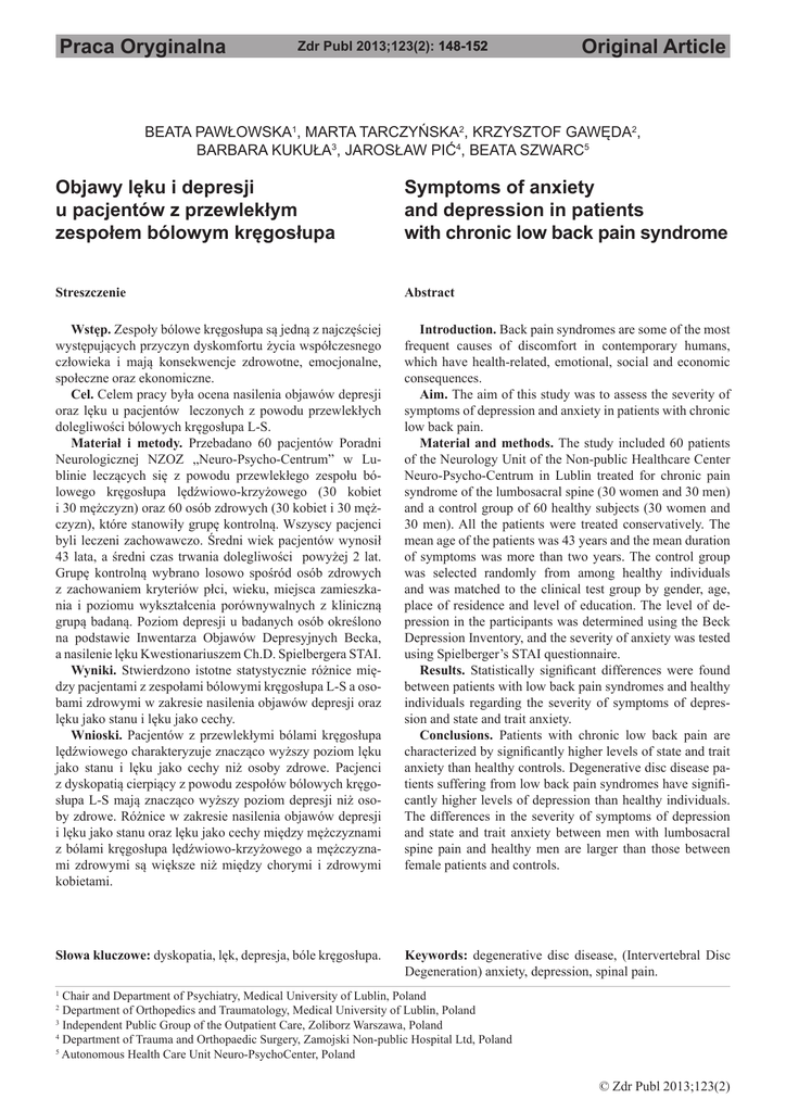 Praca Oryginalna Zdr Publ 2013;123(2): �������� ������� -152 Original Article BEATA PAWŁOWSKA1, MARTA TARCZYŃSKA2, KRZYSZTOF GAWĘDA2, BARBARA KUKUŁA3, JAROSŁAW PIĆ4, BEATA SZWARC5 Objawy lęku i depresji u pacjentów z przewlekłym zespołem bólowym kręgosłupa Symptoms of anxiety and depression in patients with chronic low back pain syndrome Streszczenie Abstract Wstęp. Zespoły bólowe kręgosłupa są jedną z najczęściej występujących przyczyn dyskomfortu życia współczesnego człowieka i mają konsekwencje zdrowotne, emocjonalne, społeczne oraz ekonomiczne. Cel. Celem pracy była ocena nasilenia objawów depresji oraz lęku u pacjentów leczonych z powodu przewlekłych dolegliwości bólowych kręgosłupa L-S. Materiał i metody. Przebadano 60 pacjentów Poradni Neurologicznej NZOZ „Neuro-Psycho-Centrum” w Lublinie leczących się z powodu przewlekłego zespołu bólowego kręgosłupa lędźwiowo-krzyżowego (30 kobiet i 30 mężczyzn) oraz 60 osób zdrowych (30 kobiet i 30 mężczyzn), które stanowiły grupę kontrolną. Wszyscy pacjenci byli leczeni zachowawczo. Średni wiek pacjentów wynosił 43 lata, a średni czas trwania dolegliwości powyżej 2 lat. Grupę kontrolną wybrano losowo spośród osób zdrowych z zachowaniem kryteriów płci, wieku, miejsca zamieszkania i poziomu wykształcenia porównywalnych z kliniczną grupą badaną. Poziom depresji u badanych osób określono na podstawie Inwentarza Objawów Depresyjnych Becka, a nasilenie lęku Kwestionariuszem Ch.D. Spielbergera STAI. Wyniki. Stwierdzono istotne statystycznie różnice między pacjentami z zespołami bólowymi kręgosłupa L-S a osobami zdrowymi w zakresie nasilenia objawów depresji oraz lęku jako stanu i lęku jako cechy. Wnioski. Pacjentów z przewlekłymi bólami kręgosłupa lędźwiowego charakteryzuje znacząco wyższy poziom lęku jako stanu i lęku jako cechy niż osoby zdrowe. Pacjenci z dyskopatią cierpiący z powodu zespołów bólowych kręgosłupa L-S mają znacząco wyższy poziom depresji niż osoby zdrowe. Różnice w zakresie nasilenia objawów depresji i lęku jako stanu oraz lęku jako cechy między mężczyznami z bólami kręgosłupa lędźwiowo-krzyżowego a mężczyznami zdrowymi są większe niż między chorymi i zdrowymi kobietami. Introduction. Back pain syndromes are some of the most frequent causes of discomfort in contemporary humans, which have health-related, emotional, social and economic consequences. Aim. The aim of this study was to assess the severity of symptoms of depression and anxiety in patients with chronic low back pain. Material and methods. The study included 60 patients of the Neurology Unit of the Non-public Healthcare Center Neuro-Psycho-Centrum in Lublin treated for chronic pain syndrome of the lumbosacral spine (30 women and 30 men) and a control group of 60 healthy subjects (30 women and 30 men). All the patients were treated conservatively. The mean age of the patients was 43 years and the mean duration of symptoms was more than two years. The control group was selected randomly from among healthy individuals and was matched to the clinical test group by gender, age, place of residence and level of education. The level of depression in the participants was determined using the Beck Depression Inventory, and the severity of anxiety was tested using Spielberger’s STAI questionnaire. Results. Statistically significant differences were found between patients with low back pain syndromes and healthy individuals regarding the severity of symptoms of depression and state and trait anxiety. Conclusions. Patients with chronic low back pain are characterized by significantly higher levels of state and trait anxiety than healthy controls. Degenerative disc disease patients suffering from low back pain syndromes have significantly higher levels of depression than healthy individuals. The differences in the severity of symptoms of depression and state and trait anxiety between men with lumbosacral spine pain and healthy men are larger than those between female patients and controls. Słowa kluczowe: dyskopatia, lęk, depresja, bóle kręgosłupa. Keywords: degenerative disc disease, (Intervertebral Disc Degeneration) anxiety, depression, spinal pain. Chair and Department of Psychiatry, Medical University of Lublin, Poland Department of Orthopedics and Traumatology, Medical University of Lublin, Poland 3 Independent Public Group of the Outpatient Care, Zoliborz Warszawa, Poland 4 Department of Trauma and Orthopaedic Surgery, Zamojski Non-public Hospital Ltd, Poland 5 Autonomous Health Care Unit Neuro-PsychoCenter, Poland 1 2 © Zdr Publ 2013;123(2) Zdr Publ 2013;123(2) INTRODUCTION Osteoarthritis is the most common cause of joint pain and increasing motor disability in patients. According to studies commissioned by US government centers and independent organizations, each year 16 million citizens of the United States suffer from this illness [1]. In the medical literature and popular-scientific publications, osteoarthritis may have a varied nomenclature [2,3]. It is referred to as joint pain syndromes, osteoarthritis, degenerative changes, degenerativeproliferative changes, arthritis, and osteoarthrosis. The lesions and symptoms may affect one joint or a group of joints. The different terms used to refer to the disease show that these broad diagnostic concepts cover processes of different etiology and course which, however, are all characterized by progressive destruction of articular structures and limitations in the natural motor function of the affected joints. Spinal pain syndromes, especially in the lumbar and cervical regions, are the most common symptoms of osteoarthritis. As with other weight-bearing joints, various etiological factors may account for the disease. They include repetitive microtrauma, overweight, abnormal mechanics of the spinal column due to developmental or acquired abnormalities of low