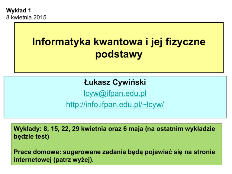 Wykład 1 8 kwietnia 2015 Informatyka kwantowa i jej fizyczne podstawy Łukasz Cywiński [email protected] http://info.ifpan.edu.pl/~lcyw/ Wykłady: 8, 15, 22, 29 kwietnia oraz 6 maja (na ostatnim wykładzie będzie test) Prace domowe: sugerowane zadania będą pojawiać się na stronie internetowej (patrz wyżej). Plan wykładów 1) Klasyczne i kwantowe komputery: czemu warto bity zastąpić kubitami. Elementy teorii złożoności obliczeniowej. Przetwarzanie informacji a fizyka. Co naprawdę mogą dać nam komputery kwantowe? 2) Od bramki jedno- i dwu-kubitowych do algorytmów. Koherentna kontrola jednego kubitu (elementy teorii elektronowego rezonansu spinowego). Bramka dwukubitowa na przykładzie bramki wymiennej. Obwody kwantowe i algorytmy. 3) Realizacja kubitów w kropkach kwantowych. Nanostruktury dla informatyki kwantowej i przykładowe kluczowe doświadczenia. 4) Czemu kubity są bardzo delikatne - dekoherencja wywołana oddziaływaniem z otoczeniem. Opcjonalnie: 5) Splątanie kwantowe - zastosowanie do komunikacji kwantowej i kwantowej korekcji błędu. Algorytmy i klasyczne komputery Algorytm – precyzyjny przepis na to, jak wykonać jakieś zadanie Algorytm Euklidesa (ok. 300 p.n.e.) na znajdowanie największego wspólnego dzielnika A oraz B. Pytanie Davida Hilberta (1928): Czy istnieje algorytm sprawdzający prawdziwość dowolnego twierdzenia matematycznego? (maszyna do dowodzenia twierdzeń) „Entscheidungsproblem” Alan Turing, Alonzo Church (około 1936): NIE! "Euclid flowchart" by Somepics - Own work. Licensed under CC BY-SA 4.0 via Wikimedia Commons http://commons.wikimedia.org/wiki/File:Euclid_flowchart.svg#/media/File:Euclid_flowchart.svg Maszyna Turinga q – stan procesora x – zapis z taśmy s = rozkaz przesunięcia głowicy (L, P, albo „stój”) Linie programu: < q,x,q’,x’,s> : jeśli q=x to zamień q na q’, x na x’, i wykonaj ruch s głowicą Teza Churcha-Turinga: Każdy problem, który może być intuicyjnie uznany za obliczalny, jest rozwiązywalny przez maszynę Turinga. (to jest tak naprawdę definicja tego, że da się wykonać jakieś zadanie algorytmiczne) Bramki logiczne „obwodowy model komputera” – sygnały 0 i 1 (bity) przesyłane pomiędzy bramkami logicznymi Bramka NOT Bramka AND Jest on równoważny maszynie Turinga – mają one takie same zdolności obliczeniowe. Złożonośc obliczeniowa Liczba bitów danych = n Czas obliczeń jest O(f(n)) gdy istnieją takie no oraz c dla których zachodzi Czas(n>n0) < cf(n) Przykłady: • Dodawanie jest O(n) • Mnożenie jest O(n2), choć ścisłe górne ograniczenie to O(nlog 3) Podstawowe rozróżnienie: • Złożoność wielomianowa: czas = O(nk) – „łatwe” • Złożoność wykładnicza: czas = O(cn) – „trudne” Złożonośc obliczeniowa Podstawowe rozróżnienie: • Złożoność wielomianowa: czas = O(nk) – „łatwe” • Złożoność wykładnicza: czas = O(cn) – „trudne” Motywacja dla powyższego rozróżnienia: Dla złożoności wykładniczej jest bardzo ostra granica pomiędzy tym co praktycznie jeszcze możliwe, a co już nie. Silniejsza wersja tezy Churcha-Turinga: Każdy "rozsądny" model obliczeń może być efektywnie zasymulowany na probabilistycznej Maszynie Turinga. Efektywnie = z co najwyżej wielomianowym wzrostem złożoności Klasyczny komputer • Informacja kodowana w bitach (0/1) • Bramki logiczne: • jednobitowe (NOT) • dwubitowe (AND, OR, NAND…) Najpopularniejsza implementacja: Technologia CMOS – transistory krzemowe Mechanika kwantowa potrzebna jest do modelowania tranzystorów i zrozumienia własności półprzewodników, ale efektywnie równoważny komputer można zbudować z elementów klasycznych (np. kasa na korbkę) Fizyczne realizacje klasycznych komputerów To działa jak system zaworów (napięcie na bramce kontroluje czy tranzystor przewodzi prąd – jeżeli tak, to może on naładować bramkę innego tranzystora Mikrofluidyka (procesy mikroprzepływowe – krople o objętości pikolitrów) http://www.microfluidicfuture.com/blog/microfluidics-a-beginners-guide Trochę zoologii Kraby z gatunku Mictyris guinotae – bardzo deterministycznie działający instynkt stadny (swarming behavior) Klasy złożoności algorytmicznej: P vs NP Klasa P (polynomial time) - problemy, które maszyna Turinga rozwiązuje w czasie wielomianowym Wiadomo, że wiele problemów jest poza P, ale bardzo trudno jest pokazać, że konkretny problem nie jest w P. Podejrzenie: rozkład liczby na czynniki pierwsze nie jest w P – najlepszy znany algorytm jest Klasa NP - problemy, których rozwiązanie maszyna Turinga może sprawdzić w czasie wielomianowym Rozkład liczby na czynniki pierwsze na pewno jest w NP – sprawdzenie czy p*q=N jest trywialne. Rozłożenie N na p i q jest za to trudne… Klasy złożoności algorytmicznej: P vs NP Wbrew temu co często można przeczytać, NP nie znaczy koniecznie „trudne”. P NP P ≠ NP ? - P na pewno zawiera się w NP. Ale czy NP jest większe? najważniejsze otwarte pytanie teorii złożoności obliczeniowej Problemy NP-zupełne - są co najmniej tak trudne jak każdy inny problem z NP, inne problemy można sprowadzić do nich („jeden problem by wszystkie rozwiązać”). Rozwiązanie w czasie wielomianowym jakiegokolwiek z nich pokaże, że P=NP! Z punktu widzenia złożoności algorytmicznej różne realizacje (klasycznego) komputera są sobie równoważne, ale… Informacja jest fizyczna Nauka o komputerach = informatyka (czyli nauka o informacji i jej przetwarzaniu). Rolf Landauer: „Informacja jest fizyczna” tzn: nie należy o informacji myśleć w sposób zupełnie abstrakcyjny, trzeba pamiętać o tym, że zawsze musi ona mieć fizyczną reprezentację! Jeden bit (kawałek) informacji: zakodowany w stanie układu bistabilnego mającego dwa rozróżnialne i stabilne stany, pomiedzy którymi możemy go przełączać. Komputer kwantowy Zamiast klasycznego bitu – kwantowy układ dwupoziomow