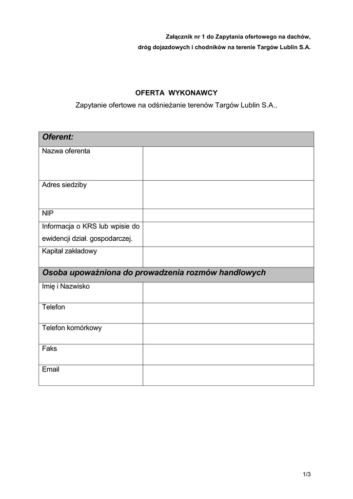 Załącznik nr 1 do Zapytania ofertowego na dachów, dróg dojazdowych i chodników na terenie Targów Lublin S.A. OFERTA WYKONAWCY Zapytanie ofertowe na odśnieżanie terenów Targów Lublin S.A., Oferent: Nazwa oferenta Adres siedziby NIP Informacja o KRS lub wpisie do ewidencji dział. gospodarczej. Kapitał zakładowy Osoba upoważniona do prowadzenia rozmów handlowych Imię i Nazwisko Telefon Telefon komórkowy Faks Email 1/3 Proponujemy: 1. Wynagrodzenie za jednorazowe usunięcie śniegu z połaci dachowych budynku A (Zadanie I) tak, aby pokrywa śnieżna nie przekraczała 5 cm oraz usuwanie worków śnieżnych w wysokości .........................zł netto za 1 m2 dachu. 2. Wynagrodzenie za jednorazowe usunięcie śniegu z połaci dachowych budynku C (Zadanie II) tak, aby pokrywa śnieżna nie przekraczała 5 oraz usuwanie worków śnieżnych w wysokości .........................zł netto za 1 m2 dachu. 3. Wynagrodzenie za jednorazowe usunięcie śniegu z ciągów pieszych i pieszojezdnych (Zadanie III) w wysokości .........................zł netto za 1 m2. 4. Wynagrodzenie za jednorazowe usunięcie śniegu ze stref pożarowych zlokalizowanych wokół obiektów targowych oraz parkingów zewnętrznych (Zadanie IV) w wysokości .........................zł netto za 1 m2. 5. Wynagrodzenie za wywiezienie śniegu poza teren Targów Lublin S.A. w wysokości .........................zł netto za 1 m3. 2/3 Zobowiązujemy się rozpocząć prace na terenie Targów Lublin S.A. po wskazanej w tabeli liczbie godzin, licząc od momentu przyjęcia zgłoszenia. Na potrzeby realizacji tych prac deklarujemy każdorazowo gotowość wymienionej w tabeli liczby osób: Rodzaj prac Proponowany czas rozpoczęcia prac Deklarowana liczba osób Usuwanie śniegu z dachów Usuwanie śniegu z terenów zewnętrznych Wywóz śniegu Informujemy, że uważamy się związani ofertą w okresie wskazanym w istotnych warunkach zamówienia. Zobowiązujemy się w przypadku wybrania naszej oferty, do zawarcia umowy z Zamawiającym na warunkach wskazanych w ofercie. ------------------------------------------------(data i podpisy upełnomocnionych przedstawicieli firmy oferenta) 3/3
