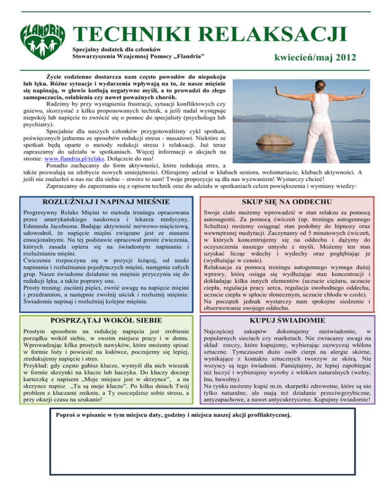 TECHNIKI RELAKSACJI Specjalny dodatek dla członków Stowarzyszenia Wzajemnej Pomocy „Flandria” kwiecień/maj 2012 Życie codzienne dostarcza nam często powodów do niepokoju lub lęku. Różne sytuacje i wydarzenia wpływają na to, że nasze mięśnie się napinają, w głowie kotłują negatywne myśli, a to prowadzi do złego samopoczucia, osłabienia czy nawet poważnych chorób. Radzimy by przy wystąpieniu frustracji, sytuacji konfliktowych czy gniewu, skorzystać z kilku proponowanych technik, a jeśli nadal występuje niepokój lub napięcie to zwrócić się o pomoc do specjalisty (psychologa lub psychiatry). Specjalnie dla naszych członków przygotowaliśmy cykl spotkań, poświęconych jednemu ze sposobów redukcji stresu - masażowi. Niektóre ze spotkań będą oparte o metody redukcji stresu i relaksacji. Już teraz zapraszamy do udziału w spotkaniach. Więcej informacji o akcjach na www.sxc.hu stronie: www.flandria.pl/relaks. Dołączcie do nas! Ponadto zachęcamy do form aktywności, które redukują stres, a także pozwalają na zdobycie nowych umiejętności. Oferujemy udział w klubach seniora, wolontariacie, klubach aktywności. A jeśli nie znalazłeś u nas nic dla siebie – stwórz to sam! Twoje propozycje są dla nas wyzwaniem! Wystarczy chcieć! Zapraszamy do zapoznania się z opisem technik oraz do udziału w spotkaniach celem powiększenia i wymiany wiedzy: ROZLUŹNIAJ I NAPINAJ MIEŚNIE SKUP SIĘ NA ODDECHU Progresywny Relaks Mięśni to metoda treningu opracowana przez amerykańskiego naukowca i lekarza medycyny, Edmunda Jacobsona. Badając aktywność nerwowo-mięściową, udowodnił, że napięcie mięśni związane jest ze stanami emocjonalnymi. Na tej podstawie opracował proste ćwiczenia, których zasada opiera się na świadomym napinaniu i rozluźnianiu mięśni. Ćwiczenia rozpoczyna się w pozycji leżącej, od nauki napinania i rozluźniania pojedynczych mięśni, następnie całych grup. Nasze świadome działanie na mięśnie przyczynia się do redukcji lęku, a także poprawy snu. Prosty trening: zaciśnij pięści, zwróć uwagę na napięcie mięśni i przedramion, a następnie zwolnij uścisk i rozluźnij mięśnie. Świadomie napinaj i rozluźniaj kolejne mięśnie. Swoje ciało możemy wprowadzić w stan relaksu za pomocą autosugestii. Za pomocą ćwiczeń (np. treningu autogennego Schultza) możemy osiągnąć stan podobny do hipnozy oraz wewnętrznej medytacji. Zaczynamy od 5 minutowych ćwiczeń, w których koncentrujemy się na oddechu i dążymy do oczyszczenia naszego umysłu z myśli. Możemy ten stan uzyskać licząc wdechy i wydechy oraz pogłębiając je (wydłużając w czasie). Relaksacja za pomocą treningu autogennego wymaga dużej wprawy, którą osiąga się wydłużając stan koncentracji i dokładając kilka innych elementów (uczucie ciężaru, uczucie ciepła, regulacja pracy serca, regulacja swobodnego oddechu, uczucie ciepła w splocie słonecznym, uczucie chłodu w czole). Na początek jednak wystarczy nam spokojne siedzenie i obserwowanie swojego oddechu. POSPRZĄTAJ WOKÓŁ SIEBIE KUPUJ ŚWIADOMIE Prostym sposobem na redukcję napięcia jest zrobienie porządku wokół siebie, w swoim miejscu pracy i w domu. Wprowadzając kilka prostych nawyków, które możemy spisać w formie listy i powiesić na lodówce, poczujemy się lepiej, zredukujemy napięcie i stres. Przykład: gdy często gubisz klucze, wymyśl dla nich wieszak w formie skrzynki na klucze lub haczyka. Do kluczy doczep karteczkę z napisem „Moje miejsce jest w skrzynce”, a na skrzynce napisz „Tu są moje klucze”. Po kilku dniach Twój problem z kluczami zniknie, a Ty oszczędzisz sobie stresu, a przy okazji czasu na szukanie! Najczęściej zakupów dokonujemy nieświadomie, w popularnych sieciach czy marketach. Nie zwracamy uwagi na skład rzeczy, które kupujemy, wybierając zazwyczaj włókna sztuczne. Tymczasem dużo osób cierpi na alergie skórne, wynikające z kontaktu sztucznych tworzyw ze skórą. Nie wszyscy są tego świadomi. Pamiętajmy, że lepiej zapobiegać niż leczyć i wybierajmy wyroby z włókien naturalnych (wełny, lnu, bawełny). Na rynku możemy kupić m.in. skarpetki zdrowotne, które są nie tylko naturalne, ale mają też działanie przeciwgrzybiczne, antyzapachowe, a nawet antycukrzycowe. Kupujmy świadomie! Poproś o wpisanie w tym miejscu daty, godziny i miejsca naszej akcji profilaktycznej.