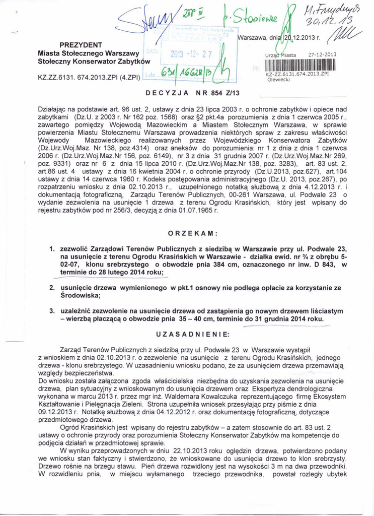PREZYDENT Miasta Stołecznego Warszawy Stołeczny Konserwator Zabytków 2fl 3 -·2- 2 7 _ I KZ.ZZ.6131. 674.2013.ZPI (4.ZPI) L dz 6~ -;ł"lR '/') DECYZJ A Urzą I iasta 27-12-2013 1111111~11111111111111111111111~11~1~111111111~1111111I , . KZ-ZZ.6131.674.2013.ZPI Olewiecki N R 854 Z/13 Działając na podstawie art. 96 ust. 2, ustawy z dnia 23 lipca 2003 r. o ochronie zabytków i opiece nad zabytkami (Dz.U. z 2003 r. Nr 162 poz. 1568) oraz §2 pktAa porozumienia z dnia 1 czerwca 2005 r., zawartego pomiędzy Wojewodą Mazowieckim a Miastem Stołecznym Warszawa, w sprawie powierzenia Miastu Stołecznemu Warszawa prowadzenia niektórych spraw z zakresu właściwości Wojewody Mazowieckiego realizowanych przez Wojewódzkiego Konserwatora Zabytków (Dz.Urz.Woj.Maz. Nr 138, pozA314) oraz aneksów do porozumienia: nr 1 z dnia z dnia 1 czerwca 2006 r. (Dz.Urz.Woj.Maz.Nr 156, poz. 6149), nr 3 z dnia 31 grudnia 2007 r. (Dz.Urz.Woj.Maz.Nr 269, poz. 9331) oraz nr 6 z dnia 15 lipca 2010 r. (Dz.Urz.Woj.Maz.Nr 138, poz. 3283), art. 83 ust. 2, art.86 ust. 4 ustawy z dnia 16 kwietnia 2004 r. o ochronie przyrody (Dz.U.2013, poz.627), art.104 ustawy z dnia 14 czerwca 1960 r. Kodeks postępowania administracyjnego (Dz.U. 2013, poz.267), po rozpatrzeniu wniosku z dnia 02.10.2013 r., uzupełnionego notatką służbową z dnia 4.12.2013 r. i dokumentacją fotograficzną, Zarządu Terenów Publicznych, 00-261 Warszawa, ul. Podwale 23 o wydanie zezwolenia na usunięcie 1 drzewa z terenu Ogrodu Krasińskich, który jest wpisany do rejestru zabytków pod nr 256/3, decyzją z dnia 01.07.1965 r. ORZEKAM: 1. zezwolić Zarządowi Terenów Publicznych z siedzibą w Warszawie przy ul. Podwale 23, na usunięcie z terenu Ogrodu Krasińskich w Warszawie - działka ewid. nr % z obrębu 502-07, klonu srebrzystego o obwodzie pnia 384 cm, oznaczonego nr inw. D 843, w terminie do 28 lutego 2014 roku; - 2. usunięcie drzewa wymienionego Środowiska; w pkt.1 osnowy nie podlega opłacie za korzystanie ze 3. uzależnić zezwolenie na usunięcie drzewa od zastąpienia go nowym drzewem liściastym - wierzbą płaczącą o obwodzie pnia 35 - 40 cm, terminie do 31 grudnia 2014 roku. u Z A S A D N I E N I E: Zarząd Terenów Publicznych z siedzibą przy ul. Podwale 23 w Warszawie wystąpił z wnioskiem z dnia 02.10.2013 r. o zezwolenie na usunięcie z terenu Ogrodu Krasińskich, jednego drzewa - klonu srebrzystego. W uzasadnieniu wniosku podano, że za usunięciem drzewa przemawiają względy bezpieczeństwa. Do wniosku została załączona zgoda właścicielska niezbędna do uzyskania zezwolenia na usunięcie drzewa, plan sytuacyjny z wnioskowanym do usunięcia drzewem oraz Ekspertyza dendrologiczna wykonana w marcu 2013 r. przez mgr inż. Waldemara Kowalczuka reprezentującego firmę Ekosystem Kształtowanie i Pielęgnacja Zieleni. Strona uzupełniła wniosek przesyłając przy piśmie z dnia 09.12.2013 r. Notatkę służbową z dnia 04.12.2012 r. oraz dokumentację fotograficzną, dotyczące przedmiotowego drzewa. Ogród Krasińskich jest wpisany do rejestru zabytków - a zatem stosownie do art. 83 ust. 2 ustawy o ochronie przyrody oraz porozumienia Stołeczny Konserwator Zabytków ma kompetencje do podjęcia działań w przedmiotowej sprawie. W wyniku przeprowadzonych w dniu 22.10.2013 roku oględzin drzewa, potwierdzono podany we wniosku stan faktyczny i stwierdzono, że wnioskowane do usunięcia drzewo to klon srebrzysty. Drzewo rośnie na brzegu stawu. Pień drzewa rozwidlony jest na wysokości 3 m na dwa przewodniki. W rozwidleniu pnia, w miejscu wyłamanego trzeciego przewodnika, powstał rozległy ubytek - próchniczy, wnikający w pień jako ubytek kominowy. Ponadto pień jest podłużnie pęknięty od rozwidlenia. W tym miejscu drewno pnia uległo przemieszczeniu. Na pniu na wysokości 2,3m, od pęknięcia podłużnego, zarysowuje się pęknięcie poprzeczne. Korona drzewa jest dość regularna, ale ma nieprawidłowo ukształtowane rozwidlenia konarów w kształcie litery V, grożące rozłamaniem. W koronie drzewa jest susz gruby. Drzewo porażone jest jemiołą. Korona drzewa poddana redukcji, skrócone zostały konary od strony stawu. Na powierzchni gruntu wokół pnia widoczne są korzenie i nabiegi korzeniowe. W trakcie prowadzonych oględzin stwierdzono że w koronie drzewa znajduje się gniazdo ptasie. W związku ze stwierdzeniem w trakcie oględzin w koronie drzewa gniazda ptasiego, Postanowieniem Nr 180 Z/13 z dnia 30.10.2013 r. postępowanie administracyjne w sprawie wnioskowanego do usunięcia klonu srebrzystego zostało zawieszone, strona została wezwana do wystąpienia do Regionalnego Dyrektora Ochrony Środowiska w Warszawie z wnioskiem o zezwolenie na zniszczenie siedliska ptaków jakim jest klon srebrzysty z gniazdem ptasim w koronie, a więc o odstępstwo od zakazów zawartych wart. 52 ust. 1 pkt.7 ustawy o ochronie przyrody. W dniu 14.11.2013 r. przy piśmie z dnia 07.11.2013 r. została przekazana Decyzja Regionalnego Dyrektora Ochrony Środowiska w Warszawie z dnia 6 listopada 2013 r., I.dz. WPN1.6401.354.2013.AB, zezwalająca Zarządowi Terenów Publicznych na niszczenie siedliska będącego obszarem rozrodu, wychowu młodych, odpoczynku sroki, poprzez usunięcie klonu srebrzystego rosnącego na terenie Ogrodu Krasińskich w Warszawie. Zezwolenie jest ważne do dnia 28 lutego 2014 r. Jednocześnie umorzono postępowanie w zakresie wydania zezwolenia na niszczenie gniazda sroki znajdującego się na klonie srebrzystym, ze względu na okres bezlęgowy. W związku z powyższym zawieszone postępowanie administracyjne Postanowieniem Nr 198 Z/13 z dnia 19.12.2013 r. zostało podjęte, bowiem uzyskanie zezwolenia z zakresu ochrony gatunkowej jest zagadnieniem wstępnym w rozumieniu art.97 §1 pktA ustawy z dnia 14 czerwca 1960 r. Kodeks postępowania administracyjnego, od którego rozstrzygnięcia, zależy rozpatrzenie sprawy i wydanie decyzji dotyczącej usunięcia przedmiotowego drzewa. Przesłana Ekspertyza